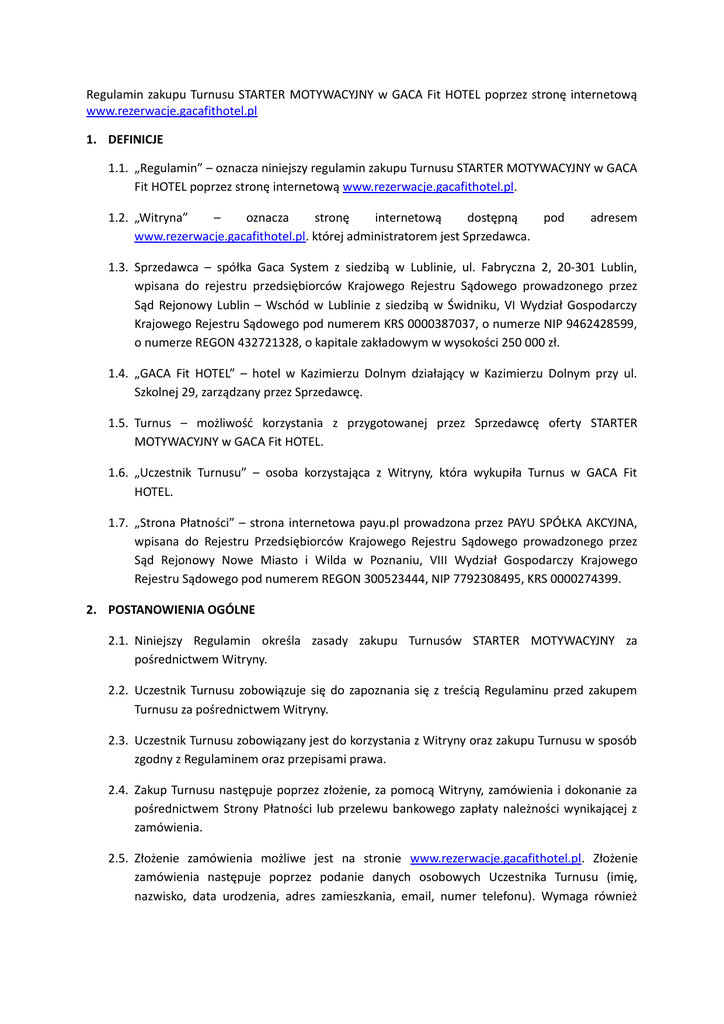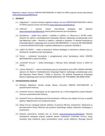 Regulamin zakupu Turnusu STARTER MOTYWACYJNY w GACA Fit HOTEL poprzez stronę internetową www.rezerwacje.gacafithotel.pl 1. DEFINICJE 1.1. „Regulamin” – oznacza niniejszy regulamin zakupu Turnusu STARTER MOTYWACYJNY w GACA Fit HOTEL poprzez stronę internetową www.rezerwacje.gacafithotel.pl. 1.2. „Witryna” – oznacza stronę internetową dostępną pod www.rezerwacje.gacafithotel.pl. której administratorem jest Sprzedawca. adresem 1.3. Sprzedawca – spółka Gaca System z siedzibą w Lublinie, ul. Fabryczna 2, 20-301 Lublin, wpisana do rejestru przedsiębiorców Krajowego Rejestru Sądowego prowadzonego przez Sąd Rejonowy Lublin – Wschód w Lublinie z siedzibą w Świdniku, VI Wydział Gospodarczy Krajowego Rejestru Sądowego pod numerem KRS 0000387037, o numerze NIP 9462428599, o numerze REGON 432721328, o kapitale zakładowym w wysokości 250 000 zł. 1.4. „GACA Fit HOTEL” – hotel w Kazimierzu Dolnym działający w Kazimierzu Dolnym przy ul. Szkolnej 29, zarządzany przez Sprzedawcę. 1.5. Turnus – możliwość korzystania z przygotowanej przez Sprzedawcę oferty STARTER MOTYWACYJNY w GACA Fit HOTEL. 1.6. „Uczestnik Turnusu” – osoba korzystająca z Witryny, która wykupiła Turnus w GACA Fit HOTEL. 1.7. „Strona Płatności” – strona internetowa payu.pl prowadzona przez PAYU SPÓŁKA AKCYJNA, wpisana do Rejestru Przedsiębiorców Krajowego Rejestru Sądowego prowadzonego przez Sąd Rejonowy Nowe Miasto i Wilda w Poznaniu, VIII Wydział Gospodarczy Krajowego Rejestru Sądowego pod numerem REGON 300523444, NIP 7792308495, KRS 0000274399. 2. POSTANOWIENIA OGÓLNE 2.1. Niniejszy Regulamin określa zasady zakupu Turnusów STARTER MOTYWACYJNY za pośrednictwem Witryny. 2.2. Uczestnik Turnusu zobowiązuje się do zapoznania się z treścią Regulaminu przed zakupem Turnusu za pośrednictwem Witryny. 2.3. Uczestnik Turnusu zobowiązany jest do korzystania z Witryny oraz zakupu Turnusu w sposób zgodny z Regulaminem oraz przepisami prawa. 2.4. Zakup Turnusu następuje poprzez złożenie, za pomocą Witryny, zamówienia i dokonanie za pośrednictwem Strony Płatności lub przelewu bankowego zapłaty należności wynikającej z zamówienia. 2.5. Złożenie zamówienia możliwe jest na stronie www.rezerwacje.gacafithotel.pl. Złożenie zamówienia następuje poprzez podanie danych osobowych Uczestnika Turnusu (imię, nazwisko, data urodzenia, adres zamieszkania, email, numer telefonu). Wymaga również złożenia oświadczenia o akceptacji Regulaminu oraz zgody na przetwarzanie danych osobowych Uczestnika Turnusu. 2.6. Uczestnik Turnusu po złożeniu zamówienia i dokonaniu płatności otrzyma potwierdzenie emailem, które zostanie wysłane na adres podany podczas składania zamówienia. 2.7. Cena Turnusu jest podana na Witrynie podczas składania zamówienia oraz w potwierdzeniu przyjęcia zamówienia. 3. PŁATNOŚĆ 3.1. Zakup Turnusu odbywa się za pomocą Strony Płatności, na którą Uczestnik Turnusu będzie przeniesiony zaraz po złożeniu zamówienia. 3.2. Płatność należy dokonać nie wcześniej niż w momencie złożenia zamówienia i nie później niż w terminie 30 minut od złożenia zamówienia lub 48 godzin w przypadku opcji płatności tradycyjnym przelewem bankowym. Później zamówienie będzie anulowane. 3.3. Dokonywana przez Uczestnika Turnusu zapłata na rzecz Sprzedawcy z wykorzystaniem Usługi Płatności Kartami Płatniczymi odbywa się za pośrednictwem systemu płatności elektronicznych PayU. 4. ZASADY ZWROTU PŁATNOŚCI 4.1. Uczestnik Turnusu ma prawo zrezygnować z Turnusu w ciągu 14 dni od daty zakupu, zachowując całą kwotę płatności, jednak Sprzedawca zastrzega sobie, że zapis nie obowiązuje w sytuacji gdy do rozpoczęcia Turnusu zostało mniej niż 30 dni. W takiej sytuacji kwota nie ulega zwrotowi. 4.2. Informacje o rezygnacji należy kierować na adres e-mail: [email protected] 4.3. Rezygnacja powinna zawierać imię, nazwisko, adres e-mail, dokładny adres Uczestnika Turnusu. 4.4. Sprzedawca ma obowiązek zwrócić pieniądze w ciągu 30 dni od daty rezygnacji z udziału w Turnusie. 5. REKLAMACJE 5.1. Wszelkie pytania i reklamacje dotyczące funkcjonowania Witryny i sprzedaży Turnusu należy nadsyłać pocztą elektroniczną na adres [email protected]. 5.2. Reklamacje mogą być przesyłane nie później niż w termie 14 dni od daty powzięcia przez Uczestnika Turnusu informacji o zdarzeniu, które było przyczyną reklamacji. 5.3. Reklamacja powinna zawierać imię, nazwisko, dokładny adres Uczestnika Turnusu jak również dokładny opis i wskazanie przyczyny reklamacji. 5.4. Sprzedawca rozpatrzy reklamacje w ciągu 14 dni od daty ich złożenia. To rozstrzygnięcie jest ostateczne. 5.5. Sprzedawca ma prawo przechowywać kopie korespondencji z Uczestnikiem Turnusu. 6. DANE OSOBOWE 6.1. Administratorem danych osobowych udostępnianych przez Uczestników Turnusu jest GACA SYSTEM Spółka z ograniczoną odpowiedzialnością, Fabryczna 2, 20-301 Lublin. 6.2. Podanie danych osobowych przez Uczestnika Turnusu ma charakter dobrowolny. 6.3. Dokonując zakupu Uczestnik Turnusu wyraża zgodę na przetwarzania swoich danych osobowych zgodnie z przepisami ustawy z dn. 29 sierpnia 1997 r. o ochronie danych osobowych (Dz. U. z 2002 r. Nr 101, poz. 926 tj. z późniejszymi zmianami). 6.4. Celem przetwarzania danych osobowych jest sprzedaż Turnusu STARTER MOTYWACYJNY. 6.5. Administrator Danych Osobowych zobowiązuje się dochowania wszelkiej staranności przy zbieraniu, przetwarzaniu oraz przechowywaniu danych osobowych Uczestników Turnusu oraz przestrzeganie zaleceń Głównego Inspektoratu Ochrony Danych Osobowych. 7. WARUNKI FORMALNE KORZYSTANIA Z TURNUSU STARTER MOTYWACYJNY 7.1. Uczestnikiem Turnusu może być wyłącznie osoba fizyczna, która: 7.1.1.Ukończyła lat 18 (osiemnaście) i nie jest ubezwłasnowolniona, choćby tylko częściowo oraz zaakceptowała Regulamin. 7.1.2.Ukończyła lat 13 (trzynaście) oraz uzysk