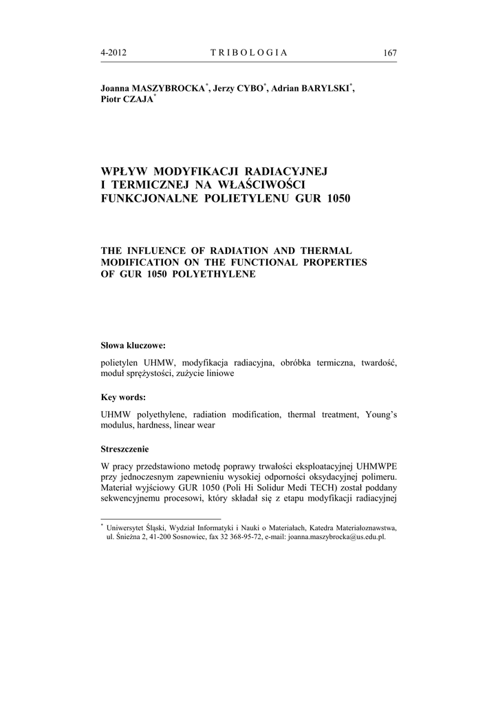 4-2012 TRIBOLOGIA 167 Joanna MASZYBROCKA *, Jerzy CYBO*, Adrian BARYLSKI*, Piotr CZAJA* WPŁYW MODYFIKACJI RADIACYJNEJ I TERMICZNEJ NA WŁAŚCIWOŚCI FUNKCJONALNE POLIETYLENU GUR 1050 THE INFLUENCE OF RADIATION AND THERMAL MODIFICATION ON THE FUNCTIONAL PROPERTIES OF GUR 1050 POLYETHYLENE Słowa kluczowe: polietylen UHMW, modyfikacja radiacyjna, obróbka termiczna, twardość, moduł sprężystości, zużycie liniowe Key words: UHMW polyethylene, radiation modification, thermal treatment, Young’s modulus, hardness, linear wear Streszczenie W pracy przedstawiono metodę poprawy trwałości eksploatacyjnej UHMWPE przy jednoczesnym zapewnieniu wysokiej odporności oksydacyjnej polimeru. Materiał wyjściowy GUR 1050 (Poli Hi Solidur Medi TECH) został poddany sekwencyjnemu procesowi, który składał się z etapu modyfikacji radiacyjnej * Uniwersytet Śląski, Wydział Informatyki i Nauki o Materiałach, Katedra Materiałoznawstwa, ul. Śnieżna 2, 41-200 Sosnowiec, fax 32 368-95-72, e-mail: [email protected]. 168 TRIBOLOGIA 4-2012 oraz obróbki termicznej. Ocenę skuteczności zastosowanej metody przeprowadzono za pomocą badań mikromechanicznych oraz testów tribologicznych na testerze T-01 (polimer/stop Vitalium). Stwierdzono nieznaczne zmniejszenie się charakterystyk mikromechanicznych (twardość i moduł Younga) wariantów poddanych sekwencyjnemu procesowi modyfikacji w stosunku do tylko napromieniowanych. Wyniki testów tribologicznych wykazują jednak wzrost odporności na zużycie w porównaniu z materiałem niemodyfikowanym i jej niezmienioną wartość w stosunku do polimeru napromieniowanego. WPROWADZENIE Korzystna kombinacja właściwości UHMWPE, tj. dobra biozgodność biologiczna, duża wytrzymałość mechaniczna, niski współczynnik tarcia sprawiają, że polimer ten jest powszechnie wykorzystywanym materiałem do produkcji elementów łożyskowych endoprotez stosowanych w całkowitej alloplastyce stawów [L. 1]. Długotrwała eksploatacja implantu polietylenowego w organizmie jest uwarunkowana przez wiele czynników, z których za najistotniejszy uważa się podatność polietylenu na zużywanie tribologiczne. Powstające w trakcie procesu tarcia produkty zużycia mogą doprowadzić do rozległej osteolizy, a w konsekwencji do obluzowania endoprotezy i konieczności zabiegu reimplantacji [L. 2]. Skuteczną metodą podwyższenia odporności na zużywanie tribologiczne jest modyfikacja polimeru UHMWPE za pomocą promieniowania gamma lub elektronowego [L. 3]. Powstające wiązania poprzeczne usztywniają łańcuch główny polimeru i korzystnie zmieniają jego właściwości: wzrasta wytrzymałość mechaniczna, odporność cieplna, twardość i odporność na zużywanie tribologiczne. Obecność tlenu podczas napromieniowania wpływa na ilościowe i jakościowe efekty procesu modyfikacji. W przypadku implantów polietylenowych procesy postradiacyjne z udziałem tlenu prowadzą do degradacji budowy i zmian właściwości mechanicznych materiału [L. 4]. Uwzględniając te fakty, niezbędnym kierunkiem badań jest taki dobór czynników kształtujących, aby w jak największym stopniu ograniczyć efekt degradacji. CEL I MATERIAŁ BADAŃ Celem pracy jest zbadanie wpływu modyfikacji radiacyjnej i termicznej na zmiany właściwości funkcjonalnych polietylenu GUR 1050 i stwierdzenie czy zastosowanie sekwencyjnej procedury kształtowania zapewnia wzrost odporności na zużycie tribologiczne przy jednoczesnym zabezpieczeniu polimeru przed oksydacją. Materiał wyjściowy stanowił polietylen GUR 1050 (Poly Hi Solidur Medi TECH), który jest powszechnie wykorzystywany do produkcji elementów łożyskowych endoprotez. Napromieniowanie materiału wiązką elektronów (energia 10 MeV) o różnej wartości dawki (0,2×26 kGy, 4×26 kGy, 6×26 kGy) umożli- 4-2012 TRIBOLOGIA 169 wiło uzyskanie wariantów o zmiennym stopniu usieciowania. Przygotowano i porównano dwie grupy próbek: poddane tylko modyfikacji radiacyjnej oraz po procesie sekwencyjnym, który składał się z etapu napromieniowania wiązką elektronów i obróbki termicznej (150°, 2 h). METODYKA BADAŃ Pomiary właściwości mikromechanicznych wykonano za pomocą urządzenia Micron-Gamma. Zastosowano wgłębnik Berkovich’a o kącie piramidy 65°, nacisk 1 N, prędkość narastania obciążenia i odciążania 1 N/min, czas wytrzymania próbki pod maksymalnym naciskiem 15 s. Twardość wyznaczono jako stosunek maksymalnej siły obciążającej wgłębnik do rzeczywistej powierzchni odcisku pod odciążeniem. Wielkość powierzchni określano na podstawie geometrii penetratora i wielkości zagłębienia. Zgodnie z metodą Olivera-Phara moduł Younga wyznaczano, uwzględniając nachylenie stycznej do początkowej części krzywej odciążenia. Zarejestrowana krzywa obciążenie-odciążenie stanowiła źródło informacji o podatności do odkształcenia materiału i pozwoliła na wyznaczenie takich parametrów jak Wt – całkowita praca indentacji, Wsp – praca odkształcenia sprężystego, Wpl – praca odkształcenia plastycznego. Wytrzymując podczas testu indentacji próbki UHMWPE pod maksymalnym obciążeniem przez t = 15 s dokonano zarazem oceny skłonności materiału do płynięcia ∆h. Do badań tribologicznych wykorzystano stanowisko trzpień–tarcza T-01 (produkcji ITeE – PIB). Jako przeciwpróbkę dla polietylenowych elementów wybrano stop Vitalium. Powierzchnię przygotowano zgodnie z wytycznymi normy ISO 7206-2. Badania przeprowadzono na drodze tarcia 68 km przy prędkości poślizgu 0,1374 m/s. Zastosowano obciążenie węzła tarcia o wartości 2 MPa. Temperaturę otoczenia utrzymywano w zakresie 21±1°C, a wilgotność 50±5%. Jako medium smarujące użyto wody destylowanej; w każdym eksperymencie dozowano taką samą ilość cieczy (0,6 ml/min) o temperaturze 36±2°C w układzie zamkniętym. Zużycie liniowe Zl na testerze T-01 określano jako różnicę przemieszczenia czujnika po teście