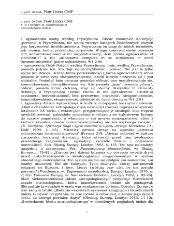 o. prof. Dr hab. Piotr Liszka CMF o. prof. Dr hab. Piotr Liszka CMF 51-611 Wrocław, ul. Wieniawskiego 38 www.piotr-liszka.strefa.pl + agnoscentia osoby według Pryscyliusza. Chcąc zrozumieć koncepcję „persona” u Pryscyliusza, nie wolno tworzyć kategorii filozoficznych obcych jego horyzontowi intelektualnemu. Przywiązuje on wagę do takich terminów, jak: nomen, forma, praesentia, corporatio. W jego koncepcji osoby przeważa sem komunikowalności a nie indywidualizacji, sem „forma agnoscentiae et visibilitatis” a nie „substantia completa in se subsistens et alteri incommunivabilis” (jak w scholastyce). W1.2 80 + agnoscentia Osób Bożych według Pryscyliusza. Imię, według Pryscyliusza, posiada jedynie ten, kto daje się identyfikować i poznać. Nie jest to tylko wyraz lub dźwięk. Jest to forma poznawalności („forma agnoscentiae”), która posiada w sobie rysy charakterystyczne, dzięki którym uobecnia się i jest widzialne. Posiadać imię oznacza posiadać oblicze, moc manifestowania się, komunikowania, identyfikowania się. Kto posiada „imię”, posiada „obraz”, oblicze, posiada formę cielesną, staje się obecny. Wszystkie te elementy definiują u Pryscyliusza Osobę. Osoba to nie ograniczenie, struktura zamknięta, indywidualność, lecz przeciwnie, otwartość, nieograniczoność, komunikowalność, ekspresyjność, zdolność do bycia obecnym. W1.2 81 + Agnostycy Ateizm wprowadzają w kulturę europejską bocznymi drzwiami. „Błąd o charakterze antropologicznym naznaczył również największe systemy totalitarne XX wieku i zwiastujące, przygotowujące je ideologie. Idąc tropem myśli [Mirewicza], należałoby powiedzieć o cofnięciu się kulturowym Europy do czasów pogańskich, a właściwie o sui generis neopogaństwie, które z kultura sakralną czasów przedchrześcijańskiej nie ma większego związku” /S. Szczyrba, Afirmacja Boga i życie moralne w ujęciu Jerzego Mirewicza TJ , Łódź 1994, s. 65/. Mirewicz zwraca uwagę na zjawisko „ateizmu wchodzącego bocznymi drzwiami” (Przypis 218: „Ateizm wchodził w kulturę europejską bocznymi drzwiami, które otwierali przed nim zwolennicy przesadnego racjonalizmu, agnostycy, czciciele Natury i oczywiście materialiści”. Zob. Słudzy Europy, Londyn 1985, s. 155. Ten spis należałoby uzupełnić o sceptycyzm. Por. Rozczarowany chrześcijanin, w: Słudzy Europy…, 76-82). „Europa jest dzisiaj kuszona do otwarcia swoich drzwi przed antychrześcijańskim światopoglądem zorganizowanym w system absolutnego materializmu. Ten system nie boi się czołgów ani samolotów, ani bomby atomowej. Boi się świętych. Tych dawnych, którzy patronowali rodzącej się Europie, i tacy, którzy stróżują przy niej, by nie została porwana” (Przedmowa, w: Zapomniani współtwórcy Europy, Londyn 1976, s. 7; Por. Porwanie Europy, w: Nad rzekami Babilonu, Londyn 1982, s. 92-95). Stałe niebezpieczeństwo „błędu antropologicznego” podyktuje Mirewiczowi zasadę metodologiczną, którą konsekwentnie będzie się posługiwał. Sformułuje ją wyraźnie w eseju wprowadzającym do tomu Obrońcy Europy, o tym samym tytule: „Badania wszystkich systemów religijnych i filozoficznych należy zaczynać od pytania, co one mówią o człowieku, o sensie jego życia i ocelu, do którego powinien dążyć” (Obrońcy Europy, Londyn 1983, 11-12). „Stwierdzenie ‘błędu antropologicznego’ w określonych poglądach będzie dla 1 o. prof. Dr hab. Piotr Liszka CMF [Mirewicza] momentem diagnostycznym upoważniającym do sądu o załamaniu się wiary w prawdziwego Boga u wyznawców danych poglądów. Jego pierwszym symptomem jest zawsze rozejście się myśli wyznawców określonych poglądów z prawdą o człowieku, i konsekwentnie – z prawdą o Bogu, zawartą w Biblii” /Tamże, s. 66. + Agnostycy nieliczni wieku XVII traktowani jako jedyni przedstawiciele myślicieli wieku XVII przez Koyrégo A. „Według Koyrégo rewolucja astronomiczna wpłynęła na umysły Zachodu w dwojaki sposób. Po pierwsze rozpad zamkniętego układu geocentrycznego zdawał się pozbawić ludzkość kosmosu. Jakkolwiek strata ta była niewyobrażalnie wielka, przez wieki pojmowali to jedynie nieliczni (między innymi Pascal) i „nawet jej prawdziwe przesłanie było zwykle mylnie oceniane i rozumiane” /A. Koyré, Galileo and Plato, „Journal of the History of Ideas”, 1943, Vol. 4, s. 404/. Jak wielu historyków idei naukowych, również Koyré przeoczył to, co oczywiste, a mianowicie, że w Myślach to wolnomyśliciel, a nie chrześcijanin jest przerażony wiecznym milczeniem nieskończonych przestrzeni. Dla chrześcijanina nie stanowiła problemu konstatacja, że „cały wszechświat widzialny jest tylko niedostrzegalnym atomem w wielkim łonie natury” /termin natura obejmuje też aniołów!/, i że natura jest „nieskończoną sferą, której środek jest wszędzie, obwód nigdzie”. […] Krótko mówiąc, rozpad geocentrycznego kosmosu oznaczał kryzys jedynie dla tych, którzy postawili zwyczajną fizykę ponad zdrową metafizykę, Koyré wyraźnie pominął każdego, kto nie należał do nielicznych niewierzących i agnostyków wieku siedemnastego, gdy określał drugi rodzaj wpływu, jaki rozpad geocentrycznego kosmosu wywarł na umysł Zachodu; nieskończony wszechświat nie potrzebował Stwórcy. Jak ujął to Koyré, nieskończoność wszechświata dowiodła, że Bóg lub raczej Bóg chrześcijański, był „Dieu fainéant”, Bogiem „nie robiącym niczego”, który mógł po cichu odejść ze sceny jako zbyteczny dla wszechświata” /S. L. Jaki, Bóg i kosmologowie, przeł. P. Bołtuć, Racibórz-Wrocław 1996, s. 5/. „tego rodzaju interpretacja rewolucji astronomicznej mogła współgrać ze światopoglądem Koyrégo – panteizmem zmieszanym z agnostycyzmem – lecz nie z danymi historycznymi. Około roku 1700, a nawet później niewielu sugerowało nieskończony wszechświat; był