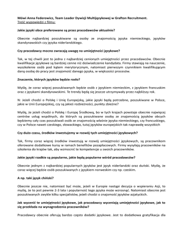 Mówi Anna Federowicz, Team Leader Dywizji Multijęzykowej w Grafton Recruitment. Treść wypowiedzi z filmu: Jakie języki obce preferowane są przez pracodawców aktualnie? Obecnie najbardziej poszukiwane są osoby ze znajomością języka niemieckiego, języków skandynawskich czy języka niderlandzkiego. Czy pracodawcy mocno zwracają uwagę na umiejętności językowe? Tak, w tej chwili jest to jedna z najbardziej cenionych umiejętności przez pracodawców. Obecnie kwalifikacje językowe są bardziej cenne niż doświadczenie kandydata. Firmy stawiają na nauczenie, wyszkolenie osób pod kątem merytorycznym, natomiast pierwszym czynnikiem kwalifikującym daną osobę do pracy jest znajomość danego języka, w większości procesów. Znaczenie, których języków będzie rosło? Myślę, że coraz więcej poszukiwanych będzie osób z językiem niemieckim, z językiem francuskim oraz z językami skandynawskimi. Te trendy będą się jeszcze utrzymywały przez najbliższy rok. N: Jeżeli chodzi o Polskę i Unię Europejską, jakie języki będą potrzebne, poszukiwane w Polsce, jakie w Unii Europejskiej, czy są jakieś rozbieżności, punkty zbieżne? Myślę, że jeżeli chodzi o Polskę i Europę Środkową, bo w tych krajach powstaje obecnie najwięcej centrów usług wspólnych, do których są poszukiwane osoby ze znajomością języków obcych będziemy cały czas poszukiwali osób ze znajomością właśnie języka niemieckiego, czy francuskiego, czy w Polsce nawet czeskiego, słowackiego, tutaj języków europejskich tak naprawdę wszystkich Czy dużo czasu, środków inwestujemy w rozwój tych umiejętności językowych? Tak, firmy coraz więcej środków inwestują w rozwój umiejętności językowych, są pracownikom oferowane dodatkowe kursy w ramach benefitów pozapłacowych. Firmy wysyłają pracowników na szkolenia do krajów tak, aby wzmocnić te kompetencje u swoich pracowników. Jakie języki rzadkie są popularne, jakie będą popularne wśród pracodawców? Obecnie jednym z najbardziej popularnych języków jest język niderlandzki oraz duński. Myślę, że coraz więcej będzie osób poszukiwanych z językiem norweskim czy np. czeskim. A np. taki język chiński? Obecnie jeszcze nie, natomiast być może, jeżeli w Europie nastąpi decyzja o wspieraniu Azji, to myślę, że to jest pewnie 2-3 lata i popularność tego języka może wzrosnąć. Natomiast obecnie jest poszukiwanych zwykle kilku specjalistów, jeżeli chodzi o znajomość języków azjatyckich. Jak wycenić te umiejętności językowe, jak pracodawcy wyceniają umiejętności językowe, jak to się przekłada na wynagrodzenia pracowników? Pracodawcy obecnie oferują bardzo często dodatki językowe. Jest to dodatkowa gratyfikacja dla danego pracownika za posiadaną umiejętność językową. Często może ona stanowić nawet pół wynagrodzenia podstawowego, jeżeli rozmawiamy o kandydatach, którzy znają rzadkie języki obce, to taka możliwość występuje. W przypadku, jakich języków występują takie zależności? Myślę, że najczęściej ta gratyfikacja dotyczy języka czeskiego, holenderskiego, norweskiego, szwedzkiego, czy fińskiego.