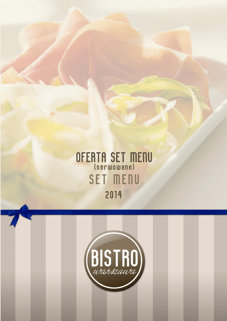 Bistro Warszawa • Rynek Starego Miasta • ul. Jezuicka 1/3 • 00-281 Warszawa tel.: +48 (22) 635 37 69 • mob.: +48 501 438 007 • www.bistrowarszawa.pl Menu 1 Przystawki / Starters Zupa chlebowa z borowikami Bread soup with boletus mushrooms lub/or Tradycyjny żurek podany z jajkiem i kielbasą Traditional sour cream soup served with eggs and sausage Dodatki / Sides Kosz pieczywa podany z masłem czosnkowym Basket of bread with garlic butter Dania Główne/ Mains Pierś z kurczaka z kremowym sosem kaparowym, pieczonym ziemniakiem & zieloną sałatą Chicken breast with creamy capers sauce, baked potato & green salad lub/or Penne z półgęskiem, cukinią i rukolą Penne with smoked goose, zucchini & rocket salad Desery/Sweet Things Domowa szarlotka na ciepło Warm apple pie Kawa i Herbata Coffee & tea Woda niegazowana, soki owocowe Still water, fruit juices 65,- od osoby / 65,-per person incl. VAT Bistro Warszawa • Rynek Starego Miasta • ul. Jezuicka 1/3 • 00-281 Warszawa tel.: +48 (22) 635 37 69 • mob.: +48 501 438 007 • www.bistrowarszawa.pl Menu 2 Przystawki podane w stół / Starters served buffet style Carpaccio z buraków z liśdmi sałat i kozim serem Beetroot Carpaccio served with mixed leave salad & goat cheese Krucha i delikatna wątróbka na roszponce Crisp & delicate Liver served on a bed of lamb’s lettuce Sałata rzymska z kurczakiem, czerwoną cebulką i dressingiem musztardowym Romaine lettuce with chicken breast, red onion & mustard dressing Dodatki / Sides Kosz pieczywa podany z masłem czosnkowym Basket of bread with garlic butter Dania Główne / Main Course Wstążki makaronu z krewetkami na białym winie z czosnkiem Pasta ribbons with tiger prawns on white wine sauce and garlic Lub/or Domowe pierogi faszerowane gęsiną z sosem malinowym Homemade dumplings stuffed with goose confit with raspberry sauce Deser / Dessert Ciastko czekoladowe z duszą pomaraoczową i lodami waniliowymi Chocolate cake with an orange soul & vanilla ice cream Kawa i Herbata Coffee & Tea Woda niegazowana, soki owocowe Still water, fruit juices 78,- od osoby / 84,-per person Bistro Warszawa • Rynek Starego Miasta • ul. Jezuicka 1/3 • 00-281 Warszawa tel.: +48 (22) 635 37 69 • mob.: +48 501 438 007 • www.bistrowarszawa.pl Menu 3 Przystawki podane w stół / Starters served buffet style Carpaccio z buraków z liśdmi sałat i kozim serem Beetroot Carpaccio served with mixed leave salad & goat cheese Sałata rzymska z kurczakiem, czerwoną cebulką i dressingiem musztardowym Romaine lettuce with chicken breast, red onion & mustard dressing Śledź marynowany ze świeżymi ziołami w oliwie truflowej. Tradycyjnie smaczny Marinated herring with fresh herbs in truffle oil. Traditionally tasty Krucha i delikatna wątróbka na roszponce Crisp & delicate Liver served on a bed of lamb’s lettuce Dodatki / Sides Kosz pieczywa podany z masłem czosnkowym Basket of bread with garlic butter Dania Główne / Main Course Dorsz na maślanych pomidorach podany z młodą marchewką i truflowymi ziemniakami puree Cod fish served on butter tomatoes, with young carrots & tuffled potato puree Lub/or Zrazy wołowe w sosie własnym podawane z buraczkami i domowymi kopytkami Beef Rolls in own sauce served with beets and homemade dumplings Deser / Dessert Sernik puszysty na migdałowej poduszce Cheesecake on an almond pillow Kawa i Herbata Coffee & tea Woda niegazowana, soki owocowe Still water, fruit juices 89,- od osoby/ 89,-per person Bistro Warszawa • Rynek Starego Miasta • ul. Jezuicka 1/3 • 00-281 Warszawa tel.: +48 (22) 635 37 69 • mob.: +48 501 438 007 • www.bistrowarszawa.pl Menu 4 Przystawki podane w stół / Starters served buffet style Tatar z kaparami, anchois, musztardą Dijon i jajem Steak tartar with capers, anchovies, Dijon mustard & egg Płaty cielęciny na sosie kaparowo-tuoczykowym Veal Carpaccio served on caper & tuna sauce Carpaccio z buraków z liśdmi sałat i kozim serem Beetroot Carpaccio served with mixed leave salad & goat cheese Sałata rzymska z kurczakiem, czerwoną cebulką i dressingiem musztardowym Romaine lettuce with chicken breast, red onion & mustard dressing Dodatki / Sides Kosz pieczywa podany z masłem czosnkowym Basket of bread with garlic butter Dania Główne / Main Course Łosoś w delikatnym sosie oliwno-paprykowym podany z pieczonym ziemniakiem i szpinakiem Salmon in smooth oil & pepper sauce, served with baked potatoes and spinach Lub/or Polędwiczka wieprzowa podany na sosie estragonowym z młodą marchewką, pieczoną cebulką młodymi ziemniakami Grilled pork loin served on tarragon sauce, Young carrots, baked onions & Young potatoes Patery Deserów / Dessert Selection Sernik na migdałowej poduszce Cheesecake on szarlotka an almond pillow Domowa szarlotka na ciepło Warm apple pie Ciastko czekoladowe z duszą pomaraoczową Chocolate cake with an orange soul Kawa i Herbata Coffee & tea Woda niegazowana, soki owocowe Still water, fruit juices 108,- od osoby/ 108,-per person Bistro Warszawa • Rynek Starego Miasta • ul. Jezuicka 1/3 • 00-281 Warszawa tel.: +48 (22) 635 37 69 • mob.: +48 501 438 007 • www.bistrowarszawa.pl Menu 5 Przystawki podane w stół / Starters served buffet style Tatar z kaparami, anchois, musztardą Dijon i jajem Steak tartar with capers, anchovies, Dijon mustard & egg Krewetki w sosie z białego wina, masła i czosnku Prawns in butter, white wine & garlic sauce Płaty łososia z sosem musztardowo-miodowym Salmon served with honey-mustard sauce Płaty cielęciny na sosie kaparowo-tuoczykowym Veal Carpaccio served on caper & tuna sauce Carpaccio z buraków z liśdmi sałat i kozim serem Beetroot Carpaccio served with mixed leave salad & goat cheese Dodatki / Sides Kosz pieczywa podany z masłem czosnkowym Basket of bread with garlic butter Dania Główne / Main Course Halibut pieczony w sosie koperkowo-cytrynowym podany na mieszanych liściach sałat z kopytkami Halibut in dill and lemon served on mix