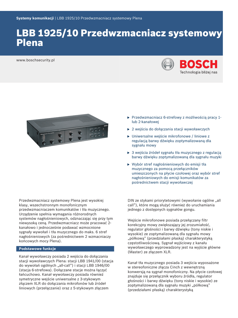 Systemy komunikacji | LBB 1925/10 Przedwzmacniacz systemowy Plena LBB 1925/10 Przedwzmacniacz systemowy Plena www.boschsecurity.pl Przedwzmacniacz systemowy Plena jest wysokiej klasy, wszechstronnym monofonicznym przedwzmacniaczem komunikatów i tła muzycznego. Urządzenie spełnia wymagania różnorodnych systemów nagłośnieniowych, odznaczając się przy tym niewysoką ceną. Przedwzmacniacz może pracować 2kanałowo i jednocześnie podawać wzmocnione sygnały wywołań i tła muzycznego do maks. 6 stref nagłośnieniowych (za pośrednictwem 2 wzmacniaczy końcowych mocy Plena). Podstawowe funkcje Kanał wywoławczy posiada 2 wejścia do dołączania stacji wywoławczych Plena: stacji LBB 1941/00 (stacja do wywołań ogólnych „all-call”) i stacji LBB 1946/00 (stacja 6-strefowa). Dołączane stacje można łączyć łańcuchowo. Kanał wywoławczy posiada również symetryczne wejście uniwersalne z 3-stykowym złączem XLR do dołączania mikrofonów lub źródeł liniowych (przełączanie) oraz z 5-stykowym złączem u Przedwzmacniacz 6-strefowy z możliwością pracy 1lub 2-kanałowej u 2 wejścia do dołączania stacji wywoławczych u Uniwersalne wejście mikrofonowe / liniowe z regulacją barwy dźwięku zoptymalizowaną dla sygnału mowy u 3 wejścia źródeł sygnału tła muzycznego z regulacją barwy dźwięku zoptymalizowaną dla sygnału muzyki u Wybór stref nagłośnieniowych do emisji tła muzycznego za pomocą przełączników umieszczonych na płycie czołowej oraz wybór stref nagłośnieniowych do emisji komunikatów za pośrednictwem stacji wywoławczej DIN ze stykami priorytetowymi (wywołanie ogólne „all call”), które mogą służyć również do uruchamiania jednego z dostępnych sygnałów gongu. Wejście mikrofonowe posiada przełączany filtr korekcyjny mowy zwiększający jej zrozumiałość, regulator głośności i barwy dźwięku (tony niskie i wysokie) ze zoptymalizowaną dla sygnału mowy „półkową” (przedziałami płaską) charakterystyką częstotliwościową. Sygnał wyjściowy z kanału wywoławczego wyprowadzony jest na wyjście główne (Master) ze złączem XLR. Kanał tła muzycznego posiada 3 wejścia wyposażone w stereofoniczne złącza Cinch z wewnętrzną konwersją na sygnał monofoniczny. Na płycie czołowej znajduje się przełącznik wyboru źródła, regulator głośności i barwy dźwięku (tony niskie i wysokie) ze zoptymalizowaną dla sygnału muzyki „półkową” (przedziałami płaską) charakterystyką 2 | LBB 1925/10 Przedwzmacniacz systemowy Plena częstotliwościową. Kanał tła muzycznego posiada wyjście bezpośrednie ze złączem XLR wykorzystywane przy pracy 2-kanałowej. Sygnał tła jest ponadto doprowadzany z najniższym priorytetem do wyjścia głównego (Master), które wykorzystuje się przy pracy 1-kanałowej. Sygnał tła muzycznego może być kierowany do wybranych stref nagłośnieniowych za pośrednictwem przełączników wyboru stref umieszczonych na płycie czołowej urządzenia. Wyjście 24 VDC z zabezpieczeniem przeciwprzeciążeniowym podaje zasilanie do zewnętrznych przekaźników, eliminując często potrzebę zewnętrznego zasilania. Wejście specjalne (Emergency) / telefoniczne wyposażone w obwód detekcji sygnału wejściowego (VOX) i zaprogramowane nastawy głośności posiadają najwyższy priorytet dla wszystkich stref nagłośnieniowych. Dwa wejścia wyzwalające (styki zwierne) służą do sterowania emisją sygnałów alarmowych lub sygnału czasu w wybranych strefach nagłośnieniowych. Do wyboru jest cały zestaw gongów. Ponadto przedwzmacniacz wyposażony jest w wejście audio z komputera PC oraz złącze sterujące RS-232. Umożliwia to programowe sterowanie konfiguracją lub automatyczną dystrybucję komunikatów we współpracy z Managerem komunikatów cyfrowych Plena LBB 1965/00. Przedwzmacniacz wyposażony jest w 6-poziomowy system priorytetowy, warunkujący emisję tła muzycznego oraz sygnałów z mikrofonów, stacji wywoławczych, wejść wyzwalających i wejścia alarmowego. Urządzenie wyposażone jest w zestaw przekaźników do dołączania do wyjść wzmacniaczy mocy odpowiednich grup głośników w zależności od wybranych stref nagłośnieniowych. Każda ze stref posiada 3-stanową regulację na płycie czołowej, dzięki której można ją wyłączyć, przełączyć na kanał wywoławczy lub kanał tła muzycznego. Wejście mikrofonu do wywołań ogólnych oraz wywołanie alarmowe mają priorytet nad wyborem stacji wywoławczej w kanale wywołań. Każda strefa posiada niezależne priorytety obejścia z zaprogramowanymi poziomami głośności. Zapewnia to właściwy poziom głośności komunikatu, niezależny od lokalnych nastaw głośności np. w przypadku emisji tła muzycznego. Obsługiwane są zarówno 3-, jak i 4przewodowe systemy obejścia lokalnej regulacji głośności. Uaktywnienie obejścia powoduje załączenie dodatkowych styków beznapięciowych (Call Active) wykorzystywanych do celów sterowania i monitorowania. Główny kanał wyjściowy lub jeden z kanałów wejściowych może być monitorowany poprzez słuchawki dołączone do gniazda słuchawkowego i / lub wskaźnik wysterowania VU z diodami LED. Elementy sterujące i wskaźniki Płyta czołowa • • • • • • • • • Miernik wysterowania VU z diodami LED Wskaźnik LED zasilania Wskaźnik LED aktywnego wywołania 3 pokrętła regulacji głośności wejść mikrofon / linia, poziomu tonów wysokich i niskich 3 pokrętła regulacji głośności tła muzycznego, poziomu tonów wysokich i niskich Pokrętło wyboru źródła tła muzycznego 6 przycisków wyboru stref 6 wskaźników LED stanu Włącznik/wyłącznik Płyta tylna • Regulacja głośności wejścia alarmowego (EMG) • Przełącznik napięcia sieci zasilającej Połączenia z innymi urządzeniami Płyta czołowa • Gniazdo słuchawkowe Płyta tylna • • • • • • • • • • • • • • • •