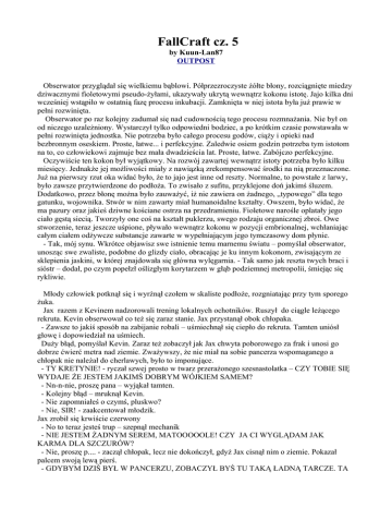 FallCraft cz. 5 by Kuun-Lan87 OUTPOST Obserwator przyglądał się wielkiemu bąblowi. Półprzezroczyste żółte błony, rozciągnięte miedzy dziwacznymi fioletowymi pseudo-żyłami, ukazywały ukrytą wewnątrz kokonu istotę. Jajo kilka dni wcześniej wstąpiło w ostatnią fazę procesu inkubacji. Zamknięta w niej istota była już prawie w pełni rozwinięta. Obserwator po raz kolejny zadumał się nad cudownością tego procesu rozmnażania. Nie był on od niczego uzależniony. Wystarczył tylko odpowiedni bodziec, a po krótkim czasie powstawała w pełni rozwinięta jednostka. Nie potrzeba było całego procesu godów, ciąży i opieki nad bezbronnym oseskiem. Proste, łatwe... i perfekcyjne. Zaledwie osiem godzin potrzeba tym istotom na to, co człowiekowi zajmuje bez mała dwadzieścia lat. Proste, łatwe. Zabójczo perfekcyjne. Oczywiście ten kokon był wyjątkowy. Na rozwój zawartej wewnątrz istoty potrzeba było kilku miesięcy. Jednakże jej możliwości miały z nawiązką zrekompensować środki na nią przeznaczone. Już na pierwszy rzut oka widać było, że to jajo jest inne od reszty. Normalne, to powstałe z larwy, było zawsze przytwierdzone do podłoża. To zwisało z sufitu, przyklejone doń jakimś śluzem. Dodatkowo, przez błonę można było zauważyć, iż nie zawiera on żadnego, „typowego” dla tego gatunku, wojownika. Stwór w nim zawarty miał humanoidalne kształty. Owszem, było widać, że ma pazury oraz jakieś dziwne kościane ostrza na przedramieniu. Fioletowe narośle oplatały jego ciało gęstą siecią. Tworzyły one coś na kształt puklerzu, swego rodzaju organicznej zbroi. Owe stworzenie, teraz jeszcze uśpione, pływało wewnątrz kokonu w pozycji embrionalnej, wchłaniając całym ciałem odżywcze substancje zawarte w wypełniającym jego tymczasowy dom płynie. - Tak, mój synu. Wkrótce objawisz swe istnienie temu marnemu światu – pomyślał obserwator, unosząc swe zwaliste, podobne do glizdy ciało, obracając je ku innym kokonom, zwisającym ze sklepienia jaskini, w której znajdowała się główna wylęgarnia. - Tak samo jak reszta twych braci i sióstr – dodał, po czym popełzł oślizgłym korytarzem w głąb podziemnej metropolii, śmiejąc się rykliwie. Młody człowiek potknął się i wyrżnął czołem w skaliste podłoże, rozgniatając przy tym sporego żuka. Jax razem z Kevinem nadzorowali trening lokalnych ochotników. Ruszył do ciągle leżącego rekruta. Kevin obserwował co też się zaraz stanie. Jax przystanął obok chłopaka. - Zawsze to jakiś sposób na zabijanie robali – uśmiechnął się ciepło do rekruta. Tamten uniósł głowę i dopowiedział na uśmiech. Duży błąd, pomyślał Kevin. Zaraz też zobaczył jak Jax chwyta poborowego za frak i unosi go dobrze ćwierć metra nad ziemie. Zważywszy, że nie miał na sobie pancerza wspomaganego a chłopak nie należał do cherlawych, było to imponujące. - TY KRETYNIE! - ryczał szwej prosto w twarz przerażonego szesnastolatka – CZY TOBIE SIĘ WYDAJE ŻE JESTEM JAKIMŚ DOBRYM WÓJKIEM SAMEM? - Nn-n-nie, proszę pana – wyjąkał tamten. - Kolejny błąd – mruknął Kevin. - Nie zapomniałeś o czymś, pluskwo? - Nie, SIR! - zaakcentował młodzik. Jax zrobił się krwiście czerwony - No to teraz jesteś trup – szepnął mechanik - NIE JESTEM ŻADNYM SEREM, MATOOOOOLE! CZY JA CI WYGLĄDAM JAK KARMA DLA SZCZURÓW? - Nie, proszę p.... - zaczął chłopak, lecz nie dokończył, gdyż Jax cisnął nim o ziemie. Pokazał palcem swoją lewą pierś. - GDYBYM DZIŚ BYŁ W PANCERZU, ZOBACZYŁ BYŚ TU TAKĄ ŁADNĄ TARCZE. TA TARCZA OZNACZA RANGĘ RYCERZA! TAK MASZ SIE DO MNIE ZWRACAĆ: PER PANIE RYCERZU! ZROZUMIAŁEŚ, TY PSIE LUDZKIEGO MIANA NIE WARTY?! - TAK JEST, PANIE RYCERZU! - wrzasnął chłopak, niemal nieprzytomny ze strachu. Jax chciał jeszcze coś powiedzieć, ale kątem oka dostrzegł zbliżającego się Njangu. - Zjeżdżaj – syknął. Chłopak zebrał się na czworaki i popędził do reszty rekrutów, ćwiczących pod okiem Repty. Jax tymczasem wrócił do Kevina i obaj ruszyli do Njangu. - Na starość robisz się stetryczały – zaśmiał się mechanik. - Tym gnojkom się przyda. I tak to nic w porównaniu z tym co zrobią z nimi te robale. - Co nie znaczy że masz ich zabić jeszcze w trakcie treningu – rzucił Njangu, słysząc końcówkę tej rozmowy. - Ilu mamy chętnych? - Około siedemdziesięciu, – raportował Jax – ale odrzuciłem czterdziestu. Pomylili nas z pomocą społeczną. Njangu uniósł pytająco brew. - Większość z nich ważyła mniej niż pancerz metalowy. Myśleli że od razu dostaną żarcie. Dwóch mało mnie nie pobiło gdy chciałem ich odprawić. - Nie sądziłem że Avellone daje ciała jako burmistrz. - mruknął Njangu. - Te cherlaki nie są tutejsze – rzekł znudzony głos. - To ścierwo z sąsiednich wioch. Obejrzeli się ku nowemu rozmówcy. Obok nich stał mężczyzna w metalowym pancerzu i okularach na nosie. Uśmiechał się głupkowato. - Nie wiedziałem że znasz tutejszy folklor, Christian – zaśmiał się Jax. - Często bywam tutaj na przepustkach – zaśmiał się pilot. - Zawsze uważałem, że jesteś takim typem co wybierze burdel w Quincy – zarechotał Kevin. - A to czemu? - zaciekawił się Njangu. Christian w dość mocno przerysowany sposób udał zawstydzenie. - Mam słabość do tamtejszych guilc. Cała czwórka ryknęła. - A co tak w ogóle cie sprowadza? - zapytał rzeczowo Kevin. - Przywiozłem wam jednego E.P.A1 oraz trzy E.P.A2 . Po za tym mam sprawdzić wasze postępy i przynoszę ciekawe ploteczki. - To przejdźmy do mojego gabinetu – zasugerował Lord Paladyn. Idąc, pokazywał Christianowi czego dokonali. Mieszkańców ściągnięto to centralnej części miasta. Obejmowało ono ratusz oraz budynki w promieniu półtora kilometra od niego. Miało to ułatwić obronę. Strefa obronna obejmował plac ratusza i kilkanaście budynków rozsianych wew