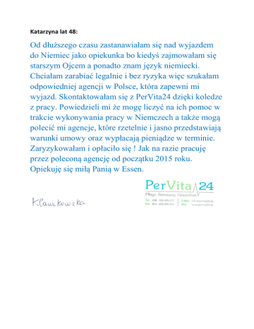 Katarzyna lat 48: Od dłuższego czasu zastanawiałam się nad wyjazdem do Niemiec jako opiekunka bo kiedyś zajmowałam się starszym Ojcem a ponadto znam język niemiecki. Chciałam zarabiać legalnie i bez ryzyka więc szukałam odpowiedniej agencji w Polsce, która zapewni mi wyjazd. Skontaktowałam się z PerVita24 dzięki koledze z pracy. Powiedzieli mi że mogę liczyć na ich pomoc w trakcie wykonywania pracy w Niemczech a także mogą polecić mi agencje, które rzetelnie i jasno przedstawiają warunki umowy oraz wypłacają pieniądze w terminie. Zaryzykowałam i opłaciło się ! Jak na razie pracuję przez poleconą agencję od początku 2015 roku. Opiekuję się miłą Panią w Essen.