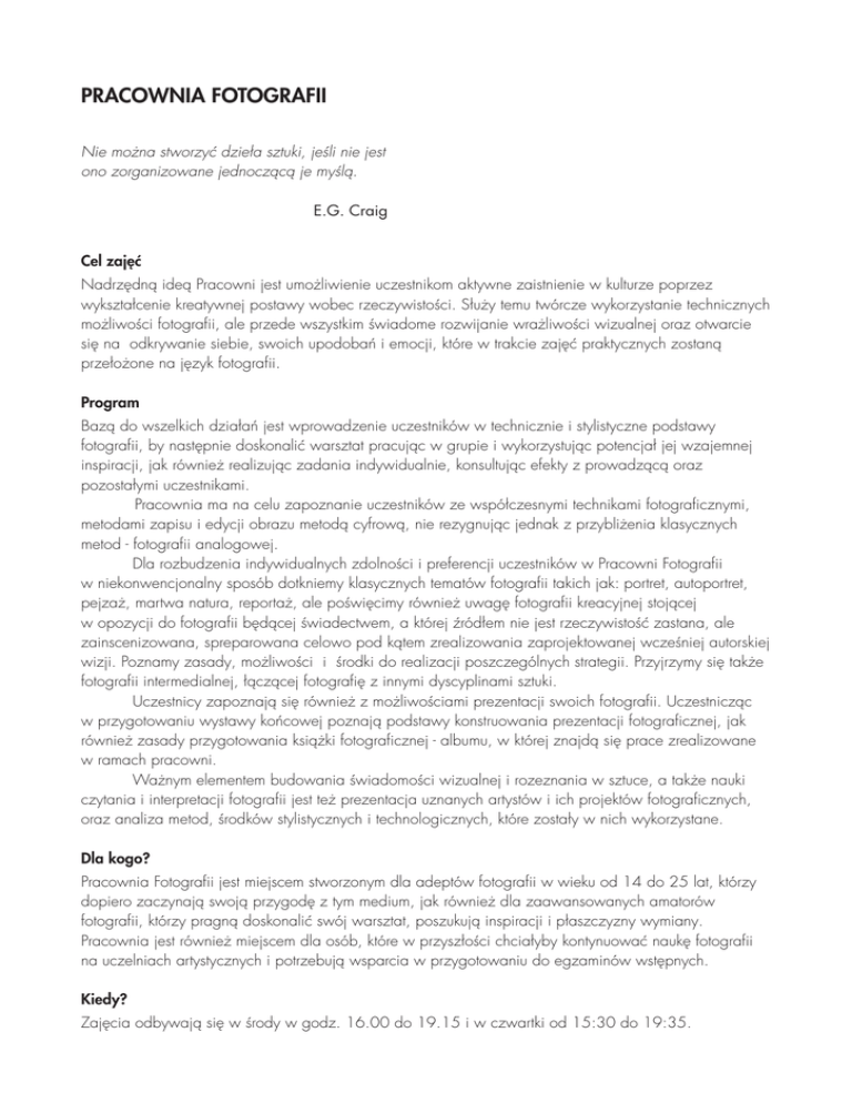 PRACOWNIA FOTOGRAFII Nie można stworzyć dzieła sztuki, jeśli nie jest ono zorganizowane jednoczącą je myślą. E.G. Craig Cel zajęć Nadrzędną ideą Pracowni jest umożliwienie uczestnikom aktywne zaistnienie w kulturze poprzez wykształcenie kreatywnej postawy wobec rzeczywistości. Służy temu twórcze wykorzystanie technicznych możliwości fotografii, ale przede wszystkim świadome rozwijanie wrażliwości wizualnej oraz otwarcie się na odkrywanie siebie, swoich upodobań i emocji, które w trakcie zajęć praktycznych zostaną przełożone na język fotografii. Program Bazą do wszelkich działań jest wprowadzenie uczestników w technicznie i stylistyczne podstawy fotografii, by następnie doskonalić warsztat pracując w grupie i wykorzystując potencjał jej wzajemnej inspiracji, jak również realizując zadania indywidualnie, konsultując efekty z prowadzącą oraz pozostałymi uczestnikami. Pracownia ma na celu zapoznanie uczestników ze współczesnymi technikami fotograficznymi, metodami zapisu i edycji obrazu metodą cyfrową, nie rezygnując jednak z przybliżenia klasycznych metod - fotografii analogowej. Dla rozbudzenia indywidualnych zdolności i preferencji uczestników w Pracowni Fotografii w niekonwencjonalny sposób dotkniemy klasycznych tematów fotografii takich jak: portret, autoportret, pejzaż, martwa natura, reportaż, ale poświęcimy również uwagę fotografii kreacyjnej stojącej w opozycji do fotografii będącej świadectwem, a której źródłem nie jest rzeczywistość zastana, ale zainscenizowana, spreparowana celowo pod kątem zrealizowania zaprojektowanej wcześniej autorskiej wizji. Poznamy zasady, możliwości i środki do realizacji poszczególnych strategii. Przyjrzymy się także fotografii intermedialnej, łączącej fotografię z innymi dyscyplinami sztuki. Uczestnicy zapoznają się również z możliwościami prezentacji swoich fotografii. Uczestnicząc w przygotowaniu wystawy końcowej poznają podstawy konstruowania prezentacji fotograficznej, jak również zasady przygotowania książki fotograficznej - albumu, w której znajdą się prace zrealizowane w ramach pracowni. Ważnym elementem budowania świadomości wizualnej i rozeznania w sztuce, a także nauki czytania i interpretacji fotografii jest też prezentacja uznanych artystów i ich projektów fotograficznych, oraz analiza metod, środków stylistycznych i technologicznych, które zostały w nich wykorzystane. Dla kogo? Pracownia Fotografii jest miejscem stworzonym dla adeptów fotografii w wieku od 14 do 25 lat, którzy dopiero zaczynają swoją przygodę z tym medium, jak również dla zaawansowanych amatorów fotografii, którzy pragną doskonalić swój warsztat, poszukują inspiracji i płaszczyzny wymiany. Pracownia jest również miejscem dla osób, które w przyszłości chciałyby kontynuować naukę fotografii na uczelniach artystycznych i potrzebują wsparcia w przygotowaniu do egzaminów wstępnych. Kiedy? Zajęcia odbywają się w środy w godz. 16.00 do 19.15 i w czwartki od 15:30 do 19:35. Prowadząca: mgr Dorota Sitnik Urodzona w 1981 roku we Wrocławiu. Absolwentka Wyższego Studium Fotografii AFA we Wrocławiu oraz Instytutu Sztuk Pięknych Uniwersytetu Zielonogórskiego, na którym uzyskała tytuł magistra sztuki w specjalności Fotografia. Oprócz fotografii zajmuje się rysunkiem oraz projektowaniem graficznym. Brała udział w licznych wystawach w kraju i za granicą. Wybrane wystawy fotograficzne: 2015 Alegorie tożsamości – Dyptyki. Muzeum Współczesne Wrocław – wystawa indywidualna 2015 Alegorie tożsamości – Dyptyki. Galeria FF, Łódź – wystawa indywidualna 2014 Idea materia. Inny potencjał fotografii. Domek Romański, Wrocław 2013 In transit. 5 Europejski Miesiąc Fotografii w Berlinie, Niemcy 2012 Kształt teraźniejszości, Muzeum Współczesne Wrocław 2010 Granice tożsamości, Galeria Trafacka, Nitra, Słowacja – wystawa indywidualna 2010 Granice tożsamości, Tekovske museum, Levice, Słowacja – wystawa indywidualna 2009 Granice tożsamości, Galeria Obok ZPAF, Warszawa – wystawa indywidualna 2007 Targi Młodej Sztuki MOST, Youngs Galery/ Infogaleria, Warszawa 2007 Kobieta wolna, kobieta niezależna, Fabryka Trzciny, Warszawa 2007 Wiesbadener Fototage, Fotogalerie Lichtbild, Wiesbaden, Niemcy – wystawa indywidualna (laureatka konkursu na fotografię tytułową festiwalu) 2006 Świat w dłoniach, The Cinnamon, Warszawa Laureatka nagród, między innymi: - nagroda dla najbardziej obiecującego młodego artysty 2007 roku na Targach Młodej Sztuki MOST w Warszawie - pierwsze miejsce w konkursie fotograficznym Wodne skojarzenia organizowanym przez firmę Aquanet S.A. pod patronatem epoznan.pl, Poznań, 2012 - Grand Prix 13 edycji konkursu na autoportret ogłoszonego przez magazyn „Pokochaj Fotografię”, 2013. - Grand prix II Ogólnopolskiego Konkursu Fotograficznego „Portret” organizowanego przez centrum szkoleniowe „To dobry kurs”, Warszawa, 2015 - II nagroda w XIX Biennale Fotografii Górskiej, Jelenia Góra, 2016