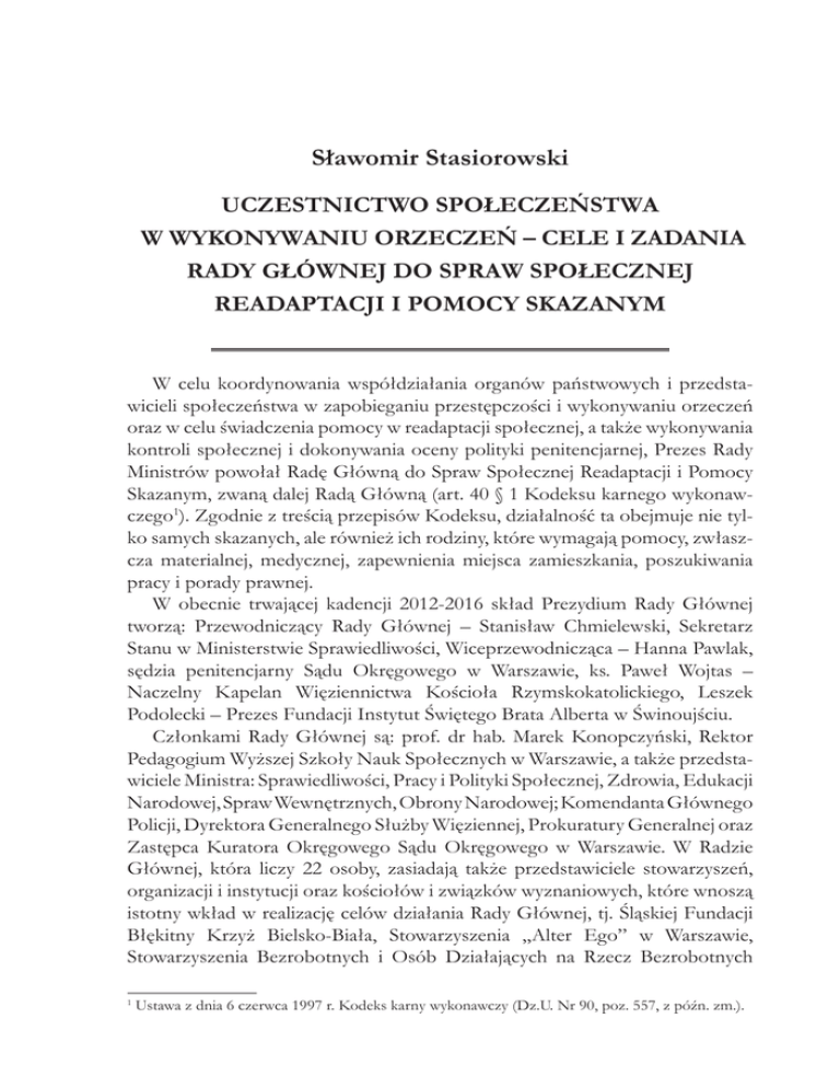 Sławomir Stasiorowski UCZESTNICTWO SPOŁECZEŃSTWA W WYKONYWANIU ORZECZEŃ – CELE I ZADANIA RADY GŁÓWNEJ DO SPRAW SPOŁECZNEJ READAPTACJI I POMOCY SKAZANYM W celu koordynowania współdziałania organów państwowych i przedstawicieli społeczeństwa w zapobieganiu przestępczości i wykonywaniu orzeczeń oraz w celu świadczenia pomocy w readaptacji społecznej, a także wykonywania kontroli społecznej i dokonywania oceny polityki penitencjarnej, Prezes Rady Ministrów powołał Radę Główną do Spraw Społecznej Readaptacji i Pomocy Skazanym, zwaną dalej Radą Główną (art. 40 § 1 Kodeksu karnego wykonawczego1). Zgodnie z treścią przepisów Kodeksu, działalność ta obejmuje nie tylko samych skazanych, ale również ich rodziny, które wymagają pomocy, zwłaszcza materialnej, medycznej, zapewnienia miejsca zamieszkania, poszukiwania pracy i porady prawnej. W obecnie trwającej kadencji 2012-2016 skład Prezydium Rady Głównej tworzą: Przewodniczący Rady Głównej – Stanisław Chmielewski, Sekretarz Stanu w Ministerstwie Sprawiedliwości, Wiceprzewodnicząca – Hanna Pawlak, sędzia penitencjarny Sądu Okręgowego w Warszawie, ks. Paweł Wojtas – Naczelny Kapelan Więziennictwa Kościoła Rzymskokatolickiego, Leszek Podolecki – Prezes Fundacji Instytut Świętego Brata Alberta w Świnoujściu. Członkami Rady Głównej są: prof. dr hab. Marek Konopczyński, Rektor Pedagogium Wyższej Szkoły Nauk Społecznych w Warszawie, a także przedstawiciele Ministra: Sprawiedliwości, Pracy i Polityki Społecznej, Zdrowia, Edukacji Narodowej, Spraw Wewnętrznych, Obrony Narodowej; Komendanta Głównego Policji, Dyrektora Generalnego Służby Więziennej, Prokuratury Generalnej oraz Zastępca Kuratora Okręgowego Sądu Okręgowego w Warszawie. W Radzie Głównej, która liczy 22 osoby, zasiadają także przedstawiciele stowarzyszeń, organizacji i instytucji oraz kościołów i związków wyznaniowych, które wnoszą istotny wkład w realizację celów działania Rady Głównej, tj. Śląskiej Fundacji Błękitny Krzyż Bielsko-Biała, Stowarzyszenia „Alter Ego” w Warszawie, Stowarzyszenia Bezrobotnych i Osób Działających na Rzecz Bezrobotnych 1 Ustawa z dnia 6 czerwca 1997 r. Kodeks karny wykonawczy (Dz.U. Nr 90, poz. 557, z późn. zm.). 144 Sławomir Stasiorowski „Wszyscy Razem – In Corpore”, Stowarzyszenia POSTIS w Lublinie, Bractwa Młodzieży Prawosławnej oraz Kościołów: Rzymskokatolickiego, EwangelickoAugsburskiego i Autokefalicznego Kościoła Prawosławnego. Stosownie do potrzeb, wojewoda może powołać terenowe rady do spraw społecznej readaptacji i pomocy skazanym. W ich składzie mogą zasiadać zarówno przedstawiciele organów odpowiedniego szczebla, na tej samej zasadzie jak w Radzie Głównej, a także organów samorządu terytorialnego oraz przedstawiciele: wojewody, prezesa sądu okręgowego, prokuratora okręgowego, kierowników komórek organizacyjnych urzędu wojewódzkiego właściwych do spraw zdrowia oraz zabezpieczenia społecznego, dyrektora wojewódzkiego urzędu pracy, kuratora oświaty, komendanta wojewódzkiego Policji, szefów regionalnych sztabów wojskowych, dyrektorów zakładów karnych i aresztów śledczych. Ponadto do uczestnictwa w pracach rad terenowych można zapraszać przedstawicieli innych podmiotów, tj. stowarzyszeń, fundacji, organizacji i instytucji, których celem działania jest realizacja zadań związanych z pomocą w społecznej readaptacji skazanym oraz kościołów i innych związków wyznaniowych, związków zawodowych i samorządu zawodowego, przedstawicieli nauki oraz osób godnych zaufania. Przewodniczącym rady terenowej jest prezes właściwego sądu okręgowego. Obecnie rady terenowe powołane są w województwach: ▪▪ kujawsko-pomorskim, dla obszaru Sądu Okręgowego w Bydgoszczy, Toruniu i Włocławku, ▪▪ lubuskim: jedna utworzona dla właściwości miejscowej okręgu Sądu Okręgowego w Zielonej Górze, druga – dla obszaru okręgu Sądu Okręgowego w Gorzowie Wielkopolskim, ▪▪ małopolskim, obejmująca Sądy Okręgowe w Krakowie, Tarnowie oraz Nowym Sączu, ▪▪ podlaskim, dla właściwości miejscowej Sądu Okręgowego w Białymstoku, Łomży i Suwałkach, ▪▪ warmińsko-mazurskim, dla właściwości miejscowej Sądu Okręgowego w Olsztynie i Elblągu, ▪▪ podkarpackim, dla właściwości miejscowej Sądu Okręgowego w Rzeszowie, Krośnie, Tarnobrzegu i Przemyślu, ▪▪ wielkopolskim, dla właściwości miejscowej Sądu Okręgowego w Poznaniu, ▪▪ zachodniopomorskim, jedna właściwa dla obszaru okręgu Sądu Okręgowego w Koszalinie, druga dla właściwości miejscowej Sądu Okręgowego w Szczecinie. Zgodnie z treścią rozporządzenia Prezesa Rady Ministrów2, Rada Główna i rady terenowe działają w szczególności przez: Rozporządzenie Prezesa Rady Ministrów z dnia 21 sierpnia 1998 roku w sprawie szczegółowych zasad i trybu powoływania oraz działania Rady Głównej do Spraw Społecznej Readaptacji i Pomocy Skazanym, a także rad terenowych do spraw społecznej readaptacji i pomocy skazanym (Dz.U. Nr 113, poz. 723, z późn. zm.). 2 Uczestnictwo społeczeństwa w wykonywaniu orzeczeń – cele i zadania Rady Głównej... 145 1) organizowanie, inicjowanie i wspieranie przedsięwzięć służących zapobieganiu przestępczości i społecznej readaptacji skazanych, 2) opiniowanie działalności organów rządowych i przedstawicieli społeczeństwa, podejmowanej w zakresie zapobiegania przestępczości, wykonywania orzeczeń i readaptacji społecznej skazanych oraz udzielania pomocy skazanym i ich rodzinom, 3) koordynowanie działalności stowarzyszeń, fundacji i instytucji oraz kościołów i związków wyznaniowych, jak również osób godnych zaufania, podejmowanej w zakresie wykonywania kar, środków karnych, zabezpieczających i zapobiegawczych, 4) podejmowanie, organizowanie i koordynowanie społecznej kontroli nad wykonywaniem kar, środków karn