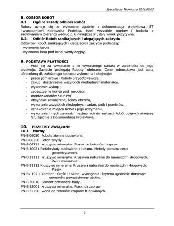Specyfikacja Techniczna IS.00.00.02 8. ODBIÓR ROBÓT Ogólne zasady odbioru Robót 8.1. Roboty uznaje się za wykonane zgodnie z dokumentacją projektową, ST i wymaganiami Kierownika Projektu, jeŜeli wszystkie pomiary i badania z zachowaniem tolerancji według p. 6 niniejszej ST, dały wyniki pozytywne. 8.2. Odbiór Robót zanikających i ulegających zakryciu Odbiorowi Robót zanikających i ulegających zakryciu podlegają: - wykonane koryto, - wykonana ława pod kanał wentylacyjny, 9. PODSTAWA PŁATNOŚCI Płaci się za wykonanie 1 m wykonanego kanału w zaleŜności od jego przekroju. Zapłacie podlegają Roboty odebrane. Cena jednostkowa jest ceną uśrednioną dla załoŜonego sposobu wykonania i obejmuje: - prace pomiarowe i Roboty przygotowawcze, - zakup i dostarczenie wszystkich niezbędnych materiałów, - wykonanie wykopu, - zagęszczenie koryta pod rurociagi, - montaŜ kanałów z rur PVC - obsypanie zewnętrznej ściany obrzeŜa, - wykonanie wszystkich niezbędnych badań, prób i pomiarów, - oznakowanie miejsca Robót i jego utrzymanie, - wykonanie innych czynności niezbędnych do realizacji Robót objętych niniejszą ST, zgodnie z Dokumentacją Projektową. 10. PRZEPISY ZWIĄZANE 10.1. Normy PN-B-06050 Roboty ziemne budowlane. PN-B-06250 Beton zwykły. PN-B-06711 Kruszywo mineralne. Piasek do betonów i zapraw. PN-B-10021 Prefabrykaty budowlane z betonu. Metody pomiaru cech geometrycznych. PN-B-11111 Kruszywo mineralne. Kruszywa naturalne do nawierzchni drogowych. świr i mieszanka. PN-B-11113 Kruszywo mineralne. Kruszywa naturalne do nawierzchni drogowych. Piasek PN-EN 197-1 Cement - Część 1: Skład, wymagania i kryteria zgodności dotyczące cementów powszechnego uŜytku. PN-B-30010 Cement portlandzki biały. PN-B-12001 Kruszywa mineralne. Piaski do zapraw. PN-B-32250 Woda do betonów i zapraw budowlanych. 9 Specyfikacja Techniczna IS.00.00.02 Szczególne ustalenia dotyczące wyŜej wymienionych prac zawiera norma PN83/8836-02 (Przewody podziemne. Roboty ziemne. Wymagania i badania przy odbiorze) w powiązaniu z PN-86/B-02480 (Grunty budowlane. Podział nazwy, symbole i określenia). 5.5. MontaŜ kratek wentylacyjnych. Kratki wentylacyjne naleŜy montować na wylocie kanałów wentylacyjnych poprzez włoŜenie kratki do kanału i zamocowanie jej w kanale zgdnie z instrukcją montaŜu procucenta 6. KONTROLA JAKOŚCI ROBÓT . 6.1. Badania przed przystąpieniem do Robót Przed przystąpieniem do Robót Wykonawca powinien wykonać badania materiałów przeznaczonych do ustawienia betonowych obrzeŜy chodnikowych i przedstawić wyniki tych badań Kierownikowi Projektu do akceptacji. Sprawdzenie wyglądu zewnętrznego naleŜy przeprowadzić na podstawie oględzin elementu przez pomiar i policzenie uszkodzeń występujących na powierzchniach i krawędziach elementu, zgodnie z wymaganiami tablicy 3. Pomiary długości i głębokości uszkodzeń naleŜy wykonać za pomocą przymiaru stalowego lub suwmiarki z dokładnością do 1 mm, zgodnie z ustaleniami PN-B10021. Sprawdzenie kształtu i wymiarów elementów naleŜy przeprowadzić z dokładnością do 1 mm przy uŜyciu suwmiarki oraz przymiaru stalowego lub taśmy, zgodnie z wymaganiami tablicy 1 i 2. Sprawdzenie kątów prostych w naroŜach elementów wykonuje się przez przyłoŜenie kątownika do badanego naroŜa i zmierzenia odchyłek z dokładnością do 1 mm. Badania pozostałych materiałów powinny obejmować wszystkie właściwości określone w normach podanych dla odpowiednich materiałów w niniejszej ST, p. 2. 6.2. Badania w czasie Robót W czasie Robót naleŜy sprawdzać wykonanie: a) ustawieniakanału wentylacyjnego , przy dopuszczalnych odchyleniach: - linii obrzeŜa w planie, które moŜe wynosić ± 2 cm na kaŜde 100 m długości obrzeŜa, - niwelety górnej płaszczyzny, które moŜe wynosić ± 1 cm na kaŜde 100 m długości obrzeŜa, - wypełnienia spoin, sprawdzane co 10 metrów, które powinno wykazywać całkowite wypełnienie badanej spoiny na pełną głębokość. 7. OBMIAR ROBÓT Jednostką obmiarową jest m (metr) ustawionego kanału wentylacyjnego wraz z wykonaniem wszystkich Robót towarzyszących opisanych w niniejszej ST. 8 Specyfikacja Techniczna IS.00.00.02 5.3. MontaŜ rurociągów MontaŜ rurociągu z PVC wykonywać przy temp. zewnętrznych w granicach +5 do +300C. Rury naleŜy układać od najniŜszego punktu kanału w kierunku przeciwnym do spadku - zawsze kielichami w górę kanału, a bosym końcem w dół. W celu wykonania połączenia wciskowego naleŜy do zagłębienia kielicha o sprawdzonej czystości włoŜyć uszczelkę, sprawdzając czy ściśle przylega do wgłębienia w kielichu. Bosy koniec rury po sfazowaniu, oznaczeniu granicy wprowadzeniu i nasmarowaniu roztworem mydła lub talkiem wciska się do kielicha urządzeniem montaŜowym. Po wykonaniu złącza konieczna jest kontrola oznaczonej granicy wcisku w celu zapewnienia swobodnej pracy rurociągu podczas eksploatacji. Sposób montaŜu przewodów powinien zapewniać utrzymanie kierunków i spadków zgodnie z dokumentacją techniczną. Opuszczanie i układanie przewodu na dnie wykopu moŜe się odbywać dopiero po przygotowaniu podłoŜa. Przed opuszczeniem rur do wykopu, naleŜy sprawdzić ich stan techniczny - nie mogą mieć uszkodzeń oraz zabezpieczyć przed zanieczyszczeniem za pomocą tymczasowych korków, np. handlowych ze styropianu. Przewód po ułoŜeniu powinien ściśle przylegać do podłoŜa na całej swej długości w co najmniej 1/4 jego obwodu. Złącza powinny pozostać odsłonięte, z pozostawieniem wystarczająco wolnej przestrzeni po obu stronach połączenia, do czasu przeprowadzenia próby na szczelność przewodu. Po zakończeniu montaŜu zasypać piaskiem rurę do połowy średnicy (za wyj. złącza) i zagęścić piasek. Następnie naleŜy: -zbadać prostoliniowość ułoŜenia rurociągu, -zbadać zgodność z projektowanym spadkiem podłuŜnym, -sprawdzić droŜność. 5.4. 4.3. Prób