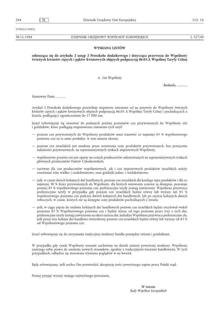 244 PL Dziennik Urzędowy Unii Europejskiej 11/t. 16 DZIENNIK URZĘDOWY WSPÓLNOT EUROPEJSKICH L 327/49 21988A1130(03) 30.11.1988 WYMIANA LISTÓW odnosząca się do artykułu 2 ustęp 2 Protokołu dodatkowego i dotycząca przywozu do Wspólnoty świeżych kwiatów ciętych i pąków kwiatowych objętych podpozycją 06.03.A Wspólnej Taryfy Celnej A. List Wspólnoty Bruksela, ……… Szanowny Panie………, Artykuł 2 Protokołu dodatkowego przewiduje stopniowe zniesienie ceł na przywóz do Wspólnoty świeżych kwiatów ciętych i pąków kwiatowych objętych podpozycją 06.03 A Wspólnej Taryfy Celnej i pochodzących z Izraela, podlegający ograniczeniom do 17 000 ton. Izrael zobowiązuje się stosować do podanych poniżej poziomów cen przywożonych do Wspólnoty róż i goździków, które podlegają stopniowemu zniesieniu tych taryf: — poziom cen przywożonych do Wspólnoty produktów musi stanowić co najmniej 85 % wspólnotowego poziomu cen na te same produkty, w tym samym okresie, — poziom cen izraelskich jest ustalony przez notowania ceny produktów przywożonych, bez potrącenia należności przywozowych, na reprezentatywnych rynkach importowych Wspólnoty, — wspólnotowy poziom cen jest oparty na cenach producentów odnotowanych na reprezentatywnych rynkach głównych producentów Państw Członkowskich, — zarówno dla cen producentów wspólnotowych, jak i cen importowych produktów izraelskich należy rozróżniać róże wielko- i małokwiatowe, oraz goździki jedno- i wielokwiatowe, — jeśli, w czasie dwóch kolejnych dni handlowych, poziom cen izraelskich dla każdego typu produktów i dla co najmniej 30 % ilości przywożonych do Wspólnoty, dla których notowania cenowe są dostępne, pozostaje poniżej 85 % wspólnotowego poziomu cen, preferencyjne taryfy zostają zawieszone. Wspólnota przywraca preferencyjne taryfy w przypadku gdy poziom cen izraelskich będzie równy lub wyższy niż 85 % wspólnotowego poziomu cen podczas dwóch kolejnych dni handlowych, lub po sześciu kolejnych dniach roboczych, w czasie, których nie są dostępne ceny produktów pochodzących z Izraela, — jeśli, w ciągu pięciu do siedmiu kolejnych dni handlowych poziom cen izraelskich będzie oscylował wokół poziomu 85 % Wspólnotowego poziomu cen i będzie niższy od tego poziomu przez trzy z tych dni, preferencyjne taryfy zostają zawieszone na okres sześciu dni. Jednakże Wspólnota przywraca preferencyjne cła, jeśli przez trzy kolejne dni handlowe stwierdzony poziom cen izraelskich będzie równy lub wyższy od 85 % od Wspólnotowego poziomu cen. Izrael zobowiązuje się do utrzymania tradycyjnej struktury handlu pomiędzy różami i goździkami. W przypadku gdy rynek Wspólnoty zostanie zachwiany na skutek zmiany powyższej struktury, Wspólnota zastrzega sobie prawo do ustalenia nowych stosunków, zgodnie z tradycyjnymi wzorami handlowymi. W tych przypadkach, odbędzie się stosowana wymiana poglądów w tej kwestii. Będę zobowiązany, jeśli zechce Pan potwierdzić akceptację treści powyższego zapisu przez Pański rząd. Proszę przyjąć wyrazy mojego najwyższego poważania. W imieniu Rady Wspólnot Europejskich 11/t. 16 PL Dziennik Urzędowy Unii Europejskiej 245 B. List Rządu Izraela Szanowny Panie………, Niniejszym mam zaszczyt potwierdzić otrzymanie Pańskiego listu w dniu dzisiejszym, o następującej treści: „Artykuł 2 Protokołu dodatkowego przewiduje stopniowe zniesienie ceł na przywóz do Wspólnoty świeżych kwiatów ciętych i pąków kwiatowych objętych podpozycją 06.03 A Wspólnej Taryfy Celnej i pochodzących z Izraela, podlegający ograniczeniom do 17 000 ton. Izrael zobowiązuje się stosować do podanych poniżej poziomów cen przywożonych do Wspólnoty róż i goździków, które podlegają stopniowemu zniesieniu tych taryf: — poziom cen przywożonych do Wspólnoty produktów musi stanowić co najmniej 85 % wspólnotowego poziomu cen na te same produkty, w tym samym okresie, — poziom cen izraelskich jest ustalony przez notowania ceny produktów przywożonych, bez potrącenia należności przywozowych, na reprezentatywnych rynkach importowych Wspólnoty, — wspólnotowy poziom cen jest oparty na cenach producentów odnotowanych na reprezentatywnych rynkach głównych producentów Państw Członkowskich, — zarówno dla cen producentów wspólnotowych, jak i cen importowych produktów izraelskich należy rozróżniać róże wielko- i małokwiatowe, oraz goździki jedno- i wielokwiatowe, — jeśli, w czasie dwóch kolejnych dni handlowych, poziom cen izraelskich dla każdego typu produktów i dla co najmniej 30 % ilości przywożonych do Wspólnoty, dla których notowania cenowe są dostępne, pozostaje poniżej 85 % wspólnotowego poziomu cen, preferencyjne taryfy zostają zawieszone. Wspólnota przywraca preferencyjne taryfy w przypadku gdy poziom cen izraelskich będzie równy lub wyższy niż 85 % wspólnotowego poziomu cen podczas dwóch kolejnych dni handlowych, lub po sześciu kolejnych dniach roboczych, w czasie których nie są dostępne ceny produktów pochodzących z Izraela, — jeśli, w ciągu pięciu do siedmiu kolejnych dni handlowych poziom cen izraelskich będzie oscylował wokół poziomu 85 % Wspólnotowego poziomu cen i będzie niższy od tego poziomu przez trzy z tych dni, preferencyjne taryfy zostają zawieszone na okres sześciu dni. Jednakże Wspólnota przywraca preferencyjne cła, jeśli przez trzy kolejne dni handlowe stwierdzony poziom cen izraelskich będzie równy lub wyższy od 85 % od Wspólnotowego poziomu cen. Izrael zobowiązuje się do utrzymania tradycyjnej struktury handlu pomiędzy różami i goździkami. W przypadku gdy rynek Wspólnoty zostanie zachwiany na skutek zmiany powyższej struktury, Wspólnota zastrzega sobie prawo do ustalenia nowych stosunków, zgodnie z tradycyjnymi wzorami handlowymi. W tych przypadkach, odbędzie się stosowana wymiana poglądów w tej kwestii. B