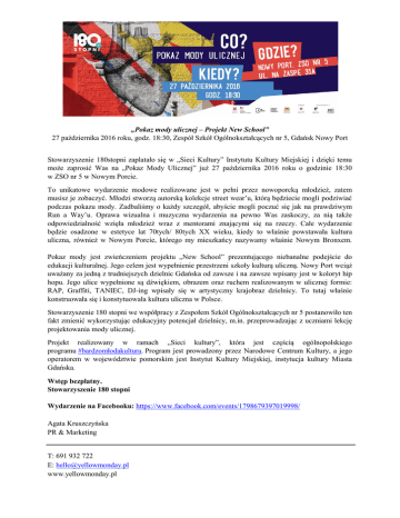 „Pokaz mody ulicznej – Projekt New School” 27 października 2016 roku, godz. 18:30, Zespół Szkół Ogólnokształcących nr 5, Gdańsk Nowy Port Stowarzyszenie 180stopni zaplatało się w „Sieci Kultury” Instytutu Kultury Miejskiej i dzięki temu może zaprosić Was na „Pokaz Mody Ulicznej” już 27 października 2016 roku o godzinie 18:30 w ZSO nr 5 w Nowym Porcie. To unikatowe wydarzenie modowe realizowane jest w pełni przez nowoporcką młodzież, zatem musisz je zobaczyć. Młodzi stworzą autorską kolekcje street wear’u, którą będziecie mogli podziwiać podczas pokazu mody. Zadbaliśmy o każdy szczegół, abyście mogli poczuć się jak na prawdziwym Run a Way’u. Oprawa wizualna i muzyczna wydarzenia na pewno Was zaskoczy, za nią także odpowiedzialność wzięła młodzież wraz z mentorami znającymi się na rzeczy. Całe wydarzenie będzie osadzone w estetyce lat 70tych/ 80tych XX wieku, kiedy to właśnie powstawała kultura uliczna, również w Nowym Porcie, którego my mieszkańcy nazywamy właśnie Nowym Bronxem. Pokaz mody jest zwieńczeniem projektu „New School” prezentującego niebanalne podejście do edukacji kulturalnej. Jego celem jest wypełnienie przestrzeni szkoły kulturą uliczną. Nowy Port wciąż uważany za jedną z trudniejszych dzielnic Gdańska od zawsze i na zawsze wpisany jest w koloryt hip hopu. Jego ulice wypełnione są dźwiękiem, obrazem oraz ruchem realizowanym w ulicznej formie: RAP, Graffiti, TANIEC, DJ-ing wpisały się w artystyczny krajobraz dzielnicy. To tutaj właśnie konstruowała się i konstytuowała kultura uliczna w Polsce. Stowarzyszenie 180 stopni we współpracy z Zespołem Szkół Ogólnokształcących nr 5 postanowiło ten fakt zmienić wykorzystując edukacyjny potencjał dzielnicy, m.in. przeprowadzając z uczniami lekcję projektowania mody ulicznej. Projekt realizowany w ramach „Sieci kultury”, która jest częścią ogólnopolskiego programu #bardzomłodakultura. Program jest prowadzony przez Narodowe Centrum Kultury, a jego operatorem w województwie pomorskim jest Instytut Kultury Miejskiej, instytucja kultury Miasta Gdańska. Wstęp bezpłatny. Stowarzyszenie 180 stopni Wydarzenie na Facebooku: https://www.facebook.com/events/1798679397019998/ Agata Kruszczyńska PR & Marketing T: 691 932 722 E: [email protected] www.yellowmonday.pl