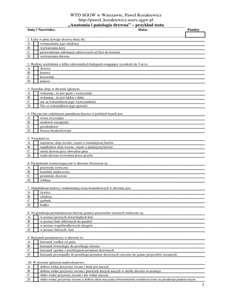 WTD SGGW w Warszawie, Paweł Kozakiewicz http://pawel_kozakiewicz.users.sggw.pl „Anatomia i patologia drewna” – przykład testu Imię i Nazwisko: Data: Punkty 1. Łyko w pniu żywego drzewa służy do: A wzmacniania jego struktury B wytwarzania kory C przewodzenia substancji odżywczych od liści do korzeni D wytwarzania drewna 2. Rośliny wieloletnie o kilku zdrewniałych łodygach osiągające wysokość do 5 m to: A drzewa B krzewy C krzewinki D pnącza 3. Szerokie słoje w drewnie iglastym: A wskazują , że jest gęste i wytrzymałe B wskazują , że jest lekkie i słabe C nie są wskaźnikiem jego wytrzymałości D Nie sa wskaźnikiem jego gęstości 4. Obcym (nie rodzimym) gatunkiem drzewa w polskich lasach jest: A sosna zwyczajna B modrzew europejski C grochodrzew D brzoza brodawkowata 5. Twardziel to: A najstarsze słoje roczne, często o ciemniejszej barwie B najmłodsze słoje roczne, często o jaśniejszej barwie C strefa drewna przy obwodzie pnia D wada drewna wywołana przez grzyby 6. Elementami wzmacniającymi w drewnie liściastym są: A przewody żywiczne B komórki miękiszowe C promienie drzewne D włókna 7. Składnikiem budowy strukturalnej ścian komórkowych w drewnie jest: A żywica B celuloza C garbnik D białko 8. Na przekroju promieniowym drewna granice przyrostów rocznych widoczne są: A w postaci prostych równoległych linii B w postaci linii zbliżonych do parabol C w postaci współśrodkowych okręgów D w postaci falistych linii 9. Kierunek promieniowy w drewnie to: A kierunek wzdłuż osi pnia B kierunek równoległy do przebiegu rdzenia C kierunek zgodny z przebiegiem promieni drzewnych D kierunek prostopadły do przebiegu promieni drzewnych (styczny do granic przyrostów rocznych) 10. W drewnie iglastym makroskopowo: A dobrze widać przyrosty roczne i brak jest naczyń B dobrze widać przyrosty roczne i pierścień dużych naczyń w strefie drewna wczesnego C słabo widać przyrosty roczne i nie widać naczyń D słabo widać przyrosty roczne a dobrze duże naczynia równomiernie rozmieszczone na przekroju poprzecznym 1 WTD SGGW w Warszawie, Paweł Kozakiewicz http://pawel_kozakiewicz.users.sggw.pl 11. Sęki to wady występujące: A tylko w drewnie iglastym B tylko w drewnie liściastym C tylko w drewnie egzotycznym D we wszystkich rodzajach drewna 12. Zaszarzenie to wada drewna wywołana przez: A owady B grzyby C czynniki atmosferyczne D środki impregnacyjne 13. Drewno reakcyjne występujące w drzewach iglastych to: A drewno napięciowe B zakorek C zgnilizna D twardzica 14. Drewno iglaste o zabarwionej twardzieli i szerokim bielu zwierające żywicę to: A jodła B świerk C sosna D modrzew 15. Drewno liściaste pierścieniowo-naczyniowe ze wstążkami w strefie drewna późnego to: A jesion B dąb C wiąz D grochodrzew 16. Do grupy wad budowy anatomicznej drewna należy: A pęknięcie B sinizna C zgnilizna D sęk 17. Strefa drewna bezsęcznego występuje zwykle w: A części czubkowej pnia B strefie korony drzewa C części środkowej pnia D części odziomkowej pnia 18. W tzw. suchym stanie ochronnym znajduje się drewno o wilgotność: A poniżej 20% B od 20 do 80% C od 80 do 100% D powyżej 100% 19. Krzywizna występująca na szerokości tarcicy to: A krzywizna podłużna płaszczyzn B krzywizna podłużna boków C krzywizna poprzeczna płaszczyzn D wichrowatość 20. Typowy układ włókien widoczny na przekroju promieniowym drewna mahoniu to: A układ gniazdowy B układ falisty C układ pasiasty D układ splątany 2