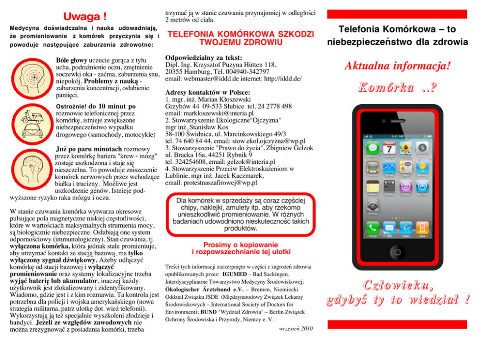 Ulotka o zagrozeniach zdrowia przez komórki