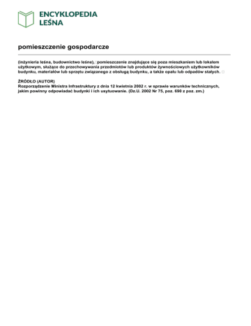 pomieszczenie gospodarcze (inżynieria leśna, budownictwo leśne), pomieszczenie znajdujące się poza mieszkaniem lub lokalem użytkowym, służące do przechowywania przedmiotów lub produktów żywnościowych użytkowników budynku, materiałów lub sprzętu związanego z obsługą budynku, a także opału lub odpadów stałych. ŹRÓDŁO (AUTOR) Rozporządzenie Ministra Infrastruktury z dnia 12 kwietnia 2002 r. w sprawie warunków technicznych, jakim powinny odpowiadać budynki i ich usytuowanie. (Dz.U. 2002 Nr 75, poz. 690 z poz. zm.)