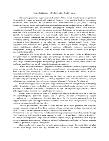 Samookaleczanie – chwilowa ulga. Trudny nałóg Zaburzenia psychiczne są poważnymi chorobami. Wiele z nich charakteryzuje się groźnymi dla zdrowia fizycznego zachowaniami i reakcjami. Depresja często wywołuje bardzo niebezpieczne zachowania, które prowadzą do uszkodzenia ciała. Samookaleczenie się jest jedną z bardziej drastycznych metod poprawiania swojego samopoczucia oraz zmniejszania cierpienia psychicznego. Samookaleczanie jest zachowaniem występującym zazwyczaj wśród osób młodych, najczęściej nastoletnich dziewcząt, jako reakcja na stan przedłużającego się napięcia emocjonalnego, zaburzone relacje międzyludzkie, akty przemocy ze strony innych, niskie poczucie własnej wartości. Zjawisko to najczęściej dotyczy osób, które przeżyły ciężki uraz w dzieciństwie, były poddawane przemocy fizycznej, seksualnej lub psychicznej we wczesnych latach życia. Samookaleczanie towarzyszy depresji, chorobie dwubiegunowej, schizofrenii, nerwicy natręctw i innym jednostkom chorobowym. Samookaleczanie to nie tylko akty naruszania ciągłości tkanek (cięcie żyletką, przypalanie ciała papierosem, bicie głową o ścianę), ale także ukryte metody autoagresji, takie jak nałogi, zaniedbania, szkodliwe nawyki żywieniowe, wybieranie partnerów nieosiągalnych emocjonalnie. Według tej definicji, jedna na dziesięć osób dokonuje w swoim życiu jakiegoś autodestrukcyjnego aktu. Autoagresja jest formą agresji, którą rozładowuje się na sobie. Osoby o skłonnościach autoagresywnych nie wyładowują napięcia emocjonalnego na innych osobach, tylko na sobie. Są to osoby skłonne do działań destrukcyjnych, które są formą radzenia sobie z problemami. Autoagresja może służyć rozładowaniu napięcia emocjonalnego, poradzenia sobie ze stresem, ale również w celu zwrócenia na siebie uwagi innych i osiągnięcia zamierzonych celów. Wobec poczucia bezradności i obojętności otoczenia, akt samookaleczenia przynosi cierpiącej osobie szybką, choć chwilową ulgę - złudne poczucie kontroli i poprawę samopoczucia. 30% osób, które dokonały aktu samoagresji, prawdopodobnie powtórzy go w ciągu roku. Niestety regularne samookaleczanie może przerodzić się w nałóg: „Zaczęłam się okaleczać mając 12 lat, teraz mam 19 i do tej pory zdarza mi się zrobić sobie krzywdę, ale są to raczej sporadyczne przypadki. (...) Próbuję zagłuszyć w sobie chęć okaleczania się, ale to jak z alkoholizmem - zostaje na całe życie, nawet po latach abstynencji.” (z forum TacyJakJa.pl) Osoby dokonujące aktów autoagresji mają zaniżoną samoocenę oraz problemy z akceptacją siebie. Nie potrafią rozwiązywać konfliktów i trudnych sytuacji konfrontując z innymi swoje poglądy. Wybierają w większości rozwiązanie, które przynosi im ulgę. Jest to jednak ulga chwilowa, która w efekcie prowadzi do poczucia winy i pogłębienia problemów. Osoby, które celowo zadają sobie ból, powinny jak najszybciej skontaktować się z lekarzem lub psychoterapeutą, ponieważ znajdują się w grupie, znacznie podwyższonego ryzyka przypadkowego czy zamierzonego odebrania sobie życia. Zwykle potrzeba samouszkodzenia jest nagłym impulsem i jeśli uda się powstrzymać od zadania sobie bólu przez kilka godzin - to zazwyczaj poczucie przymusu uszkodzenia ciała mija. Podczas psychoterapii, polecane są różne techniki, pozwalające przetrwać ten krytyczny moment. Czasami wyjście na dwór, bieg, rozmowa z kimś, spontaniczne przelanie na papier swoich myśli i odczuć – pozwalają opanować nagłą potrzebę zadania sobie bólu. Proponowane są też inne sposoby na rozładowanie emocji poprzez zadawanie sobie „nieszkodliwego bólu”. Można np. zjeść ostre chilli, wziąć lodowaty prysznic, czy ściskać kostki z lodem w dłoniach. Po udanym przezwyciężeniu chęci samookaleczenia sugerowane jest podarowanie sobie nagrody: czegoś smacznego, przyjemnego i lubianego, najlepiej o charakterze relaksującym (bardzo polecany jest masaż, pływalnia, wizyta u kosmetyczki). Zarówno dla osoby, która chce zerwać z aktami autoagresji, jak i dla osoby, która nie chce porzucić tego nałogu, ważne jest, aby zechciała ona z kimś na ten temat porozmawiać. Fakt samookaleczenia jest zwykle ukrywany jak hańbiąca tajemnica, choć podświadomie oczekuje się, że ktoś zauważy i zainteresuje się uszkodzeniami: „Na początku najczęściej cięłam się w szkolnej toalecie, w kabinie, za złe stopnie, za poniżanie przez rówieśników, ale i tak najważniejszym powodem samookaleczeń były zdarzenia z przeszłości. Czułam się lepiej. Robiłam to częściej. Głównie nocami. Znacznie głębiej, później starałam się jakoś owijać rany. Wtedy chciałam chyba, by ktoś dostrzegł, że coś jest nie tak i by pociągnął za język, bym mogła powiedzieć prawdę, niby 'przymuszona'. Żeby Ktoś zauważył i starał się pomóc” (z forum TacyJakJa.pl) Każda udana rozmowa na temat tego nałogu z kimś rozumiejącym osobę cierpiącą, pozwala rozładować napięcie i stanowi krok na drodze wyzwolenia się z tego nałogu. Niestety częstą reakcją na informację o samookaleczaniu się bliskiej osoby jest złość, krytyka, oskarżanie i szantaż emocjonalny. Kilka rad jak zachować się w takiej sytuacji: „Nie popadaj w złość – to może tylko pogorszyć sytuację. Spokojnie opowiedz osobie, która się kaleczy, jak bardzo Ci na niej zależy i jaki wpływ mają na Ciebie jej działania. Nie staraj się być terapeutą – wystarczy, że będziesz dobrym przyjacielem. Nie spodziewaj się, że zmiana nastąpi z dnia na dzień – problem jest trudny i wymaga czasu. Nie próbuj siłą powstrzymać osobę, która właśnie ma zamiar się okaleczyć – lepiej zaproponować rozmowę i odejść. Nie wymuszaj na niej obietnicy, że nigdy więcej tego nie zrobi. Nie obiecuj swojej pomocy tylko pod warunkiem, że przestanie się kaleczyć.” Najbardzie