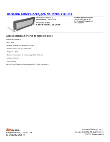 Barierka zabezpieczająca do łóżka YQ1351 Producent: TwójPasaż.pl Kod produktu: V_122051259 Cena netto: 90,24 zł Kontakt z Handlowcem: Tel/Fax: (68) 506 50 56 Email: [email protected] GG: 45303488 Cena brutto: 111.00 zł Zabezpieczająca barierka do łóżka dla dzieci Informacje o produkcie: - Stan: nowy - Materiał: poliester, stal, tworzywo sztuczne - Wymiary szer. x wys.: ok. 102 x 42 cm - Waga: ok. 1,7 kg - Barierka przeznaczona do materaca o grubości 12-20 cm - Łatwa w rozłożeniu - Kolor: srebrny. Barierka chroni Twoje dziecko przed upadkiem z łóżka podczas snu. Kod produktu:V_122051259 ID produktu:143940 Granos Group sp. z o.o. ul. Sulechowska 4a budynek 45 65-001 Zielona Góra