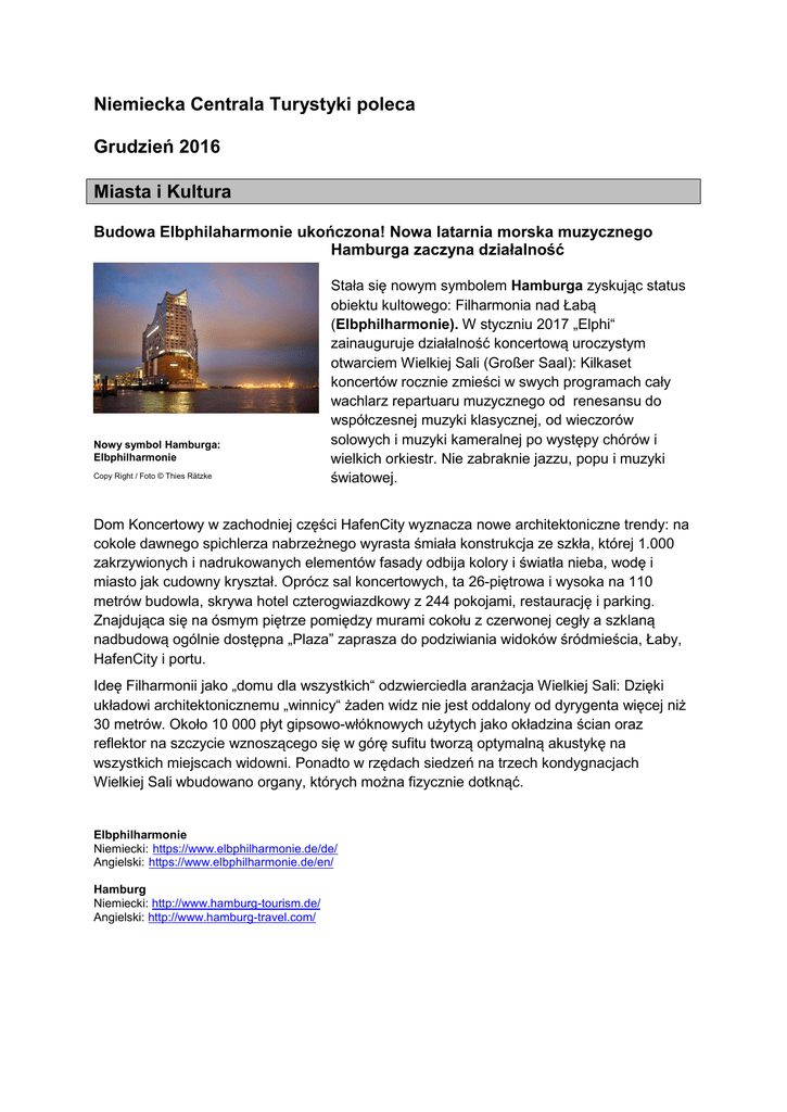 Niemiecka Centrala Turystyki poleca Grudzień 2016 Miasta i Kultura Budowa Elbphilaharmonie ukończona! Nowa latarnia morska muzycznego Hamburga zaczyna działalność Nowy symbol Hamburga: Elbphilharmonie Copy Right / Foto © Thies Rätzke Stała się nowym symbolem Hamburga zyskując status obiektu kultowego: Filharmonia nad Łabą (Elbphilharmonie). W styczniu 2017 „Elphi“ zainauguruje działalność koncertową uroczystym otwarciem Wielkiej Sali (Großer Saal): Kilkaset koncertów rocznie zmieści w swych programach cały wachlarz repartuaru muzycznego od renesansu do współczesnej muzyki klasycznej, od wieczorów solowych i muzyki kameralnej po występy chórów i wielkich orkiestr. Nie zabraknie jazzu, popu i muzyki światowej. Dom Koncertowy w zachodniej części HafenCity wyznacza nowe architektoniczne trendy: na cokole dawnego spichlerza nabrzeżnego wyrasta śmiała konstrukcja ze szkła, której 1.000 zakrzywionych i nadrukowanych elementów fasady odbija kolory i światła nieba, wodę i miasto jak cudowny kryształ. Oprócz sal koncertowych, ta 26-piętrowa i wysoka na 110 metrów budowla, skrywa hotel czterogwiazdkowy z 244 pokojami, restaurację i parking. Znajdująca się na ósmym piętrze pomiędzy murami cokołu z czerwonej cegły a szklaną nadbudową ogólnie dostępna „Plaza” zaprasza do podziwiania widoków śródmieścia, Łaby, HafenCity i portu. Ideę Filharmonii jako „domu dla wszystkich“ odzwierciedla aranżacja Wielkiej Sali: Dzięki układowi architektonicznemu „winnicy“ żaden widz nie jest oddalony od dyrygenta więcej niż 30 metrów. Około 10 000 płyt gipsowo-włóknowych użytych jako okładzina ścian oraz reflektor na szczycie wznoszącego się w górę sufitu tworzą optymalną akustykę na wszystkich miejscach widowni. Ponadto w rzędach siedzeń na trzech kondygnacjach Wielkiej Sali wbudowano organy, których można fizycznie dotknąć. Elbphilharmonie Niemiecki: https://www.elbphilharmonie.de/de/ Angielski: https://www.elbphilharmonie.de/en/ Hamburg Niemiecki: http://www.hamburg-tourism.de/ Angielski: http://www.hamburg-travel.com/ Wschodni buddyzm w konfrontacji z zachodnią kulturą przemysłową Wielokrotnie nagradzany fotografik, Steve McCurry, który w roku 1984 zyskał światowy rozgłos dzięki zdjęciu portretowmu „afgańskiej dziewczynki“, od lat fascynuje się światem Azji i kulturą buddyjską. Jeszcze do 5 marca 2017 w Völklinger Hütte prezentowanych jest pod tytułem „Steve McCurry. Buddyzm – Fotografie z lat 1985 - 2013“ 40 wielkoformatowych zdjęć, wykonanych pomiędzy rokiem 1985 a 2013 i skoncentrowanych tematycznie na kulturze i tradycjach Ćwiczenia mnichów Shaolin, Zhengzhou, Chiny, 2004 buddyzmu: od jego początków w Nepalu i Indiach po Copy Right / Foto: © Steve McCurry dzisiejsze oblicze światowej religii. Program towarzyszący wystawie obejmuje medytacje z mnichami buddyjskimi, ćwiczenia qigong a także oprowadzanie tematyczne i programy dla dzieci. Na powierzchni 600.000 m2 czeka na odwiedzających „ścieżka poznania“ z ośmioma stacjami medytacji. Tak oto w Völklinger Hütte spotykają się dwie kultury: wschodnia kultura buddyzmu i zachodnia kultura przemysłowa. Wpisana na listę światowego dziedzictwa UNESCO, zbudowana w roku 1873 huta i stalownia w Saarlandzie, świetnie ilustruje erę industrializacji, która zdominowała Europę. W trakcie około dwugodzinnego zwiedzania tego obiektu światowego dziedzictwa można ze stalowych kolosów spojrzeć zarówno na dzisiejsze miasto Völklingen jak i na miniony świat fabryk żelaza i stali. Völklinger Hütte [Huta Völklinger] Niemiecki: http://www.voelklinger-huette.org/de/willkommen/ Angielski: http://www.voelklinger-huette.org/en/welcome/ Saarland [Kraj Saary] Niemiecki: http://www.tourismus.saarland.de/de/index Angielski: http://www.visitsaarland.co.uk/en/index Rekreacja i Wypoczynek Wypoczynek pomiędzy koronami drzew Zupełnie wyjątkowe miejsca noclegowe w Dolnej Saksonii są połączeniem hotelowego komfortu z marzeniem lat dziedzięcych większości z nas: nocowaniem w domku na drzewie. Goście „wilczej wioski“ - Wolfcenter Dörverden – mogą znaleźć spokój i wytchnienie wśród szelestu liści na wysokości gałęzi drzew. Hostel pod nazwą ‘Tree Inn‘ oferuje pełny standard wyposażenia i miejsce dla trzech osób w każdym z domków. Do wnętrza o powierzchni 30 m2 z Komfort dla poszukujących wytchnienia w środku lasu przeszklonym frontem o długości siedmiu metrów Copy Right: © Baumgeflüster prowadzi most linowy. Z całkiem sporego tarasu na wysokości osmiu metrów można patrzeć na zagrodę, w której zyje sześc młodych wilków. W Wolfcenter Dörverden – będącym połączeniem zoo, muzeum, centrum kongresowego, szkoły i restauracji – dowiemy się wielu ciekawych rzeczy o wilkach żyjących dziko w przyrodzie, których liczba w Niemczech stale rośnie. Także w obiekcie Resort Baumgeflüster niedaleko Bad Zwischenahn poszukujący ciszy mogą poczuć się częścią przyrody: Ekskluzywne domki na drzewach z pokojami w stylu apartamentów łączą luksus i przytulność z prostotą otoczenia. Wiele przezroczystych powierzchni daje wrażenie unoszenia się na wysokości czterech metrów ponad powierzchnią leśnego gruntu a szelest liści gwarantuje niczym niezakłócone odprężenie i spokój płynący prosto z natury. Wolfcenter Dörverden Niemiecki: http://www.wolfcenter.de/Willkommen.html Angielski: http://www.wolfcenter.de/Presse-10-Company-portrait.html Resort Baumgeflüster Niemiecki: http://www.baumgefluester.de/de/ Angielski: http://www.baumgefluester.de/en/ Niedersachsen [Dolna Saksonia] Niemiecki: http://www.reiseland-niedersachsen.de/ Angielski: http://www.niedersachsen-tourism.com/ Podróż do czasów pierwotnych: dinozaury i skamieniałości w Altmühltal Na ponad 3 000 metrów kwadratowych rozciaga się park przyrody ‚Naturpark Altmühltal‘ w samym sercu Bawarii, na pół