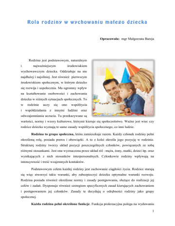 Opracowała: mgr Małgorzata Bareja Rodzina jest podstawowym, naturalnym i najważniejszym środowiskiem wychowawczym dziecka. Oddziałuje na nie najdłużej i najsilniej. Jest również pierwszym środowiskiem społecznym, w którym dziecko się rozwija i uspołecznia. Ma ogromny wpływ na kształtowanie osobowości i zachowania dziecka w różnych sytuacjach społecznych. To w rodzinie uczy się ono współżycia i współdziałania z innymi ludźmi oraz odwzajemniania uczucia. Tu przekazywane są wartości, normy i wzory kulturowe, którymi kieruje się społeczeństwo. Ważne jest wiec czy rodzice dziecka wyznają te same zasady współżycia społecznego, co inni ludzie. Rodzina to grupa społeczna, która zamieszkuje razem. Każdy członek rodziny pełni określoną rolę, posiada prawa i obowiązki. A to z kolei określa jego pozycję w rodzinie. Strukturę rodziny tworzy układ pozycji poszczególnych członków, powiązanych ze sobą różnymi stosunkami. Jest ona wyznaczona przez układ ról : męża, żony, matki, dzieci itp. oraz wynikających z nich stosunków interpersonalnych. Członkowie rodziny wpływają na intensywność i treść wzajemnych kontaktów. Podstawowym celem każdej rodziny jest zachowanie ciągłości życia. Rodzice starają się więc stworzyć takie warunki, aby zabezpieczyć dziecku optymalne warunki rozwoju. Rodzina posiada również określone normy i zasady postępowania, służące do realizacji jej celów i zadań. Dysponuje również szeregiem specyficznych zasad kierujących zachowaniem i postępowaniem jej członków. Zasady te decydują o odrębności rodziny jako grupy społecznej. Każda rodzina pełni określone funkcje. Funkcja prokreacyjna polega na wydawaniu 1 na świat potomstwa, natomiast seksualna zaspokaja potrzeby małżonków. Praca zarobkowa członków rodziny to funkcja materialno – ekonomiczna, a zabezpieczająco – opiekuńcza funkcja jest zapewnieniem dobrego bytu. Następne funkcje to funkcje klasowa i legalizacyjno – kontrolna. Polegają na wyznaczaniu pozycji członków rodziny w społeczeństwie, a także przestrzeganiu zachowań obowiązujących w społeczności, jak również w rodzinie. Ostatnia funkcja to socjopsychologiczna. W ramach realizowania tej funkcji członkowie rodziny wprowadzają dziecko w społeczeństwo, świat kultury, uczą umiejętności życiowych i zaspokajają potrzeby emocjonalne. Oddziaływania wychowawcze w dużym stopniu zależą od jakości i poziomu pełnienia przez rodzinę funkcji ekonomicznych i socjopsychologicznych, a także pewnych mechanizmów wychowawczych. W wychowaniu małego człowieka ogromny wpływ ma mechanizm naśladownictwa i identyfikacji z rodzicami. Małe dziecko wie, że nie potrafi zaspokoić samodzielnie swoich potrzeb i musi mu w tym pomóc osoba dorosła. Widzi, że rodzice umieją więcej niż ono samo. To prowadzi do pragnienia identyfikowania się z nimi. Identyfikacja z rodzicami jest najważniejsza w procesie wychowania dziecka. W miarę rozwoju poszerza się krąg jego znajomości i pojawiają się inne modele, ale rozmiar i siła identyfikacji z innymi osobami jest znacznie mniejsza. Powodem tego jest fakt, iż pozostałe modele okazują dziecku mniej miłości i czułości niż rodzice. Wiele interakcji z takimi osobami jest przelotnych i krótkotrwałych. Z punktu widzenia pedagogiki i wychowania, ważne jest, aby modele, z którymi dziecko się identyfikuje miały cechy godne naśladownictwa i powielania. W niekorzystnej sytuacji znajdują się dzieci, których rodzice wykazują cechy nieakceptowane społecznie. Wzorując się na nich dzieci mogą mieć trudności w nawiązywaniu prawidłowych kontaktów społecznych. Równie ważnym mechanizmem wychowawczym są trzy rodzaje oddziaływań wychowawczych stosowanych przez rodziców: wychowanie zintegrowane (konserwatywne), wychowanie autokratywne (rygorystyczne), wychowanie w dialogu (kreatywne). 2 W wychowaniu zintegrowanym istotą stosunków wychowawczych jest stopniowe dochodzenie do rozwiązywania zadań przez minimalną ingerencję. Dziecko jest stawiane przed pseudoproblemami, gdyż przeszkody, które musi pokonać, są minimalne. Często rodzice sami wyręczają w rozwiązywaniu problemu. Minimalne konflikty społeczne kształtują osobowości infantylne, niesamodzielne, egocentryczne, niezdecydowane, nieodpowiedzialne i konformistyczne. W wychowaniu autokratycznym jawne konflikty między rodzicami a dzieckiem występują bardzo rzadko, ale dziecko przeżywa ukryte konflikty o wysokiej intensywności. Rodzice narzucają mu swoją wolę, dążą do całkowitego podporządkowania sobie dziecka. Ponieważ sprzeciw wobec poleceń rodziców oznacza karę dla dziecka, niemożliwe jest dojście do porozumienia. Są to konflikty nierozwiązywalne. Takie oddziaływanie wychowawcze kształtuje osobowość bezradną, apatyczną, znerwicowaną, z objawami zaburzeń psychicznych lub też osobowość cyniczną, nietolerancyjną, agresywną, autorytarną. Istotą procesu wychowania kreatywnego są stosunki egalitarne, partnerskie i demokratyczne. Dzięki wypowiadanym sądom i poglądom dochodzi do rozwiązywania konfliktów. Ważnym elementem jest tu silna więź łącząca partnerów. Okazują sobie aprobatę, nawet wtedy, gdy wypowiadają wobec siebie krytyczne uwagi. Ten rodzaj wychowania kształtuje takie cechy osobowości, jak: odwaga, samodzielność aktywność, tolerancja, otwartość myślenia, życzliwość, gotowość współpracy i współdziałania, dążenie do samokontroli i samorozwoju. Najbardziej znaczącym czynnikiem środowiska wychowawczego są postawy rodziców. Wpływają one bezpośrednio i pośrednio na zachowanie dzieci. Postawy rodzicielskie to całokształt stosunków rodziców wobec dziecka ( osobno ojca, osobno matki ), świadomość ich oddziaływania na nie oraz znajomość zagadnień wychowawczych, kształtowanych podczas pełnienia roli rodzica. Najbardziej optymalna dla potrzeb p