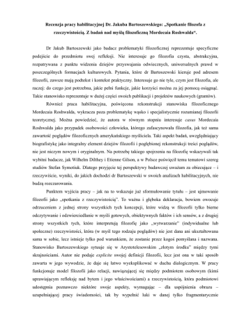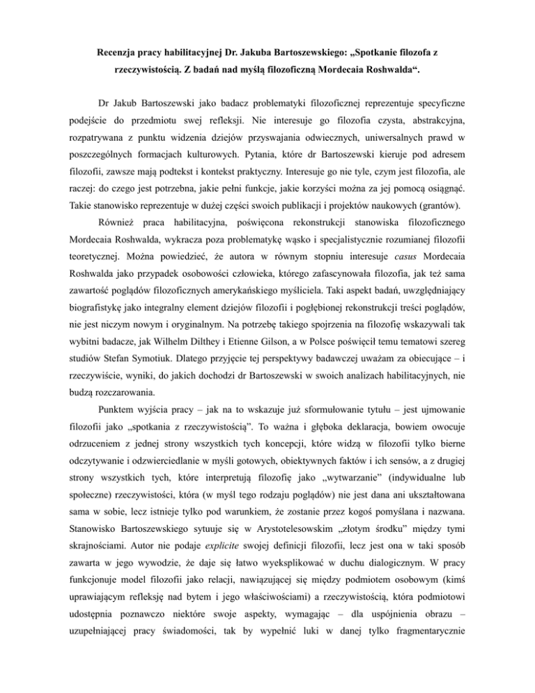 Recenzja pracy habilitacyjnej Dr. Jakuba Bartoszewskiego: „Spotkanie filozofa z rzeczywistością. Z badań nad myślą filozoficzną Mordecaia Roshwalda“. Dr Jakub Bartoszewski jako badacz problematyki filozoficznej reprezentuje specyficzne podejście do przedmiotu swej refleksji. Nie interesuje go filozofia czysta, abstrakcyjna, rozpatrywana z punktu widzenia dziejów przyswajania odwiecznych, uniwersalnych prawd w poszczególnych formacjach kulturowych. Pytania, które dr Bartoszewski kieruje pod adresem filozofii, zawsze mają podtekst i kontekst praktyczny. Interesuje go nie tyle, czym jest filozofia, ale raczej: do czego jest potrzebna, jakie pełni funkcje, jakie korzyści można za jej pomocą osiągnąć. Takie stanowisko reprezentuje w dużej części swoich publikacji i projektów naukowych (grantów). Również praca habilitacyjna, poświęcona rekonstrukcji stanowiska filozoficznego Mordecaia Roshwalda, wykracza poza problematykę wąsko i specjalistycznie rozumianej filozofii teoretycznej. Można powiedzieć, że autora w równym stopniu interesuje casus Mordecaia Roshwalda jako przypadek osobowości człowieka, którego zafascynowała filozofia, jak też sama zawartość poglądów filozoficznych amerykańskiego myśliciela. Taki aspekt badań, uwzględniający biografistykę jako integralny element dziejów filozofii i pogłębionej rekonstrukcji treści poglądów, nie jest niczym nowym i oryginalnym. Na potrzebę takiego spojrzenia na filozofię wskazywali tak wybitni badacze, jak Wilhelm Dilthey i Etienne Gilson, a w Polsce poświęcił temu tematowi szereg studiów Stefan Symotiuk. Dlatego przyjęcie tej perspektywy badawczej uważam za obiecujące – i rzeczywiście, wyniki, do jakich dochodzi dr Bartoszewski w swoich analizach habilitacyjnych, nie budzą rozczarowania. Punktem wyjścia pracy – jak na to wskazuje już sformułowanie tytułu – jest ujmowanie filozofii jako „spotkania z rzeczywistością”. To ważna i głęboka deklaracja, bowiem owocuje odrzuceniem z jednej strony wszystkich tych koncepcji, które widzą w filozofii tylko bierne odczytywanie i odzwierciedlanie w myśli gotowych, obiektywnych faktów i ich sensów, a z drugiej strony wszystkich tych, które interpretują filozofię jako „wytwarzanie” (indywidualne lub społeczne) rzeczywistości, która (w myśl tego rodzaju poglądów) nie jest dana ani ukształtowana sama w sobie, lecz istnieje tylko pod warunkiem, że zostanie przez kogoś pomyślana i nazwana. Stanowisko Bartoszewskiego sytuuje się w Arystotelesowskim „złotym środku” między tymi skrajnościami. Autor nie podaje explicite swojej definicji filozofii, lecz jest ona w taki sposób zawarta w jego wywodzie, że daje się łatwo wyeksplikować w duchu dialogicznym. W pracy funkcjonuje model filozofii jako relacji, nawiązującej się między podmiotem osobowym (kimś uprawiającym refleksję nad bytem i jego właściwościami) a rzeczywistością, która podmiotowi udostępnia poznawczo niektóre swoje aspekty, wymagając – dla uspójnienia obrazu – uzupełniającej pracy świadomości, tak by wypełnić luki w danej tylko fragmentarycznie samoprezentacji bytu. Jeśli przyjmiemy taką koncepcję filozofii – a jest ona całkowicie uprawniona i funkcjonuje w niektórych stanowiskach metafilozoficznych, na przykład u Ernsta Cassirera, Jana Patočki lub Czesława Głombika – wówczas stanie się zrozumiałe i umotywowane, że każda próba rekonstrukcji czyjegoś filozofowania wymaga uwzględnienia nie tylko literalnie wziętej treści jego publikacji, ale także zagłębienia się w okoliczności biografii, koleje życia, źródła inspiracji oraz przyczyny ukształtowania się określonego typu wrażliwości badawczej. Tak właśnie postępuje Jakub Bartoszewski, który zanim (w trzecim rozdziale swojej habilitacyjnej pracy) przedstawi wyniki rozbioru treści filozoficznego poglądu na świat Mordecaia Roshwalda, najpierw (w rozdziale drugim) podda wnikliwemu zbadaniu warunki ukształtowania się umysłowości o określonym nastawieniu poznawczym wobec świata. To z kolei poprzedzone jest dokonaną w rozdziale pierwszym próbą sprecyzowania stanowiska w – kluczowej dla przyjętej perspektywy badawczej – kwestii doświadczenia jako fundamentalnego sposobu nawiązywania kontaktu poznawczego z rzeczywistością. Aby móc wiarygodnie zrekonstruować filozofię Roshwalda, trzeba najpierw ustalić, jaka jest jego pozycja w sporze o źródła i przedmiot poznania w kontekście pytania o „bezpośrednie i pośrednie doświadczenie zarówno intelektualne, jak i zmysłowe, dzięki któremu dokonujemy opisu rzeczywistości” (s. 19). Po przetestowaniu różnych możliwości autor przypisuje ostatecznie badanemu przez siebie filozofowi umiarkowany realizm, zarówno metafizyczny, jak epistemologiczny (s. 18-26). W trakcie obrony warto byłoby, aby habilitant sprecyzował powody, dla których Roshwald zdecydował się odrzucić stanowisko idealistyczne i wszystkie pokrewne mu odmiany (np. konwencjonalizm), a optując za realizmem, nie poszedł za nurtem klasycznej filozofii, lecz obrał pogląd umiarkowany. Realizując założenia przyjęte na początku pracy (s. 17) autor podjął się rekonstrukcji zewnętrznych uwarunkowań postawy filozoficznej Roshwalda. Pierwsza ich grupa wiąże się z dość skomplikowanymi meandrami stosunków narodowościowych, związanych najpierw z miejscem urodzenia (pogranicze kulturowe polsko-rosyjsko-ukraińskie) oraz pochodzeniem i tradycją rodzinną (korzenie żydowskie), a następnie z pobytem w różnych krajach i środowiskach na kilku kontynentach (w Europie, Azji i Ameryce). Druga kwestia to religijne uwarunkowania myśli filozoficznej. W przypadku myślicieli pochodzenia żydowskiego (dotyczy to nie tylko Roshwalda, ale też takich postaci jak Martin Buber, Hermann Cohen, Franz Rosenzweig czy Emmanuel Levinas) znaczącą rolę odgrywa dogłębna, zarówno erudycyjna jak kr