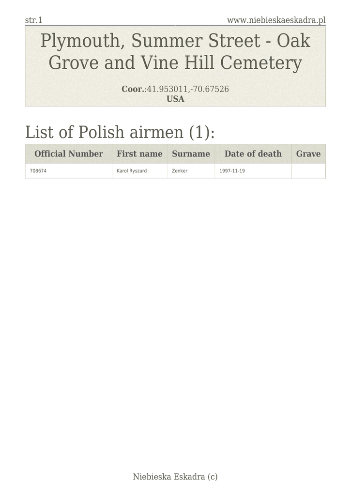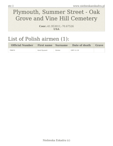 str.1 www.niebieskaeskadra.pl Plymouth, Summer Street - Oak Grove and Vine Hill Cemetery Coor.:41.953011,-70.67526 USA List of Polish airmen (1): Official Number 708674 First name Surname Karol Ryszard Zenker Niebieska Eskadra (c) Date of death 1997-11-19 Grave