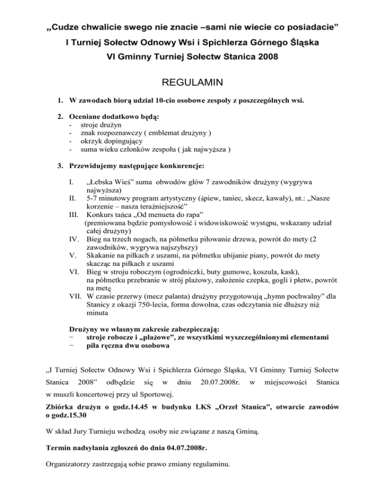 „Cudze chwalicie swego nie znacie –sami nie wiecie co posiadacie” Śą I Turniej Sołectw Odnowy Wsi i Spichlerza Górnego l ska VI Gminny Turniej Sołectw Stanica 2008 REGULAMIN 1. W zawodach biorą udział 10-cio osobowe zespoły z poszczególnych wsi. 2. Oceniane dodatkowo bę dą : - stroje druŜ yn - znak rozpoznawczy ( emblemat druŜ yny ) - okrzyk dopingują cy - suma wieku członków zespołu ( jak najwyŜ sza ) 3. Przewidujemy nastę pują ce konkurencje: I. II. III. IV. V. VI. VII. „Łebska Wieś ” suma obwodów głów 7 zawodników druŜ yny (wygrywa najwyŜ sza) 5-7 minutowy program artystyczny (ś piew, taniec, skecz, kawały), nt.: „Nasze ć korzenie – nasza teraź niejszoś ” Konkurs tań ca „Od menueta do rapa” ć ć (premiowana bę dzie pomysłowoś i widowiskowoś wystę pu, wskazany udział całej druŜ yny) Bieg na trzech nogach, na półmetku piłowanie drzewa, powrót do mety (2 zawodników, wygrywa najszybszy) Skakanie na piłkach z uszami, na półmetku ubijanie piany, powrót do mety skaczą c na piłkach z uszami Bieg w stroju roboczym (ogrodniczki, buty gumowe, koszula, kask), na półmetku przebranie w strój plaŜ owy, załoŜ enie czepka, gogli i płetw, powrót na metę W czasie przerwy (mecz palanta) druŜ yny przygotowują „hymn pochwalny” dla Stanicy z okazji 750-lecia, forma dowolna, czas odczytania nie dłuŜ szy niŜ minuta DruŜ yny we własnym zakresie zabezpieczają : − stroje robocze i „plaŜ owe”, ze wszystkimi wyszczególnionymi elementami − piła rę czna dwu osobowa „I Turniej Sołectw Odnowy Wsi i Spichlerza Górnego Ślą ska, VI Gminny Turniej Sołectw Stanica 2008” odbę dzie się w dniu 20.07.2008r. w miejscowoś ci Stanica w muszli koncertowej przy ul Sportowej. Zbiórka druŜ yn o godz.14.45 w budynku LKS „Orzeł Stanica”, otwarcie zawodów o godz.15.30 W skład Jury Turnieju wchodzą osoby nie zwią zane z naszą Gminą . Termin nadsyłania zgłoszeń do dnia 04.07.2008r. Organizatorzy zastrzegają sobie prawo zmiany regulaminu.