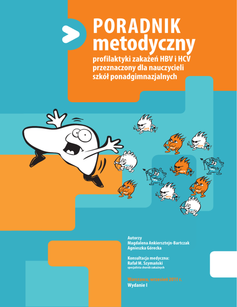 PORADNIK metodyczny profilaktyki zakażeń HBV i HCV przeznaczony dla nauczycieli szkół ponadgimnazjalnych Autorzy Magdalena Ankiersztejn-Bartczak Agnieszka Górecka Konsultacja medyczna: Rafał M. Szymański specjalista chorób zakaźnych Warszawa, wrzesień 2011 r. Wydanie I WSTĘP SPIS TREŚCI WSTĘP .......................................................................................................................................................................... 3 I. OPIS PROGRAMU................................................................................................................................................... 4 1. Założenia ogólne..................................................................................................................................................... 4 2. Założenia realizacji programu.............................................................................................................................. 6 2.1. Cel główny.................................................................................................................................................. 6 2.2.Cele szczegółowe....................................................................................................................................... 6 2.3. Adresaci programu..................................................................................................................................... 6 2.4. Realizatorzy................................................................................................................................................. 6 2.5. Materiały edukacyjne................................................................................................................................. 6 2.6.Miejsce zajęć w programie szkoły............................................................................................................. 6 2.7. Sposób realizacji programu........................................................................................................................ 7 2.8.Ewaluacja programu................................................................................................................................... 7 II. ABC wirusowego zapalenia wątroby typu B i C..................................................................................... 8 1. Parę słów o wątrobie.............................................................................................................................................. 8 2. Wirusowe zapalenie wątroby (WZW)................................................................................................................. 9 3. Wirusowe zapalenie wątroby typu B............................................................................................................... 10 3.1. Dane epidemiologiczne............................................................................................................................ 10 3.2. Drogi zakażenia HBV................................................................................................................................. 11 Zmniejszenie ryzyka zakażenia drogą płciową....................................................................................... 12 3.3. Objawy zakażenia HBV............................................................................................................................. 12 3.4. Przebieg choroby...................................................................................................................................... 13 Ostre WZW typu B.................................................................................................................................... 14 Przewlekłe WZW typu B.......................................................................................................................... 14 3.5. Szczepienia przeciwko HBV..................................................................................................................... 16 3.6. Leczenie przewlekłego WZW typu B...................................................................................................... 17 4. Wirusowe zapalenie wątroby typu C................................................................................................................ 18 4.1. Dane epidemiologiczne............................................................................................................................ 18 4.2.Drogi zakażenia HCV................................................................................................................................. 19 4.4. Przebieg zakażenia HCV........................................................................................................................... 20 Ostre WZW typu C.................................................................................................................................... 20 Przewlekłe WZW typu C.......................................................................................................................... 21 4.5.Leczenie przewlekłego WZW typu C...................................................................................................... 21 III. SCENARIUSZ ZAJĘĆ EDUKACYJNYCH.......................................................................................................... 22 IV. MATERIAŁY POMOCNICZE.............................................................................................................................. 25 1. Odpowiedzi na najczęściej zadawane pytania............................................................................................... 25 2. Wykaz literatury pomocniczej............................................................................................................................ 32 3. Wykaz pomocnych stron internetowych.......................................................................