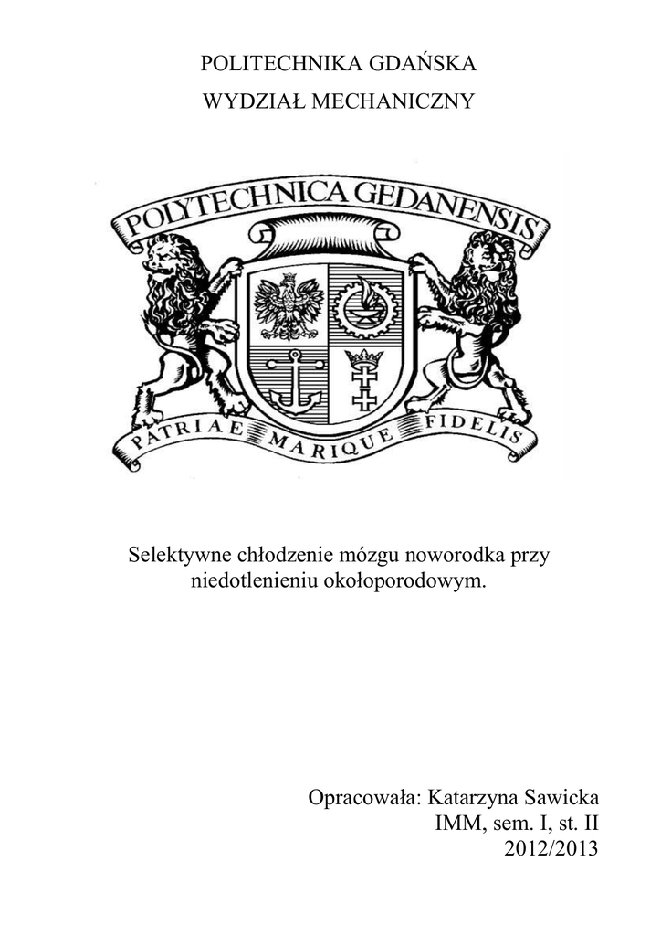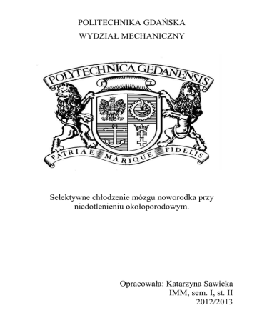 POLITECHNIKA GDAŃSKA WYDZIAŁ MECHANICZNY Selektywne chłodzenie mózgu noworodka przy niedotlenieniu okołoporodowym. Opracowała: Katarzyna Sawicka IMM, sem. I, st. II 2012/2013 1. Wstęp – co oznacza niedotlenienie? Niedotlenienie jest to ogólne określenie niedoboru lub braku tlenu we krwi lub w tkankach. Wynika ono z różnicy między zapotrzebowaniem a zaopatrzeniem organizmu w tlen. Niedotlenienie okołoporodowe oznacza niewydolność oddechową u noworodka, która spowodowana jest niewystarczającą ilością tlenu przed, w trakcie lub po porodzie. Termin ten stosuje się w odniesieniu do nieudanej próby rozpoczęcia regularnego oddychania przez dziecko w ciągu minuty od narodzin. Podczas niedotlenienia okołoporodowego dochodzi do niepożądanych reakcji biochemicznych. Prowadzą one do powstawania wolnych rodników tlenowych, które mają niezwykle toksyczne działanie na komórki nerwowe, uszkadzają je i nieodwracalnie niszczą. Proces ten trwać może nawet kilka tygodni. Przyczyn niedotlenienia jest bardzo wiele. Do najczęstszych można zaliczyć: • Niedotlenienie dziecka przed porodem • Ucisk pępowiny w trakcie porodu • Poród przedwczesny lub złożony • Podanie osobie rodzącej środka znieczulającego • Komplikacje porodowe Wpływ ma również wiek rodzącej (większe ryzyko, gdy matka ma mniej niż 16 lub więcej niż 40 lat), przebyte przez nią choroby oraz zachowanie w czasie ciąży (odżywianie, picie alkoholu, palenie papierosów). Skutki niedotlenienia okołoporodowego mają ogromny wpływ na dziecko. Mogą się przejawiać w różny sposób, zależnie od czasu i stopnia niedotlenienia, zaczynając od przemijających zaburzeń neurologicznych, przez trudności w nauce, upośledzenie umysłowe, padaczkę aż po mózgowe porażenie dziecięce a nawet śmierć mózgu. 2. Sposoby minimalizacji uszkodzeń mózgu po niedotlenieniu Aktualnie medycyna zna tylko dwa sposoby ograniczenia uszkodzeń mózgu doznanych na skutek niedotlenienia: • Środki farmakologiczne • Terapeutyczna hipotermia 2.1. Środki farmakologiczne Badania nad skutecznością leków, których zadaniem byłaby minimalizacja uszkodzeń mózgu trwają nieprzerwanie. Do tej pory wyróżniono kilka grup leków wykazujących pewną skuteczność. Pierwsza z nich to receptor jonotropowy NMDA. Lek ten niestety powoduje bardzo wiele skutków ubocznych, np. katatonia czy halucynacje, jest, więc stosowany tylko w wyjątkowych sytuacjach i z dużą ostrożnością. Drugą grupą leków są receptory receptory metabotropowe mGluR. Innym lekiem wykazującym działanie są antyoksydanty, które zmniejszają uszkodzenia spowodowane działaniem wolnych rodników tlenowych. 2.2. Terapeutyczna hipotermia Metodą wychłodzenia organizmu noworodków urodzonych z cechami niedotlenienia mózgu posługiwano się od bardzo dawna. Polewano główkę dziecka lub nawet zanurzano je całe w zimnej wodzie. Zauważono również dobre wyniki resuscytacji po długim okresie niedotlenienia przebytym w niskiej temperaturze, np. po utonięciu w zimnej wodzie. Pierwsze badania kliniczne dotyczące hipotermii noworodków nie potwierdzały teorii o jej skuteczności. Było to spowodowane źle dobranymi parametrami badań. Jednak kolejne eksperymenty zaczęły dawać dobre wyniki. Wykazano, że pozytywny efekt hipotermii można uzyskać po wdrożeniu jej w ciągu pierwszych 6 godzin po niedotlenieniu. Powoduje to zahamowanie reakcji biochemicznych odpowiedzialnych za wtórne uszkodzenie mózgu. Terapeutyczne hipotermia polega na wychłodzeniu organizmu poniżej temperatury 35°C. Obniżenie temperatury o 2-3°C powoduje zmniejszenie urazu spowodowanego niedokrwieniem. Zmniejsza się metabolizm komórek, hamowane są kaskady reakcji biochemicznych powstałych po niedotlenieniu oraz zahamowany zostaje stan zapalny. Wprowadzenie w stan hipotermii może być osiągnięte na dwa sposoby: • Hipotermia ogólna, czyli wyziębienie całego ciała noworodka do temperatury wewnątrz ok. 33°C • Selektywne ochłodzenie mózgu dziecka za pomocą specjalnego kapturka chłodzącego 3. Warianty systemu chłodzenia mózgu noworodka Selektywne chłodzenie mózgu noworodka można podzielić na trzy warianty: • Bezpośredni system chłodzenia mózgu • Pośredni system chłodzenia mózgu • Hybrydowy system chłodzenia mózgu 3.1. Bezpośredni system chłodzenia mózgu Bezpośredni system chłodzenia mózgu zakłada bezpośrednie użycie stron zimnych modułów termoelektrycznych do schłodzenia głowy dziecka. Układ taki składa się z kapturka obłożonego termoelektrodami (1) odbierającymi ciepło. Od strony gorącej termoelementów ciepło odbierane jest przez płyn chłodzący, który z kolei, oddaje ciepło w konwencjonalnej chłodnicy wentylatorowej (2). Reszta ciała dziecka ogrzewana jest przez promiennik podczerwieni (4), z funkcją kontroli ogrzewania. Wadami tej metody są punktowy odbiór ciepła oraz trudności z konserwacją i sterylizacją urządzenia. Rys. 1 Schemat blokowy bezpośredniego systemu selektywnego chłodzenia mózgu noworodka 3.2. Pośredni system chłodzenia mózgu Pośredni system chłodzenia mózgu wykorzystuje moduły termoelektryczne w celu schładzania płynu pośredniczącego, który następnie chłodzi główkę dziecka. Założenia techniczne są podobne do systemy bezpośredniego z tą różnicą, że rozdzielona została jednostka chłodząca od miejsca wymiany ciepła. System składa się z czapki chłodzącej (1), czyli wymiennika ciepła, w którym krąży woda chłodzona w układzie chłodzącym (2). Do zalet takiego rozwiązania można zaliczyć łatwość przemieszczania urządzenia, wyrównanie gęstości strumienia ciepła oraz łatwość czyszczenia i sterylizacji. Metoda ta posiada również określone wady, wśród których można wyróżnić np. trudną do przewidzenia możliwość podgrzania nośnika oraz wydłużony okres odpowiedzi organizmu na zmianę temperatury płynu