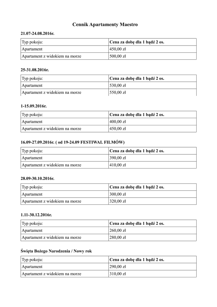 Cennik Apartamenty Maestro 21.07-24.08.2016r. Typ pokoju: Cena za dobę dla 1 bądź 2 os. Apartament 450,00 zł Apartament z widokiem na morze 500,00 zł 25-31.08.2016r. Typ pokoju: Cena za dobę dla 1 bądź 2 os. Apartament 530,00 zł Apartament z widokiem na morze 550,00 zł 1-15.09.2016r. Typ pokoju: Cena za dobę dla 1 bądź 2 os. Apartament 400,00 zł Apartament z widokiem na morze 450,00 zł 16.09-27.09.2016r. ( od 19-24.09 FESTIWAL FILMÓW) Typ pokoju: Cena za dobę dla 1 bądź 2 os. Apartament 390,00 zł Apartament z widokiem na morze 410,00 zł 28.09-30.10.2016r. Typ pokoju: Cena za dobę dla 1 bądź 2 os. Apartament 300,00 zł Apartament z widokiem na morze 320,00 zł 1.11-30.12.2016r. Typ pokoju: Cena za dobę dla 1 bądź 2 os. Apartament 260,00 zł Apartament z widokiem na morze 280,00 zł Święta Bożego Narodzenia / Nowy rok Typ pokoju: Cena za dobę dla 1 bądź 2 os. Apartament 290,00 zł Apartament z widokiem na morze 310,00 zł WAŻNE INFOMARCJE: • Dodatkowa osoba – 50 zł/doba (Maksymalnie 4 osoby), • Minimalny okres pobytu 2 doby (chyba, że strony ustalą inaczej), • Doba rozpoczyna się o godzinie 14:00 w dniu przyjazdu i kończy o godzinie 12:00 w dniu wyjazdu, • Przy rezerwacji prosimy o podanie planowanej godziny przyjazdu, • Zameldowanie odbywa się do godziny 22:00 (o ile nie ustalono inaczej), • Dzieci do 5 roku życia- bezpłatnie na łóżku rodziców, • Łóżeczko niemowlęce- 20 zł/doba, • Podziemne miejsce garażowe płatne dodatkowo- 20zł/doba (konieczna rezerwacja), • Bezpłatny parking na zewnątrz budynku, • Za pobyt zwierzęcia należy uiścić opłatę w wysokości- 50 zł/doba, • Zgubienie klucza 150 zł, • Opłata za złamanie zakazu palenie 100 zł, • Na życzenia gościa wystawiamy fv (prosimy o wcześniejsza informacje), • Całodobowa informacja pod telefonem nr: (058) 661 20 38,