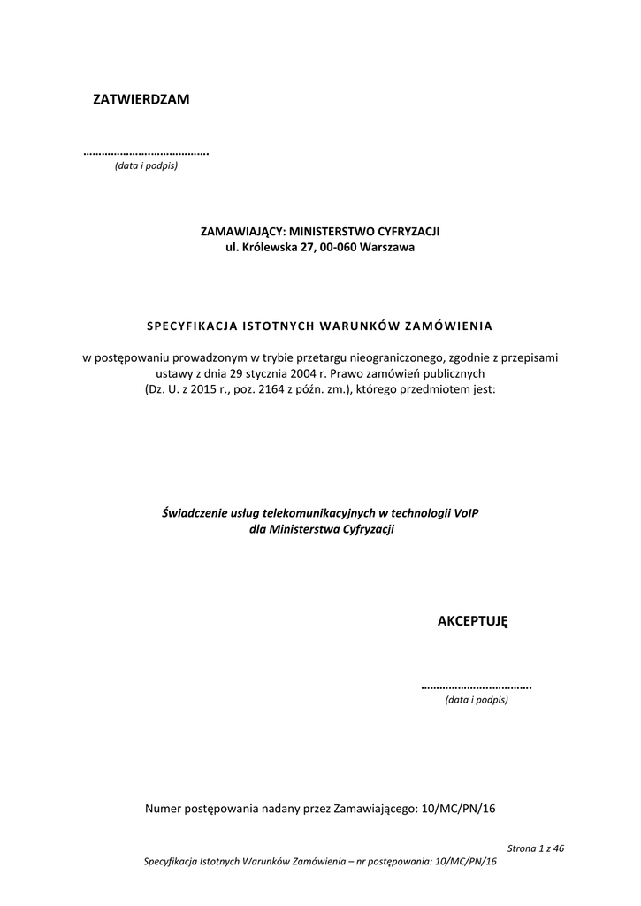 ZATWIERDZAM ………………….………………. (data i podpis) ZAMAWIAJĄCY: MINISTERSTWO CYFRYZACJI ul. Królewska 27, 00-060 Warszawa SPE CYFI K A CJA I STOT NYCH WA RUNK Ó W Z A MÓ WI E NIA w postępowaniu prowadzonym w trybie przetargu nieograniczonego, zgodnie z przepisami ustawy z dnia 29 stycznia 2004 r. Prawo zamówień publicznych (Dz. U. z 2015 r., poz. 2164 z późn. zm.), którego przedmiotem jest: Świadczenie usług telekomunikacyjnych w technologii VoIP dla Ministerstwa Cyfryzacji AKCEPTUJĘ …………………..…………. (data i podpis) AKCEPT Numer postępowania nadany przez Zamawiającego: 10/MC/PN/16 Strona 1 z 46 Specyfikacja Istotnych Warunków Zamówienia – nr postępowania: 10/MC/PN/16 Ilekroć w dalszej części Specyfikacji Istotnych Warunków Zamówienia jest mowa o: „postępowaniu” – należy przez to rozumieć postępowanie prowadzone w trybie przetargu nieograniczonego, którego przedmiotem jest Świadczenie usług telekomunikacyjnych w technologii VoIP dla Ministerstwa Cyfryzacji; „specyfikacji” lub „SIWZ” – należy przez to rozumieć niniejszą Specyfikację Istotnych Warunków Zamówienia wraz z załącznikami; „ustawie” – należy przez to rozumieć ustawę z dnia 29 stycznia 2004 r. - Prawo zamówień publicznych (Dz. U. z 2015 r., poz. 2164 z późn. zm.); „Wykonawcy” – należy przez to rozumieć osobę fizyczną, osobę prawną albo jednostkę organizacyjną nieposiadającą osobowości prawnej, która ubiega się o udzielenie zamówienia, złożyła ofertę lub zawarła umowę w sprawie zamówienia; „Zamawiającym” – należy przez to rozumieć Ministerstwo Cyfryzacji. WPROWADZENIE 1. Postępowanie prowadzone jest na podstawie ustawy z dnia 29 stycznia 2004 r. - Prawo zamówień publicznych (Dz. U. z 2015 r., poz. 2164 z póżn. zm.), zwanej dalej „ustawą”. W zakresie nieuregulowanym poniżej stosuje się przepisy ustawy. 2. Treść oferty musi odpowiadać treści Specyfikacji Istotnych Warunków Zamówienia (SIWZ). 3. Postępowanie prowadzone jest w języku polskim. 4. Postępowanie oznaczone jest znakiem 10/MC/PN/16. Wykonawcy winni we wszelkich kontaktach z Zamawiającym powoływać się na wyżej podane oznaczenie. I. INFORMACJE DODATKOWE 1. Zamawiający nie dopuszcza możliwości składania ofert częściowych. 2. Zamawiający nie dopuszcza składania ofert wariantowych. 3. Zamawiający nie przewiduje możliwości udzielenia zamówień uzupełniających. 4. Postępowanie nie jest prowadzone w celu zawarcia umowy ramowej. 5. Zamawiający dopuszcza udział podwykonawców. W takim wypadku Wykonawca ma obowiązek (zgodnie z art. 36b ust. 1 ustawy) zawrzeć w ofercie (w Formularzu oferty stanowiącym załącznik nr 1 do SIWZ) informacje dotyczące podwykonawstwa. Brak powyższej informacji w ofercie oznaczać będzie, że Wykonawca nie będzie korzystał z podwykonawstwa przy realizacji zamówienia. 6. Zamawiający dopuszcza porozumiewanie się drogą elektroniczną na adres e-mail wskazany w rozdziale VIII SIWZ. 7. Zamawiający nie przewiduje dokonania wyboru najkorzystniejszej oferty z zastosowaniem aukcji elektronicznej, na zasadach określonych w art. 91a – 91c ustawy. 8. Rozliczenia między Zamawiającym a Wykonawcą będą prowadzone w PLN. Zamawiający nie przewiduje rozliczenia w walutach obcych. 9. Zamawiający wymaga od Wykonawcy, aby przy realizacji przedmiotu zamówienia stosownie do art. 29 ust. 4 pkt 4) ustawy Pzp, dotyczącego „klauzuli społecznej”, dedykował do realizacji Umowy opiekuna technicznego Systemu, zatrudnionego na podstawie umowy o pracę w pełnym wymiarze czasu pracy. Wymagania dotyczące zatrudnienia zostały określone w Szczegółowym Opisie Przedmiotu Zamówienia (załącznik nr 7) oraz Istotnych Postanowieniach Umowy (załącznik nr 6). Strona 2 z 46 Specyfikacja Istotnych Warunków Zamówienia – nr postępowania: 10/MC/PN/16 10. Zgodnie z art. 144 ustawy, Zamawiający przewiduje możliwość dokonania zmian Umowy w przypadkach określonych w Istotnych postanowieniach umowy, stanowiących załącznik nr 6 do SIWZ. II. NAZWA ORAZ ADRES ZAMAWIAJĄCEGO Zamawiający: Ministerstwo Cyfryzacji. Adres: Ministerstwo Cyfryzacji, ul. Królewska 27, 00-060 Warszawa. III. TRYB UDZIELENIA ZAMÓWIENIA Postępowanie prowadzone jest w trybie przetargu nieograniczonego. IV. OPIS PRZEDMIOTU ZAMÓWIENIA 1. Przedmiotem zamówienia jest Świadczenie usług telekomunikacyjnych w technologii VoIP dla Ministerstwa Cyfryzacji zgodnie ze Szczegółowym opisem przedmiotu zamówienia, stanowiącym załącznik nr 7 do SIWZ oraz na warunkach określonych w Istotnych postanowieniach umowy, stanowiących załącznik nr 6 do SIWZ. 2. Przedmiot zamówienia określony został we Wspólnym Słowniku Zamówień następującymi kodami i nazwami: 64200000-8 Usługi telekomunikacyjne; 64215000-6 Usługi telefonii internetowej (IP). V. TERMIN WYKONANIA ZAMÓWIENIA Umowa obowiązuje od dnia zawarcia, przy czym Wykonawca zobowiązuje się uruchomić System i świadczyć usługi, o których mowa w § 1 ust. 3 pkt 4 i 5 Istotnych postanowień umowy, z zastrzeżeniem ust. 2 i 3 - od dnia 1 września 2016 r., oraz udostępnić System Zamawiającemu przez okres 24 (dwudziestu czterech) miesięcy od tego dnia lub do wyczerpania maksymalnego wynagrodzenia jeżeli nastąpi to przed upływem ww. terminu. VI. OPIS WARUNKÓW UDZIAŁU W POSTĘPOWANIU ORAZ OPIS SPOSOBU DOKONYWANIA OCENY SPEŁNIANIA TYCH WARUNKÓW O udzielenie zamówienia mogą ubiegać się Wykonawcy spełniający warunki wynikające z art. 22 ust. 1 ustawy i w stosunku do których brak jest podstaw do wykluczenia z powodu nie spełniania warunków, o których mowa w art. 24 ust. 1 ustawy. 1. Opis sposobu dokonania oceny warunków wynikających z art. 22 ust. 1 ustawy: 1.1. w zakresie warunku posiadania uprawnień do wykonywania określonej działalności lub czynności, jeżeli przepisy prawa nakładają obowiązek ich posiadania Zamawiający u