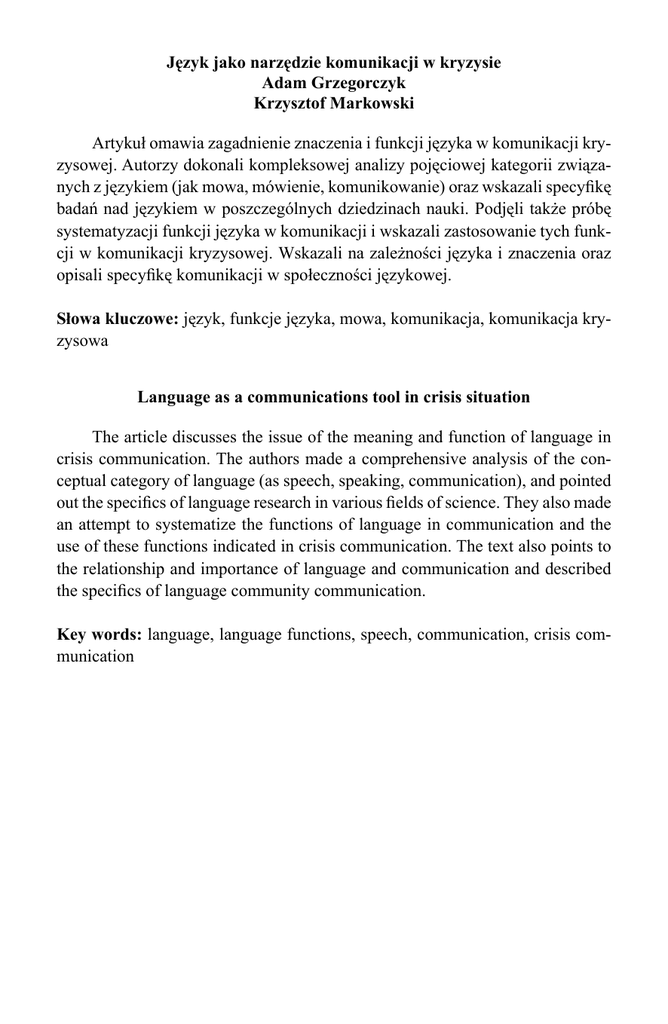 Język jako narzędzie komunikacji w kryzysie Adam Grzegorczyk Krzysztof Markowski Artykuł omawia zagadnienie znaczenia i funkcji języka w komunikacji kryzysowej. Autorzy dokonali kompleksowej analizy pojęciowej kategorii związanych z językiem (jak mowa, mówienie, komunikowanie) oraz wskazali specyfikę badań nad językiem w poszczególnych dziedzinach nauki. Podjęli także próbę systematyzacji funkcji języka w komunikacji i wskazali zastosowanie tych funkcji w komunikacji kryzysowej. Wskazali na zależności języka i znaczenia oraz opisali specyfikę komunikacji w społeczności językowej. Słowa kluczowe: język, funkcje języka, mowa, komunikacja, komunikacja kryzysowa Language as a communications tool in crisis situation The article discusses the issue of the meaning and function of language in crisis communication. The authors made a comprehensive analysis of the conceptual category of language (as speech, speaking, communication), and pointed out the specifics of language research in various fields of science. They also made an attempt to systematize the functions of language in communication and the use of these functions indicated in crisis communication. The text also points to the relationship and importance of language and communication and described the specifics of language community communication. Key words: language, language functions, speech, communication, crisis communication