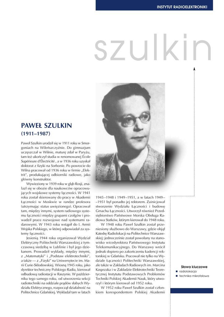 INSTYTUT RADIOELEKTRONIKI szulkin PAWEŁ SZULKIN (1911–1987) Paweł Szulkin urodził się w 1911 roku w Smorgoniach na Wileńszczyźnie. Do gimnazjum uczęszczał w Wilnie, maturę zdał w Paryżu, tam też ukończył studia w renomowanej École Supérieure d'Électricité , a w 1936 roku uzyskał doktorat z fizyki na Sorbonie. Po powrocie do Wilna pracował od 1936 roku w firmie „Elektrit”, produkującej odbiorniki radiowe, jako główny konstruktor. Wywieziony w 1939 roku w głąb Rosji, znalazł się w obozie dla naukowców opracowujących wojskowe systemy łączności. W 1941 roku został skierowany do pracy w Akademii Łączności w Moskwie w randze profesora (utrzymując status uwięzionego). Opracował tam, między innymi, system radiowego systemu łączności między grupami czołgów i prowadził prace rozwojowe nad systemami radarowymi. W 1943 roku wstąpił do I. Armii Wojska Polskiego, w której odpowiadał za systemy łączności. Jesienią 1944 roku organizował Wydział Elektryczny Politechniki Warszawskiej z tymczasową siedzibą w Lublinie i był jego dziekanem. Prowadził wykłady, między innymi, z „Matematyki” i „Podstaw elektrotechniki”, a także — z „Fizyki” na Uniwersytecie im. Marii Curie-Skłodowskiej. Wiosną 1945 roku, jako dyrektor techniczny Polskiego Radia, kierował odbudową radiostacji w Raszynie. W październiku tego samego roku, od utworzenia sekcji radiotechniki na oddziale prądów słabych Wydziału Elektrycznego, rozpoczął działalność na Politechnice Gdańskiej. Wykładał tam w latach 1945 –1948 i 1949 –1951, a w latach 1949 – –1951 był ponadto jej rektorem. Zainicjował stworzenie Wydziału Łączności i budowę Gmachu Łączności. Utworzył również Przedsiębiorstwo Państwowe Morska Obsługa Radiowa Statków, którym kierował do 1948 roku. W 1948 roku Paweł Szulkin został przeniesiony służbowo do Warszawy, gdzie objął Katedrę Radiolokacji na Politechnice Warszawskiej; jednocześnie został powołany na stanowisko wicedyrektora Państwowego Instytutu Telekomunikacyjnego. Do Warszawy wrócił jednak dopiero po zakończeniu kadencji rektorskiej w Gdańsku. Pracował nie tylko na Wydziale Łączności Politechniki Warszawskiej, ale także w Zakładach Radiowych im. Marcina Kasprzaka i w Zakładzie Elektrotechniki Teoretycznej Instytutu Podstawowych Problemów Techniki Polskiej Akademii Nauk, który utworzył i którym kierował od 1952 roku. W 1952 roku Paweł Szulkin został członkiem korespondentem Polskiej Akademii Słowa kluczowe n radiolokacja n technika mikrofalowa INSTYTUT RADIOELEKTRONIKI S Nauk, a na członka rzeczywistego wybrano go w 1961 roku. W latach 1961–1962 pełnił funkcję zastępcy sekretarza naukowego Polskiej Akademii Nauk. Był również jednym z założycieli Polskiego Towarzystwa Elektrotechniki Teoretycznej i Stosowanej i pierwszym przewodniczącym Polskiego Komitetu Narodowego Międzynarodowej Unii Nauk Radiowych (URSI). Lata pięćdziesiąte i początek lat sześćdziesiątych to okres sukcesów polskiej radiolokacji — rozwijającej się w dużym stopniu dzięki jego wiedzy, energii i zdolnościom organizacyjnym. To również okres szybkiego wzrostu potencjału kadrowego tej dziedziny, i w tym przypadku z jego ogromnym udziałem — jako promotora doktoratów oraz opiekuna licznych prac magisterskich i inżynierskich. W latach sześćdziesiątych Paweł Szulkin pracował i wykładał na uczelniach w Paryżu (między innymi na Sorbonie) i w Algierze (był pierwszym rektorem tamtejszej politechniki); kierował również paryską stacją Polskiej Akademii Nauk. Od 1966 roku pełnił funkcję dyrektora Departamentu ds. Nauki UNESCO. W latach sześćdziesiątych ukazały się też jego cztery monografie: Statystyczne metody wyznaczania parametrów sygnałów radiolokacyjnych (Wyd. PAN, 1962), Podstawy teorii pola elektromagnetycznego (współautor — S. Pogorzelski, WNT, 1964), Leçons sur la théorie des ondes électromagnétiques (PWN, 1964) i Statystyczna optymalizacja systemów liniowych o wielu zmiennych (Instytut Podstawowych Problemów Techniki Polskiej Akademii Nauk, 1967). Po wydarzeniach 1968 roku nie uzyskał zgody na powrót na Politechnikę Warszawską i nie przyjął wcześniejszej emerytury. Zrezygnował ze stanowiska w UNESCO i pozostał we Francji. W latach siedemdziesiątych wykładał, między innymi, w École Centrale w Lyonie (prowadził zajęcia na studiach doktoranckich). Zmarł w Lyonie w 1987 roku i został pochowany na cmentarzu Père-Lachaise w Paryżu. Jego syn Piotr, reżyser i scenarzysta, jest profesorem sztuki filmowej w Państwowej Wyższej Szkole Filmowej, Telewizyjnej i Teatralnej im. Leona Schillera w Łodzi.