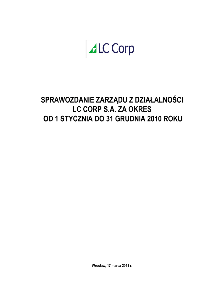 SPRAWOZDANIE ZARZĄDU Z DZIAŁALNOŚCI LC CORP S.A. ZA OKRES OD 1 STYCZNIA DO 31 GRUDNIA 2010 ROKU Wrocław, 17 marca 2011 r. Sprawozdanie z działalności LC Corp S.A. w okresie od 1.01.2010 r. do 31.12.2010 r. Zasady sporządzenia rocznego sprawozdania finansowego LC Corp S.A. Zgodnie z przepisami ustawy o rachunkowości z dnia 29 września 1994 r. Zarząd jest zobowiązany zapewnić sporządzenie rocznego sprawozdania z działalności Spółki w okresie obrotowym obejmującego istotne informacje o stanie majątkowym, sytuacji finansowej, ocenę uzyskiwanych efektów oraz wskazanie czynników ryzyka i opis zagrożeń. Niniejsze sprawozdanie z działalności LC Corp S.A. (dalej zwana „LC Corp”, „Spółką” lub „Emitentem”) obejmuje okres od 1 stycznia do 31 grudnia 2010 r. Raport roczny LC Corp S.A. za okres sprawozdawczy od dnia 01.01.2010 r. do dnia 31.12.2010 r. zawiera: • Sprawozdanie finansowe LC Corp S.A. za okres sprawozdawczy od 01.01.2010 r. do 31.12.2010 r. oraz na dzień 31.12.2010 r. sporządzone zgodnie z Międzynarodowymi Standardami Sprawozdawczości Finansowej, w tym: sprawozdanie z sytuacji finansowej, sprawozdanie z całkowitych dochodów, sprawozdanie z przepływów pieniężnych, sprawozdanie ze zmian w kapitale własnym oraz noty objaśniające do sprawozdania finansowego. • Porównawcze dane finansowe do sprawozdania finansowego na dzień 31.12.2009 r. oraz za okres 12 miesięcy zakończony 31.12.2009 r. • Sprawozdanie Zarządu z działalności LC Corp S.A. za okres od 01.01.2010 r.do 31.12.2010 r.. • Oświadczenia Zarządu zgodnie z § 91 ust. 1 pkt 5) i 6) Rozporządzenia Ministra Finansów z dnia 19 lutego 2009 r. w sprawie informacji bieżących i okresowych przekazywanych przez emitentów papierów wartościowych oraz warunków uznawania za równoważne informacji wymaganych przepisami prawa państwa nie będącego państwem członkowskim. 1. PODSTAWOWE INFORMACJE O SPÓŁCE LC Corp S.A. (dalej również jako „LC Corp”, „Spółka” lub „Emitent”) została utworzona aktem notarialnym dnia 3 marca 2006 r. i wpisana w dniu 15 marca 2006 r. do Krajowego Rejestru Sądowego prowadzonego przez Sąd Rejonowy dla Wrocławia – Fabrycznej we Wrocławiu, VI Wydział Gospodarczy Krajowego Rejestru Sądowego pod numerem KRS 0000253077. Siedziba Spółki dominującej mieści się w Polsce we Wrocławiu, ul. Powstańców Śląskich 2-4. Spółce nadano numer statystyczny REGON 020246398. Czas trwania Spółki jest nieoznaczony. Podstawowym przedmiotem działania Spółki jest działalność holdingów finansowych (PKD 64.20.Z) Podmiotem dominującym spółki LC Corp S.A. jest LC Corp B.V., która jest kontrolowana przez Pana Leszka Czarneckiego. Spółka jest jednostką dominującą wobec następujących podmiotów wchodzących w skład grupy kapitałowej LC Corp (dalej również jako „Grupa”) na dzień 31.12.2010 r.: • Arkady Wrocławskie S.A. - z siedzibą we Wrocławiu, ul. Powstańców Śl. 2-4, • Katowice Ceglana Sp. z o.o. - z siedzibą we Wrocławiu, ul. Powstańców Śl. 2-4, • Vratislavia Residence Sp. z o.o. - z siedzibą we Wrocławiu, ul. Powstańców Śl. 2-4, • LC Corp Dębowa Ostoja Sp. z o.o. - z siedzibą we Wrocławiu, ul. Powstańców Śl. 2-4, • LC Corp Bajkowy Park Sp. z o.o. - z siedzibą we Wrocławiu, ul. Powstańców Śl. 2-4, • LC Corp Szmaragdowe Wzgórze Sp. z o.o. - z siedzibą we Wrocławiu, ul. Powstańców Śl. 2-4, • LC Corp Invest XII Sp. z o.o. - z siedzibą we Wrocławiu, ul. Powstańców Śl. 2-4, (do dnia 24 listopada 2010 r. spółka działająca pod firmą LC Corp Stabłowice Sp. z o.o.), • LC Corp Osiedle Pustynna Sp. z o.o. - z siedzibą we Wrocławiu, ul. Powstańców Śl. 2-4, • Warszawa Przy Promenadzie Sp. z o.o. - z siedzibą we Wrocławiu, ul. Powstańców Śl. 2-4, • Warszawa Przy Promenadzie Sp. z o.o. Sp.k. - z siedzibą we Wrocławiu, ul. Powstańców Śl. 2-4, • Warszawa Przyokopowa Sp. z o.o. - z siedzibą we Wrocławiu, ul. Powstańców Śl. 2-4, • Warszawa Rezydencja Kaliska Sp. z o.o. - z siedzibą we Wrocławiu, ul. Powstańców Śl. 2-4, • Kraków Zielony Złocień Sp. z o.o. - z siedzibą we Wrocławiu, ul. Powstańców Śl. 2-4, • LC Corp Invest XIV Sp. z o.o. – z siedzibą we Wrocławiu, ul. Powstańców Śląskich 2-4, (do dnia 16 grudnia 2010 r. spółka działająca pod firmą LC Corp Pustynna Sp. z o.o.), • LC Corp Invest XV Sp. z o.o. – z siedzibą we Wrocławiu, ul. Powstańców Śląskich 2-4. 2 Sprawozdanie z działalności LC Corp S.A. w okresie od 1.01.2010 r. do 31.12.2010 r. Kapitały akcyjny i akcjonariat LC Corp S.A. na dzień 31 grudnia 2010 r. Kapitał zakładowy LC Corp na dzień 31 grudnia 2010 r. wynosił 447.558.311 zł i dzielił się na 447.558.311 akcji zwykłych na okaziciela uprawniających do wykonywania jednego głosu z każdej akcji na Walnym Zgromadzeniu o wartości nominalnej 1 zł każda. Wykaz akcjonariuszy posiadających co najmniej 5% głosów na Walnym Zgromadzeniu Liczba posiadanyc h akcji Liczba głosów Udział % w kapitale zakładowym Leszek Czarnecki bezpośrednio i pośrednio* w tym: LC Corp B.V. z siedzibą w Amsterdamie 229.126.674 229.126.674 51,19% Udział % głosów na walnym zgromadzeniu 51,19% 214.701.110 214.701.110 47,97% 47,97% ING Otwarty Fundusz Emerytalny 32.684.371 32.684.371 7.30% 7,30% AVIVA Otwarty Fundusz Emerytalny AVIVA BZ WBK 55.000.000 55.000.000 12.29% 12,29% Akcjonariusz * Pan Leszek Czarnecki posiada bezpośrednio 14.424.564 akcji stanowiących 3,22% kapitału zakładowego i 3,22% udziału w głosach na Walnym Zgromadzeniu oraz pośrednio poprzez podmioty od siebie zależne Pan Leszek Czarnecki posiada 214.702.110 akcji stanowiących 47,97% kapitału zakładowego i 47,97% udziału w głosach na Walnym Zgromadzeniu. Podmiotem zależnym od Pana Leszka Czarneckiego są LC Corp B.V z siedzibą w Amsterdamie posiadająca 214.701.110 akcji stanowiących 47,97% kapitału zakładowego i 4
