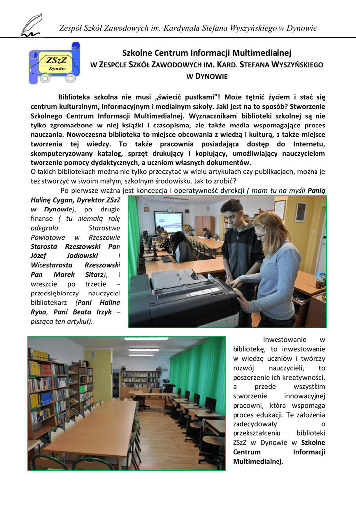 Zespół Szkół Zawodowych im. Kardynała Stefana Wyszyńskiego w Dynowie Szkolne Centrum Informacji Multimedialnej W ZESPOLE SZKÓŁ ZAWODOWYCH IM. KARD. STEFANA WYSZYŃSKIEGO W DYNOWIE Biblioteka szkolna nie musi „świecid pustkami”! Może tętnid życiem i stad się centrum kulturalnym, informacyjnym i medialnym szkoły. Jaki jest na to sposób? Stworzenie Szkolnego Centrum Informacji Multimedialnej. Wyznacznikami biblioteki szkolnej są nie tylko zgromadzone w niej książki i czasopisma, ale także media wspomagające proces nauczania. Nowoczesna biblioteka to miejsce obcowania z wiedzą i kulturą, a także miejsce tworzenia tej wiedzy. To także pracownia posiadająca dostęp do Internetu, skomputeryzowany katalog, sprzęt drukujący i kopiujący, umożliwiający nauczycielom tworzenie pomocy dydaktycznych, a uczniom własnych dokumentów. O takich bibliotekach można nie tylko przeczytad w wielu artykułach czy publikacjach, można je też stworzyd w swoim małym, szkolnym środowisku. Jak to zrobid? Po pierwsze ważna jest koncepcja i operatywnośd dyrekcji ( mam tu na myśli Panią Halinę Cygan, Dyrektor ZSzZ w Dynowie), po drugie finanse ( tu niemałą rolę odegrało Starostwo Powiatowe w Rzeszowie Starosta Rzeszowski Pan Józef Jodłowski i Wicestarosta Rzeszowski Pan Marek Sitarz), i wreszcie po trzecie – przedsiębiorczy nauczyciel bibliotekarz (Pani Halina Ryba, Pani Beata Irzyk – pisząca ten artykuł). Inwestowanie w bibliotekę, to inwestowanie w wiedzę uczniów i twórczy rozwój nauczycieli, to poszerzenie ich kreatywności, a przede wszystkim stworzenie innowacyjnej pracowni, która wspomaga proces edukacji. Te założenia zadecydowały o przekształceniu biblioteki ZSzZ w Dynowie w Szkolne Centrum Informacji Multimedialnej. Zespół Szkół Zawodowych im. Kardynała Stefana Wyszyńskiego w Dynowie Proces jej przeobrażania trwał kilka lat. Pierwszy etap zmian polegał na doposażeniu biblioteki w telewizor, magnetowid, odtwarzacz płyt DVD, rzutnik pisma. Następny etap obejmował jej komputeryzację, stworzenie bazy danych o zbiorach w oparciu o program MOL, a później MOL 2000+, oraz automatyzację rejestracji wypożyczeo. Kolejnym ważnym krokiem było podłączenie do Internetu i stworzenie kilku stanowisk komputerowych do wyszukiwania informacji. Oprócz tradycyjnych dokumentów bibliotecznych (książki i czasopisma), stale gromadzone były i są, multimedialne pomoce dydaktyczne (encyklopedie, słowniki, filmy edukacyjne). Dziś SCIM posiada tablicę interaktywną z projektorem, 9 stanowisk komputerowych z dostępem do Internetu, urządzenie wielofunkcyjne Konica Minolta. Wymienione wyposażenie biblioteki (regały, stoliki, oświetlenie), wpłynęło na zmianę jej oblicza, które stało się nowoczesne, przyjazne i komfortowe dla użytkowników. Zespół Szkół Zawodowych im. Kardynała Stefana Wyszyńskiego w Dynowie To nie koniec zmian. Niedługo w Internecie zostanie udostępniony katalog biblioteczny z opisem zbiorów bibliograficznych, a zakupiony czytnik kodów książkowych przyspieszy rejestrację wypożyczeo i zwrotów. Przed nami wprowadzenie kodów kreskowych książek do bazy danych. Proces przekształcania biblioteki okazał się żmudny i długotrwały. Efekty są jednak zadowalające i napawają optymizmem. Uczniowie przychodzą do SCIM nie tylko po książki, ale po to, aby „posurfowad” w sieci, czy wypożyczyd film. Przekształcenie biblioteki ZSzZ w Dynowie w centrum multimedialne nie jest jedynie kwestią zmiany nazwy czy zainstalowania komputerów i wymiany mebli. Szkolne Centrum Informacji Multimedialnej to pracownia wszechstronnie wykorzystywana w wzajemnej relacji: bibliotekarz – uczeo – nauczyciele przedmiotów. Warto zaznaczyd, że przeobrażenie biblioteki wymusiło zmianę pracy nauczyciela bibliotekarza. Stał się on przewodnikiem użytkowników po zasobach informacyjnych (pisemnych, audiowizualnych, multimedialnych, internetowych). Zmiana była konieczna, ponieważ współczesnemu uczniowi nie wystarcza już w poszerzaniu wiedzy słowo drukowane w postaci książki czy czasopisma, ma on większe oczekiwania i wymagania. Dzięki nowatorskiemu spojrzeniu Pani Dyrektor Haliny Cygan na rolę i funkcjonowanie biblioteki szkolnej udało się, niemałym nakładem finansowym, zrealizowad przedsięwzięcie, którym nie każda szkoła może się pochwalid. Beata Irzyk ZSzZ w Dynowie