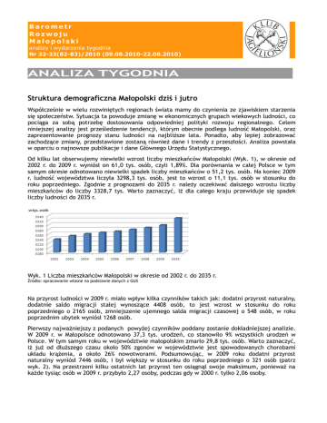 Barometr Rozwoju Małopolski analizy i wydarzenia tygodnia Nr 32-33(82-83)/2010 (09.08.2010-22.08.2010) ANALIZA TYGODNIA IS Struktura demograficzna Małopolski dziś i jutro Współcześnie w wielu rozwiniętych regionach świata mamy do czynienia ze zjawiskiem starzenia się społeczeństw. Sytuacja ta powoduje zmianę w ekonomicznych grupach wiekowych ludności, co pociąga za sobą potrzebę dostosowania odpowiedniej polityki rozwoju regionalnego. Celem niniejszej analizy jest prześledzenie tendencji, którym obecnie podlega ludność Małopolski, oraz zaprezentowanie prognozy stanu ludności na najbliższe lata. Ponadto, aby lepiej zobrazować zachodzące zmiany, przedstawione zostaną również dane i trendy z przeszłości. Analiza powstała w oparciu o najnowsze publikacje i dane Głównego Urzędu Statystycznego. Od kilku lat obserwujemy niewielki wzrost liczby mieszkańców Małopolski (Wyk. 1), w okresie od 2002 r. do 2009 r. wyniósł on 61,0 tys. osób, czyli 1,89%. Dla porównania w całej Polsce w tym samym okresie odnotowano niewielki spadek liczby mieszkańców o 51,2 tys. osób. Na koniec 2009 r. ludność województwa liczyła 3298,3 tys. osób, jest to wzrost o 11,1 tys. osób w stosunku do roku poprzedniego. Zgodnie z prognozami do 2035 r. należy oczekiwać dalszego wzrostu liczby mieszkańców do liczby 3328,7 tys. Warto zaznaczyć, iż dla całego kraju przewiduje się spadek liczby ludności do 2035 r. Wyk. 1 Liczba mieszkańców Małopolski w okresie od 2002 r. do 2035 r. Źródło: opracowanie własne na podstawie danych z GUS Na przyrost ludności w 2009 r. miało wpływ kilka czynników takich jak: dodatni przyrost naturalny, dodatnie saldo migracji stałej wynoszące 4408 osób, to jest wzrost w stosunku do roku poprzedniego o 2165 osób, zmniejszenie ujemnego salda migracji czasowej o 548 osób, w roku poprzednim ubytek wyniósł 1268 osób. Pierwszy najważniejszy z podanych powyżej czynników poddany zostanie dokładniejszej analizie. W 2009 r. w Małopolsce odnotowano 37,3 tys. urodzeń, co stanowiło 9% wszystkich urodzeń w Polsce. W tym samym roku w województwie małopolskim zmarło 29,8 tys. osób. Warto zaznaczyć, iż już od dłuższego czasu około 50% zgonów w województwie jest spowodowanych chorobami układu krążenia, a około 26% nowotworami. Podsumowując, w 2009 roku dodatni przyrost naturalny wyniósł 7446 osób, i był większy w stosunku do roku poprzedniego o 321 osób (patrz wyk. 2). Na przestrzeni kilku ostatnich lat przyrost ten osiągnął swoje maksimum, ponieważ na każde tysiąc osób w 2009 r. przybyło 2,27 osoby, podczas gdy w 2000 r. tylko 2,06 osoby. Barometr Rozwoju Małopolski analizy i wydarzenia tygodnia Nr 32-33(82-83)/2010 (09.08.2010-22.08.2010) Wyk. 2 Ruch naturalny ludności Małopolski w latach 2002-2009. Źródło: „STAN I RUCH NATURALNY LUDNOŚĆI MAŁOPOLSKI W 2009 R.” GUS, KRAKÓW 2010 r. Obecnie ludność województwa małopolskiego stanowi 8,6 % ogółu ludności Polski. Wraz z rosnącą 2 ilością osób wiąże się wzrost gęstości zaludnienia, który w 2009 r. wyniósł 217 osób/km , i był 2 wyższy od średniej krajowej o 95 osób/km . Bardziej zaludnionym województwem w Polsce jest tylko śląskie. Przeciętne trwanie życia mieszkańców Małopolski w 2009 r. wyniosło 73,1 lat dla mężczyzn, oraz 81,1 lat dla kobiet. Oznacza to, że statystyczny mieszkaniec Małopolski, żyje dłużej niż przeciętny Polak, w przypadku płci męskiej o 1,8 roku, a płci żeńskiej o 2,3 roku. W ciągu ostatnich 19 lat nastąpiła znaczna zmiana przeciętnej długości życia w województwie (patrz wyk. 3). Przyjmując jako rok bazowy 1990 mężczyźni żyją obecnie dłużej o 5,1 roku, natomiast kobiety o 4,4 roku. Zgodnie z prognozami przeciętne trwanie życia będzie się zwiększać i w 2035 roku dla mężczyzn ma wynieść 77,5 roku, a dla kobiet 83,5 roku. Wyk.3 Przeciętne trwanie życia ludności w Małopolsce w latach 1990-2035. Źródło: Opracowanie własne na podstawie danych z GUS Mediana wieku populacji jest jednym z najważniejszych mierników stopnia zaawansowania procesu starzenia społeczeństwa. Dla mieszkańców Małopolski w 2009 roku wyniosła ona 36,6 lat, czyli ludność stała się społeczeństwem starym demograficznie. Wyniki prognoz wskazują, że w 2020 roku mediana wieku wyniesie 40,4 lata, a w 2035 roku będzie to aż 46,8 lat. Oznacza to, iż co drugi mieszkaniec województwa będzie miał powyżej 46,8 lat. Drugim ważnym czynnikiem procesu starzenia społeczeństwa jest udział procentowy osób w wieku poprodukcyjnym (kobiety 60 lat i więcej, mężczyźni 65 lat i więcej) w całej populacji. Na początku stulecia grupa ta stanowiła 14,8% populacji Małopolski, natomiast na koniec 2009 roku Barometr Rozwoju Małopolski analizy i wydarzenia tygodnia Nr 32-33(82-83)/2010 (09.08.2010-22.08.2010) już 16,3%. Tendencja wzrostu liczby osób w wieku poprodukcyjnym nie ulegnie zmianie i w 2020 r. prognozuje się, że grupa ta będzie stanowić 20,6% całej populacji, a w 2035 r. 25,5% (patrz wyk. 4). Dla grupy w wieku przedprodukcyjnym (od 0 do 17 lat) obserwowana jest natomiast tendencja malejąca. Systematycznie zmniejsza się ilość dzieci i młodzieży. Na początku stulecia procentowy udział tej grupy w całej populacji województwa wynosił 25,4%. W roku 2009 zmniejszył się do poziomu 20%. Wyniki prognoz wskazują, iż trend malejący będzie się utrzymywał i w 2020 r. grupa w wieku przedprodukcyjnym będzie stanowić 18,8% całej populacji, a w roku 2035 tylko 16,2%. W grupie osób w wieku produkcyjnym (18-59 lat kobiety i 18-64 lata mężczyźni) na początku stulecia znajdowało się 59,8% populacji województwa. Na koniec 2009 r. grupa zwiększyła swój udział do 63,7%. Prognozuje się, iż w roku 2020 w wieku produkcyjnym będzie 60,6% populacji, a w roku 2035 tylko 58,3%. Warto zwrócić uwagę na to, że będziemy mieli do czynienia w najbliższych lat