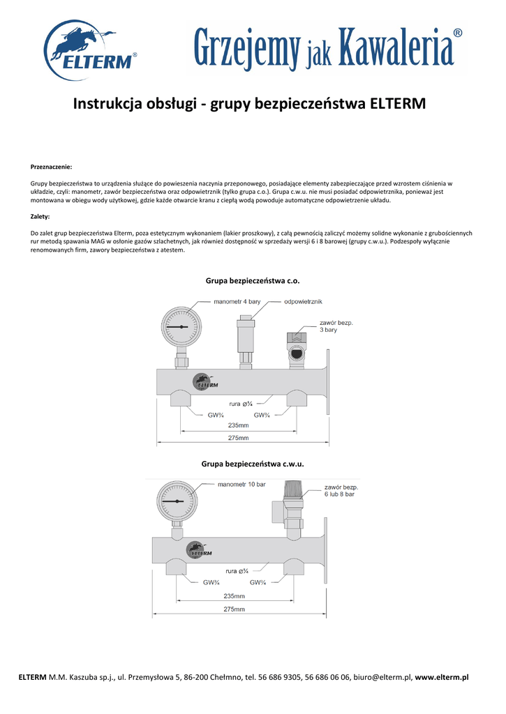 Instrukcja obsługi - grupy bezpieczeństwa ELTERM Przeznaczenie: Grupy bezpieczeństwa to urządzenia służące do powieszenia naczynia przeponowego, posiadające elementy zabezpieczające przed wzrostem ciśnienia w układzie, czyli: manometr, zawór bezpieczeństwa oraz odpowietrznik (tylko grupa c.o.). Grupa c.w.u. nie musi posiadać odpowietrznika, ponieważ jest montowana w obiegu wody użytkowej, gdzie każde otwarcie kranu z ciepłą wodą powoduje automatyczne odpowietrzenie układu. Zalety: Do zalet grup bezpieczeństwa Elterm, poza estetycznym wykonaniem (lakier proszkowy), z całą pewnością zaliczyć możemy solidne wykonanie z grubościennych rur metodą spawania MAG w osłonie gazów szlachetnych, jak również dostępność w sprzedaży wersji 6 i 8 barowej (grupy c.w.u.). Podzespoły wyłącznie renomowanych firm, zawory bezpieczeństwa z atestem. Grupa bezpieczeństwa c.o. Grupa bezpieczeństwa c.w.u. ELTERM M.M. Kaszuba sp.j., ul. Przemysłowa 5, 86-200 Chełmno, tel. 56 686 9305, 56 686 06 06, [email protected], www.elterm.pl GWARANCJA  Producent udziela gwarancji na sprawne działanie produktu na okres 2 lat (24 miesiące) od daty sprzedaży.  Naprawy gwarancyjne wykonuje producent lub uprawniony przez niego przedstawiciel.  Gwarancja wygasa, jeśli bez zgody producenta dokonane będą jakiekolwiek przeróbki wyrobu lub wyrób będzie eksploatowany niezgodnie z przeznaczeniem. W tym przypadku producent nie bierze odpowiedzialności za jakiekolwiek negatywne skutki eksploatacji wyrobu.  Należy ściśle zastosować się do instrukcji montażu i eksploatacji sprzęgła, a w szczególności do maksymalnych parametrów technicznych podanych w karcie katalogowej. Niezastosowanie się do ww. powoduje utratę gwarancji.  Gwarancja wypełniona niekompletnie jest nieważna.  Szczegółowe przypadki nieobjęte tą gwarancją reguluje Kodeks Cywilny. Pieczęć producenta Data sprzedaży Pieczęć i podpis sprzedawcy Deklaracja zgodności nr 1/2016 Elterm M.M. Kaszuba Sp.J., ul. Przemysłowa 5, 86-200 Chełmno Deklarujemy z pełną odpowiedzialnością, że wyroby: • grupy bezpieczeństwa: GBCO 3 bar; GBCWU 6 bar/8bar; GBCWU INOX 6bar/8bar • kolektory rozdzielające: 2-drogowe; 3-drogowe oraz wykonane na specjalne zamówienie • dozowniki chemiczne: DCE 3,5l; DCE 5l; DCE 10l; DCE 15l; DCE 25l • filtroodmulniki magnetyczne: Dryl 37 25/76; Dryl 60 32/89; Dryl 95 40/114; Dryl 144 50/133 • zewnętrzne wężownice schładzające: Strażnik 32 40/133; Strażnik 45 50/133 wyprodukowane w przedsiębiorstwie ELTERM, są zgodne z postanowieniami dyrektywy ciśnieniowej 2014/68/UE; norma zharmonizowana: PN-EN 13445(U): Nieogrzewane płomieniem zbiorniki ciśnieniowe z późniejszymi zmianami oraz zgodne z Rozp. Min. Gospodarki z 11.02.2015 w sprawie zasadniczych wymagań dla urządzeń ciśnieniowych i zespołów urządzeń ciśnieniowych (Dz.U.2015 poz. 244). Zastosowania procedura oceny zgodności: Wewnętrzna kontrola produkcji – moduł A (zgodnie z 2014/68/UE – urządzenia kategorii nie większej niż I). Stosować do wody o T<110°C, pozostałe maksymalne parametry pracy i wymiary na odwrocie instrukcji lub w kartach katalogowych dostępnych na www.elterm.pl Chełmno, 19 lipca 2016 ELTERM M.M. Kaszuba sp.j., ul. Przemysłowa 5, 86-200 Chełmno, tel. 56 686 9305, 56 686 06 06, [email protected], www.elterm.pl