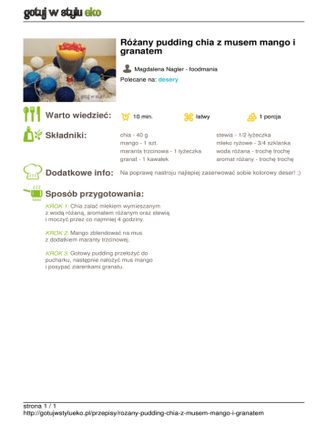 Różany pudding chia z musem mango i granatem Magdalena Nagler - foodmania Polecane na: desery Warto wiedzieć: 10 min. łatwy 1 porcja Składniki: chia - 40 g mango - 1 szt. maranta trzcinowa - 1 łyżeczka granat - 1 kawałek Dodatkowe info: Na poprawę nastroju najlepiej zaserwować sobie kolorowy deser! ;) stewia - 1/2 łyżeczka mleko ryżowe - 3/4 szklanka woda różana - trochę trochę aromat różany - trochę trochę Sposób przygotowania: KROK 1: Chia zalać mlekiem wymieszanym z wodą różaną, aromatem różanym oraz stewią i moczyć przez co najmniej 4 godziny. KROK 2: Mango zblendować na mus z dodatkiem maranty trzcinowej. KROK 3: Gotowy pudding przełożyć do pucharku, następnie nałożyć mus mango i posypać ziarenkami granatu. strona 1 / 1 http://gotujwstylueko.pl/przepisy/rozany-pudding-chia-z-musem-mango-i-granatem Powered by TCPDF (www.tcpdf.org)