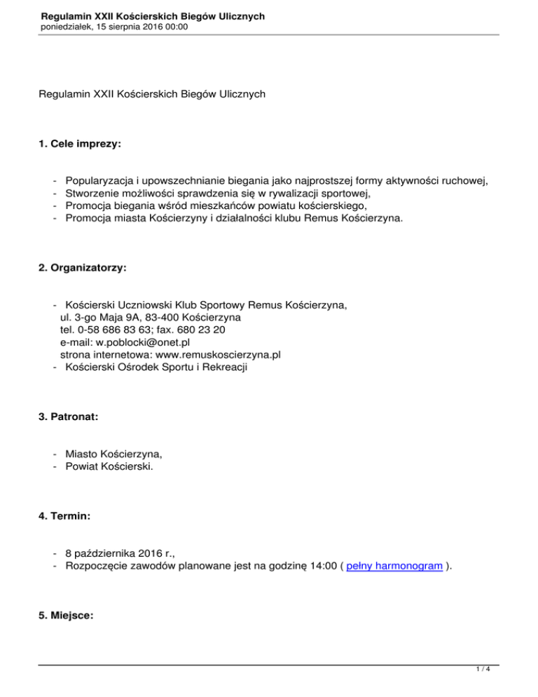 Regulamin XXII Kościerskich Biegów Ulicznych