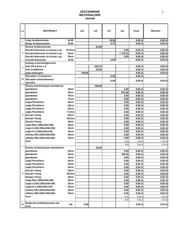 ZESTAWIENIE MATERIA OWE Jamnik L.p. 1 2 3 3a 4 MATERIA Y awy fundamentowe Stopy fundamentowe ciany fundamentowe bloczki betonowe na cian bloczki betonowe na cian bloczki betonowe na cian monolit betonowy Izolacje przeciwwilgociowe folia PE 0,3mm x 3 folia kube kowa papa izolacyjna Styropian ( fundament ) Styropian ekstrudowany / styrodur ciany konstrukcyjne zewn gazobeton gazobeton gazobeton gazobeton ceg a Porotherm ceg a Porotherm ceg a Porotherm ceg a Porotherm bloczki Ytong bloczki Ytong bloczki Ytong ceg a Max (288x220x188) ceg a U-220 (250x220x185) ceg a K-3 (250x220x120) silikaty N24 (250x240x220) silikaty N28 (250x180x220) Inne: mb B-20 B-20 m3 Cena szt 16,28 0,72 Warto 0,00 z 0,00 z 0,00 z 0,00 z 0,00 0,00 z 0,00 z 0,00 z 0,00 z 0,00 z 0,00 z 0,00 z 0,00 z 0,00 z 0,00 z 0,00 z 0,00 0,00 z 0,00 z 0,00 z 0,00 z 0,00 0,00 z 0,00 z 0,00 z 0,00 z 0,00 z 0,00 z 0,00 z 0,00 z 0,00 z 0,00 z 0,00 z 0,00 z 0,00 z 0,00 z 0,00 z 0,00 z 0,00 z 0,00 z 0,00 z 0,00 z 0,00 z 0,00 z 0,00 z 0,00 z 0,00 z 0,00 z 0,00 z 0,00 z 0,00 z 0,00 z 0,00 z 0,00 z 0,00 z 0,00 z 63,00 o gr. o gr. o gr. 9(12)cm 24cm 38cm B-20 0,00 1 178,10 0,00 422,10 42,00 148,00 trzne ciany konstrukcyjne wewn trzne gazobeton gazobeton gazobeton ceg a Porotherm ceg a Porotherm ceg a Porotherm bloczki Ytong 5 bloczki Ytong bloczki Ytong ceg a Max (288x220x188) ceg a U-220 (250x220x185) ceg a K-3 (250x220x120) silikaty N24 (250x240x220) silikaty N28 (250x180x220) Inne: 5a m2 1 Nadpro e prefabrykowane lub Inne: 126,00 30cm 24cm 18cm 12cm 44cm 30cm 25cm 11,5cm 40cm 36,5cm 30cm 29cm 25cm 25cm 24cm 18cm 0,00 831,60 0,00 0,00 0,00 0,00 0,00 0,00 0,00 0,00 0,00 0,00 0,00 0,00 0,00 0,00 0,00 0,00 z 0,00 z 0,00 0,00 z 0,00 z 0,00 165,00 0,00 0,00 0,00 0,00 0,00 0,00 0,00 0,00 0,00 0,00 0,00 0,00 0,00 z 0,00 z 0,00 z 0,00 z 0,00 z 0,00 z 0,00 z 0,00 z 0,00 z 0,00 z 0,00 z 0,00 z 0,00 z 0,00 z 0,00 z 0,00 z 0,00 z 0,00 z 0,00 z 0,00 z 0,00 z 0,00 z 0,00 z 0,00 z 0,00 z 0,00 z 0,00 z 0,00 z 25,00 30cm 24cm 18cm 44cm 30cm 25cm 40cm 36,5cm 30cm 29cm 25cm 25cm 24cm 18cm mb 0,00 0,00 0,00 z 0,00 z 0,00 0,00 z 0,00 z 0,00 z 0,00 z ZESTAWIENIE MATERIA OWE Jamnik L.p. MATERIA Y 7 ciany os onowe i dekoracyjne ceg a klinkierowa ok adzina z p ytek ( itp..) 6cm 12cm 11,5cm 11,5cm 6,5cm 12cm 12cm 6cm 12cm 6cm 12cm 12cm 6,5cm upy elbetowe Wylewki powierzchniowe podk ad fundamentowy szlichta piwnicy 14 szlichta parteru szlichta pi tra nadbeton stropu 0,00 0,00 0,00 0,00 0,00 0,00 0,00 0,00 0,00 0,00 Warto 0,00 0,00 z 0,00 z 0,00 z 0,00 z 0,00 z 0,00 z 0,00 z 0,00 z 0,00 z 0,00 z 0,00 z 0,00 z 0,00 z 0,00 z 0,00 z 0,00 z 0,00 z 0,00 z 0,00 z 0,00 z 0,00 z 0,00 z 0,00 z 0,00 z 0,00 z 0,00 z 0,00 0,00 0,00 z 0,00 z 0,00 0,00 0,00 z 0,00 z 0,00 0,00 z 0,00 z 0,00 0,00 z 0,00 z 0,00 z 0,00 z 0,00 z 0,00 z 0,00 z 0,00 z 0,00 z 0,00 z 0,00 z 0,00 z 763,00 0,00 0,00 132,50 11,00 0,00 0,00 z 0,00 z 0,00 0,00 z 0,00 z 8,79 0,00 z 0,00 z 6,90 0,00 z 0,00 z B-20 10,28 0,00 z 0,00 z B-20 0,00 0,00 z 0,00 z B-20 0,43 0,00 z 0,00 z B-7,5 B-15 B-15 B-15 B-20 7,77 0,00 7,84 0,00 0,00 0,00 z 0,00 z 0,00 z 0,00 z 0,00 z 0,00 z 0,00 z 0,00 z 0,00 z 0,00 z 9 13 316,80 204,60 0,00 0,00 0,00 0,00 0,00 0,00 0,00 0,00 0,00 0,00 0,00 48,00 31,00 12/6cm Kominy ceg a pe na ceg a klinkierowa wk ady Schiedel 8 kszta tki wentylacyjne kszta tki ceramiczne Inne: Zaprawa murarska cementowo-wapienna Zaprawa wapienna 10 tynki Wylewki betonowe 11 ( podci gi,nadpro a,wylewki, wie ce,schody ) 12 yta elbetowa Cena szt 79,00 w tym: ciany dzia owe gazobeton gazobeton ceg a Porotherm bloczki Ytong pustak PD-1 (250x220x65) pustak PD-2 (250x220x120) 6 ceg a kratówka K-1 (250x65x120) ceg a dziurawka ceg a dziurawka ceg a pe na ceg a pe na silikaty N12 (250x120x220) silikaty N6,5 (250x65x220) Inne: m3 m2 mb 2 ZESTAWIENIE MATERIA OWE Jamnik L.p. 15 MATERIA Y 1 0,00 0,00 0,00 0,00 0,00 0,00 0,00 0,00 0,00 0,00 0,00 0,00 0,00 0,00 0,00 0,00 0,00 0,00 0,00 0,00 0,00 0,00 0,00 0,00 0,00 3 4 5 6 7 8 9 10 11 12 13 14 15 16 17 18 19 20 21 22 23 24 25 15b 16 17 18 m2 m3 szt Cena Warto Stropy g sto ebrowe belki stropowe o d ugo ciach: 2 15a mb 3 Pustaki stropowe Strop monolityczny beton stal zbrojeniowa Zasypka piaskowa awy fundamenty Ok adziny styropianowe cian o grubo ci o grubo ci o grubo ci o grubo ci o grubo ci Ok adzina z we ny mineralnej Ok adzina z we ny mineralnej Ocieplenie szlicht piwnica - styropian parter - styropian pi tro - styropian pi tro - styropian m m m m m m m m m m m m m m m m m m m m m m m m m 0,00 0,00 0,00 0,00 0,00 0,00 0,00 0,00 0,00 0,00 0,00 0,00 0,00 0,00 0,00 0,00 0,00 0,00 0,00 0,00 0,00 0,00 0,00 0,00 0,00 0,00 z 0,00 z 0,00 z 0,00 z 0,00 z 0,00 z 0,00 z 0,00 z 0,00 z 0,00 z 0,00 z 0,00 z 0,00 z 0,00 z 0,00 z 0,00 z 0,00 z 0,00 z 0,00 z 0,00 z 0,00 z 0,00 z 0,00 z 0,00 z 0,00 z 0,00 z 0,00 z 0,00 z 0,00 z 0,00 z 0,00 z 0,00 z 0,00 z 0,00 z 0,00 z 0,00 z 0,00 z 0,00 z 0,00 z 0,00 z 0,00 z 0,00 z 0,00 z 0,00 z 0,00 z 0,00 z 0,00 z 0,00 z 0,00 z 0,00 z Suma 0,00 0,00 z 0,00 z 0,00 z 0,00 0,00 z 0,00 z 0,00 z 0,00 z 74,00 57,00 0,00 z 0,00 z 0,00 z 0,00 z 8cm 10cm 12cm 15cm 20cm 8cm 12cm 0,00 12,60 0,00 0,00 0,00 0,00 0,00 0,00 z 0,00 z 0,00 z 0,00 z 0,00 z 0,00 z 0,00 z 0,00 z 0,00 z 0,00 z 0,00 z 0,00 z 0,00 z 0,00 z 10 cm 10cm 2cm 5cm 0,00 11,20 0,00 0,00 0,00 z 0,00 z 0,00 z 0,00 z 0,00 z 0,00 z 0,00 z 0,00 z B-20 fi 12 0,00 ZESTAWIENIE MATERIA OWE Jamnik L.p. MATERIA Y 19 Stal zbrojeniowa (dostosowa do projektu) awy fundamentowe fi 16 awy fundamentowe fi 6 stal fi 16mm stal fi 12mm lub fi 10-zgodnie z projektem stal fi 8mm stal fi 6mm siatka stalowa do zbrojenia szlicht Ok adziny terakota glazura panele pod ogowe pod oga drewniana wyk adzina dywanowa Parapety zewn trzne - twarde PCV wewn trzne - konglomerat We na mineralna 18/20 cm We na mineralna 14 cm We na mineralna 5 cm yta G-K Profile stalowe do p yty G-K yta OSB Tynk cienkowarstwowy lub inny zewn. Pokrycie dachowe Pokrycie dachowe nieocieplane Folia wiatrowa Folia paroizolacyjna Blacha na obróbki dachowe ( arkusze 200