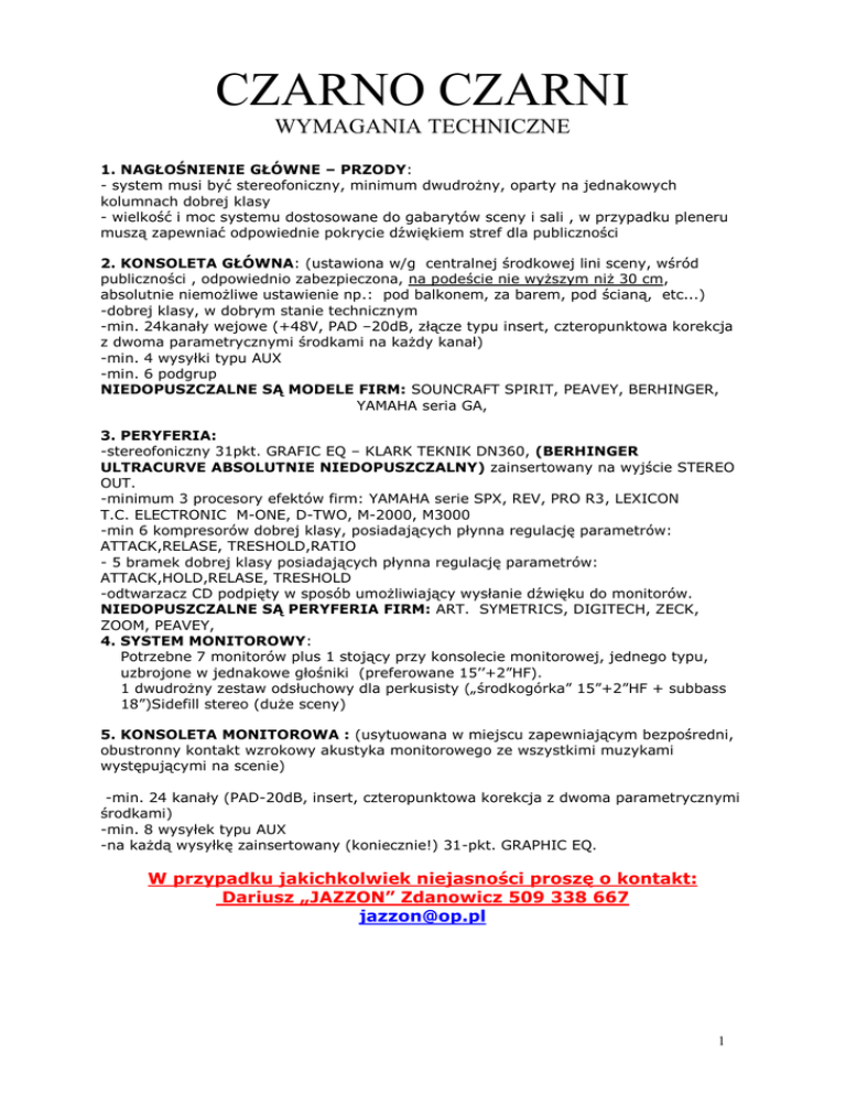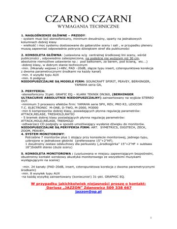 CZARNO CZARNI WYMAGANIA TECHNICZNE 1. NAGŁOŚNIENIE GŁÓWNE – PRZODY: - system musi być stereofoniczny, minimum dwudrożny, oparty na jednakowych kolumnach dobrej klasy - wielkość i moc systemu dostosowane do gabarytów sceny i sali , w przypadku pleneru muszą zapewniać odpowiednie pokrycie dźwiękiem stref dla publiczności 2. KONSOLETA GŁÓWNA: (ustawiona w/g centralnej środkowej lini sceny, wśród publiczności , odpowiednio zabezpieczona, na podeście nie wyższym niż 30 cm, absolutnie niemożliwe ustawienie np.: pod balkonem, za barem, pod ścianą, etc...) -dobrej klasy, w dobrym stanie technicznym -min. 24kanały wejowe (+48V, PAD –20dB, złącze typu insert, czteropunktowa korekcja z dwoma parametrycznymi środkami na każdy kanał) -min. 4 wysyłki typu AUX -min. 6 podgrup NIEDOPUSZCZALNE SĄ MODELE FIRM: SOUNCRAFT SPIRIT, PEAVEY, BERHINGER, YAMAHA seria GA, 3. PERYFERIA: -stereofoniczny 31pkt. GRAFIC EQ – KLARK TEKNIK DN360, (BERHINGER ULTRACURVE ABSOLUTNIE NIEDOPUSZCZALNY) zainsertowany na wyjście STEREO OUT. -minimum 3 procesory efektów firm: YAMAHA serie SPX, REV, PRO R3, LEXICON T.C. ELECTRONIC M-ONE, D-TWO, M-2000, M3000 -min 6 kompresorów dobrej klasy, posiadających płynna regulację parametrów: ATTACK,RELASE, TRESHOLD,RATIO - 5 bramek dobrej klasy posiadających płynna regulację parametrów: ATTACK,HOLD,RELASE, TRESHOLD -odtwarzacz CD podpięty w sposób umożliwiający wysłanie dźwięku do monitorów. NIEDOPUSZCZALNE SĄ PERYFERIA FIRM: ART. SYMETRICS, DIGITECH, ZECK, ZOOM, PEAVEY, 4. SYSTEM MONITOROWY: Potrzebne 7 monitorów plus 1 stojący przy konsolecie monitorowej, jednego typu, uzbrojone w jednakowe głośniki (preferowane 15’’+2”HF). 1 dwudrożny zestaw odsłuchowy dla perkusisty („środkogórka” 15”+2”HF + subbass 18”)Sidefill stereo (duże sceny) 5. KONSOLETA MONITOROWA : (usytuowana w miejscu zapewniającym bezpośredni, obustronny kontakt wzrokowy akustyka monitorowego ze wszystkimi muzykami występującymi na scenie) -min. 24 kanały (PAD-20dB, insert, czteropunktowa korekcja z dwoma parametrycznymi środkami) -min. 8 wysyłek typu AUX -na każdą wysyłkę zainsertowany (koniecznie!) 31-pkt. GRAPHIC EQ. W przypadku jakichkolwiek niejasności proszę o kontakt: Dariusz „JAZZON” Zdanowicz 509 338 667 [email protected] 1 Oświetlenie: 1. 12 głów ruchomych o mocy przynajmniej 500 W jako standard uważamy urządzenie Mac 500, dla doświetlenia perkusji przynajmniej 2 głowy ruchome typu Wash, 2. 32 x Par 64 + kontra, filtry (niebieski, czerwony, zielony, pomarańczowy)-zamiast reflektorów Par 64 mogą być użyte ruchome głowy typu Wash, 3. 4-6 Doświetlaczy (blindersy), 4. 4 obwody ACL , 5. 1 x follow spot , 6. Maszyna do dymu, mile widziany wentylator, Scena: Wymagane są : 1. Scena o wymiarach m.in. 10 x 8 m osłonięta z trzech stron jednokolorowymi siatkami lub materiałem, zabezpieczona przed wpływem działań atmosferycznych (wiatr, deszcz). 2. Min. 1 wejście na scenę – oznakowane schody zabezpieczone przed deszczem. 3. Podest pod perkusję 3 x 3 x 0,4 m. Garderoba: 1 garderoba łącznie dla 12 osób (może być namiot o wymiarach min. 3m x 4m): bezpośrednio przy wejściu na scenę do wyłącznej dyspozycji zespołu na 1 godz. przed rozpoczęciem koncertu okna w garderobach powinny być szczelnie zasłonięte podczas koncertu przy garderobach nie mogą przebywać osoby, które nie są bezpośrednio związane z koncertem w bezpośrednim sąsiedztwie garderób oświetlona czysta toaleta (ew. Toi-Toi typu VIP wyłącznie dla zespołu) z wodą, mydłem, ręcznikami papierowymi i papierem toaletowym wyposażona w: duże oświetlone lustro, wentylator, oświetlenie, 12 krzeseł (łącznie), Stół, kosz na śmieci, wieszak na odzież, ręczniki papierowe (3 szt.), gniazdka 230 V. Catering: kawa, herbata, cukier, mleko do kawy, cytryna, woda niegazowana Żywiec 12 x 0,5 l, woda gazowana Żywiec 2 x 0,5 l, Soki min. 8 litrów (pomarańczowy, jabłkowy, wieloowocowy), Coca- Cola 4 x 1 l, Piwo (6 x 0,5 l) Drobny poczęstunek po koncercie (kanapki, kiełbaski z grilla). Uwaga: barierki ochronne przed sceną w odległość max. 2-3 m lub ochrona w zależności i od wielkości imprezy, podczas koncertu obowiązuje zupełny zakaz nagrywania z wyjątkiem mediów(materiał do 3 minut), podczas koncertu wykonawcy schodzą ze sceny proszę uczulić służbę ochrony, po zakończeniu koncertu z boku sceny jest prowadzony sklepik zespołu (proszę przygotować stolik i oświetlenie), po koncercie artyści wychodzą na spotkanie z fanami, rozdają autografy. Wszelkie pytania organizacyjne Katarzyna Wydra TEL 608 345 487 2 CZARNO CZARNI Lista wejść L.p. 1. Instrument Stopa 2. 3. 4. 5. Werbel (góra) Werbel (dół) Hi-Hat Tom 6. Tom 7. 8. 9. 10. 11. 12. 13. 14. 15. 16. 17. 18. 19. 20. 21. Cowbell OH (Ride) OH lewy OH prawy Bass Git.El Git.El Powrót delay’a Key (mono) Key L Key R Voc Voc Voc Voc Rodzaj podłączenia AKG D12,D112, SHURE Beta52 SHURE SM57 SHURE SM57 AKG C1000/SM81 SEN. 504,e604,MD421, SHURE Beta56 SEN. 504,e604,MD421, SHURE Beta56 SHURE SM57 AKG C1000/SM81 AKG C1000/SM81 AKG C1000/SM81 XLR(wyjście z tyłu wzmacniacza) SHURE SM57 SHURE SM57 Tylko przy konsolecie Di-box Di-box Di-box SHURE SM58 SHURE SM58 SHURE SM58 SHURE SM58 Konsoleta przodowa Insert Gate+Comp. Konsoleta monitorowa Insert Gate Gate+Comp. Gate Comp. Gate Gate Gate Gate Gate Comp. Comp. Comp. Comp. Comp. 3 4 Sidefill M 4 3*Di-Box 15 16 17 Key 18 Voc. M1 19 Voc. Bass 11 XLR M1 M2 WIDOWNIA M2 20 GŁ. Voc. PERKUSJA M3 21 Voc. 13 Git. El. 12 M5 CZARNO CZARNI M3 M2 SideFill MM - Di-Box - GL. VOC -MIKROFON -MONITOR LEGENDA