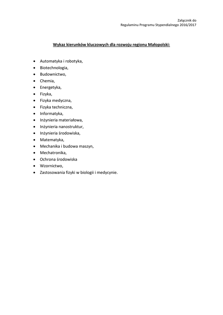 Załącznik do Regulaminu Programu Stypendialnego 2016/2017 Wykaz kierunków kluczowych dla rozwoju regionu Małopolski: • • • • • • • • • • • • • • • • • • Automatyka i robotyka, Biotechnologia, Budownictwo, Chemia, Energetyka, Fizyka, Fizyka medyczna, Fizyka techniczna, Informatyka, Inżynieria materiałowa, Inżynieria nanostruktur, Inżynieria środowiska, Matematyka, Mechanika i budowa maszyn, Mechatronika, Ochrona środowiska Wzornictwo, Zastosowania fizyki w biologii i medycynie.