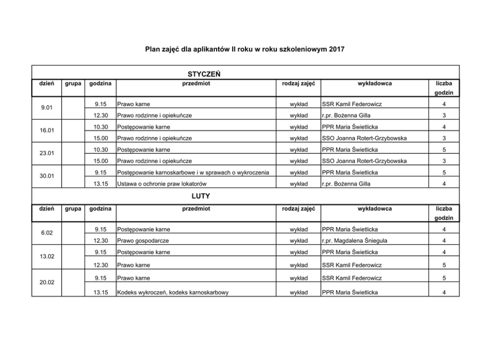 Plan zajęć dla aplikantów II roku w roku szkoleniowym 2017 STYCZEŃ dzień grupa godzina przedmiot rodzaj zajęć wykładowca liczba godzin 9.01 16.01 23.01 30.01 9.15 Prawo karne wykład SSR Kamil Federowicz 4 12.30 Prawo rodzinne i opiekuńcze wykład r.pr. Bożenna Gilla 3 10.30 Postępowanie karne wykład PPR Maria Świetlicka 4 15.00 Prawo rodzinne i opiekuńcze wykład SSO Joanna Rotert-Grzybowska 3 10.30 Postępowanie karne wykład PPR Maria Świetlicka 5 15.00 Prawo rodzinne i opiekuńcze wykład SSO Joanna Rotert-Grzybowska 3 9.15 Postępowanie karnoskarbowe i w sprawach o wykroczenia wykład PPR Maria Świetlicka 5 13.15 Ustawa o ochronie praw lokatorów wykład r.pr. Bożenna Gilla 4 LUTY dzień grupa godzina przedmiot rodzaj zajęć wykładowca liczba godzin 6.02 13.02 20.02 9.15 Postępowanie karne wykład PPR Maria Świetlicka 4 12.30 Prawo gospodarcze wykład r.pr. Magdalena Śniegula 4 9.15 Postępowanie karne wykład PPR Maria Świetlicka 4 12.30 Prawo karne wykład SSR Kamil Federowicz 5 9.15 Prawo karne wykład SSR Kamil Federowicz 5 13.15 Kodeks wykroczeń, kodeks karnoskarbowy wykład PPR Maria Świetlicka 4 27.02 9.15 Postępowanie karnoskarbowe i w sprawach o wykroczenia wykład PPR Maria Świetlicka 4 12.30 Zasady wykonywania zawodu wykład r.pr. Magdalena Modro-Prym 3 MARZEC dzień grupa godzina przedmiot rodzaj zajęć wykładowca liczba godzin 6.03 13.03 14.03 15.03 20.03 21.03 22.03 27.03 28.03 IIA IIB IIC IIA IIB IIC IIA IIB 9.15 Prawo karne wykład SSR Kamil Federowicz 4 12.30 Prawo upadłościowe i restrukturyzacyjne wykład SSR Dariusz Stępiński 3 9.15 Kpk ćwiczenia r.pr. Tomasz Jankowski 4 12.30 Prawo rodzinne i opiekuńcze ćwiczenia SSO Barbara Przytuła-Chrostek 4 9.15 Kpk ćwiczenia r.pr. Wojciech Płóciennik 4 12.30 Prawo rodzinne i opiekuńcze ćwiczenia SSO Barbara Przytuła-Chrostek 4 9.15 Kpk ćwiczenia SSR Kamil Federowicz 4 12.30 Prawo rodzinne i opiekuńcze ćwiczenia SSO Barbara Przytuła-Chrostek 4 9.15 Kpk ćwiczenia r.pr. Tomasz Jankowski 4 12.30 Prawo rodzinne i opiekuńcze ćwiczenia r.pr. Barbara Nowicka-Dyśko 4 9.15 Kpk ćwiczenia r.pr. Wojciech Płóciennik 4 12.30 Prawo rodzinne i opiekuńcze ćwiczenia r.pr. Barbara Nowicka-Dyśko 4 9.15 Kpk ćwiczenia SSR Kamil Federowicz 4 12.30 Prawo rodzinne i opiekuńcze ćwiczenia r.pr. Barbara Nowicka-Dyśko 4 9.15 Kpk ćwiczenia r.pr. Tomasz Jankowski 4 12.30 Prawo rodzinne i opiekuńcze ćwiczenia r.pr. Barbara Nowicka-Dyśko 4 9.15 Kpk ćwiczenia r.pr. Wojciech Płóciennik 4 12.30 Prawo rodzinne i opiekuńcze ćwiczenia r.pr. Barbara Nowicka-Dyśko 4 29.03 IIC 9.15 Kpk ćwiczenia SSR Kamil Federowicz 4 12.30 Prawo rodzinne i opiekuńcze ćwiczenia r.pr. Barbara Nowicka-Dyśko 4 KWIECIEŃ dzień grupa godzina przedmiot rodzaj zajęć wykładowca liczba godzin 10.04 24.04 9.15 Prawo spółek handlowych wykład r.pr. dr Jakub Janeta 5 13.15 Prawo upadłościowe i restrukturyzacyjne wykład SSR Dariusz Stępiński 3 9.15 Prawo spółek handlowych wykład r.pr. dr Jakub Janeta 5 13.15 Kodeks wykroczeń, kodeks karnoskarbowy wykład PPR Maria Świetlicka 3 MAJ dzień grupa godzina przedmiot rodzaj zajęć wykładowca liczba godzin 8.05 15.05 16.05 17.05 22.05 IIA IIB IIC IIA 9.15 Prawo spółek handlowych wykład r.pr. dr Jakub Janeta 4 12.30 Prawo własności przemysłowej wykład SSA Małgorzata Stanek 4 9.15 Kpk ćwiczenia r.pr. Tomasz Jankowski 4 12.30 Prawo upadłościowe i restrukturyzacyjne ćwiczenia r.pr. dr Zbigniew Wojnicki 4 9.15 Kpk ćwiczenia r.pr. Wojciech Płóciennik 4 12.30 Prawo upadłościowe i restrukturyzacyjne ćwiczenia r.pr. dr Zbigniew Wojnicki 4 9.15 Kpk ćwiczenia SSR Kamil Federowicz 4 12.30 Prawo upadłościowe i restrukturyzacyjne ćwiczenia r.pr. dr Zbigniew Wojnicki 4 9.15 Kpk ćwiczenia r.pr. Tomasz Jankowski 4 12.30 Prawo upadłościowe i restrukturyzacyjne ćwiczenia SSR Dariusz Stępiński 4 23.05 24.05 29.05 30.05 31.05 IIB IIC IIA IIB IIC 9.15 Kpk ćwiczenia r.pr. Wojciech Płóciennik 4 12.30 Prawo upadłościowe i restrukturyzacyjne ćwiczenia SSR Dariusz Stępiński 4 9.15 Kpk ćwiczenia SSR Kamil Federowicz 4 12.30 Prawo upadłościowe i restrukturyzacyjne ćwiczenia SSR Dariusz Stępiński 4 9.15 Kpk ćwiczenia r.pr. Tomasz Jankowski 4 12.30 Prawo upadłościowe i restrukturyzacyjne ćwiczenia r.pr. dr Zbigniew Wojnicki 4 9.15 Kpk ćwiczenia r.pr. Wojciech Płóciennik 4 12.30 Prawo upadłościowe i restrukturyzacyjne ćwiczenia r.pr. dr Zbigniew Wojnicki 4 9.15 Kpk ćwiczenia SSR Kamil Federowicz 4 12.30 Prawo upadłościowe i restrukturyzacyjne ćwiczenia r.pr. dr Zbigniew Wojnicki 4 CZERWIEC dzień grupa godzina przedmiot rodzaj zajęć wykładowca liczba godzin 5.06 6.06 7.06 19.06 IIA IIB IIC 9.15 Kpk ćwiczenia r.pr. Tomasz Jankowski 4 12.30 Ksh ćwiczenia r.pr. Wioletta Rogalska-Paluch 4 9.15 Kpk ćwiczenia r.pr. Wojciech Płóciennik 4 12.30 Ksh ćwiczenia r.pr. Krzysztof Wójcik 4 9.15 Kpk ćwiczenia SSR Kamil Federowicz 4 12.30 Ksh ćwiczenia r.pr. Maciej Wąsik 4 9.15 Prawo spółek handlowych wykład r.pr. dr Jakub Janeta 4 12.30 Prawo ubezpieczeń majątkowych wykład r.pr. Marek Pilc 4 26.06 27.06 28.06 IIA IIB IIC 9.15 Ksh ćwiczenia r.pr. Wioletta Rogalska-Paluch 4 12.30 Ubezpieczenia majątkowe ćwiczenia r.pr. Łukasz Bonisławski 4 9.15 Ksh ćwiczenia r.rp. Krzysztof Wójcik 4 12.30 Ubezpieczenia majątkowe ćwiczenia r.pr. Łukasz Bonisławski 4 9.15 Ksh ćwiczenia r.pr. Maciej Wąsik 4 12.30 Ubezpieczenia majątkowe ćwiczenia r.pr. Łukasz Bonisławski 4 LIPIEC dzień grupa godzina przedmiot rodzaj zajęć wykładowca liczba godzin 3.07 4.07 5.07 10.07 11.07 12.07 IIA IIB IIC IIA IIB IIC 9.15 Ksh ćwiczenia r.pr. Wioletta Rogalska-Paluch 4 12.30 KRS ćwiczenia ref.sąd. Renata Wielgus 3 9.15 Ksh ćwiczenia r.pr. Krzysztof Wójcik 4 12.30 KRS ćwiczenia ref.sąd. Renata Wielgus 3 9.15 Ksh ćwiczenia r.pr. Maciej Wąsik 4 12.30 KRS ćwiczenia ref.sąd. Renata Wielgus 3 9.15 Ksh ćwiczenia r.pr. Wioletta Rogalska-Paluch 4 12