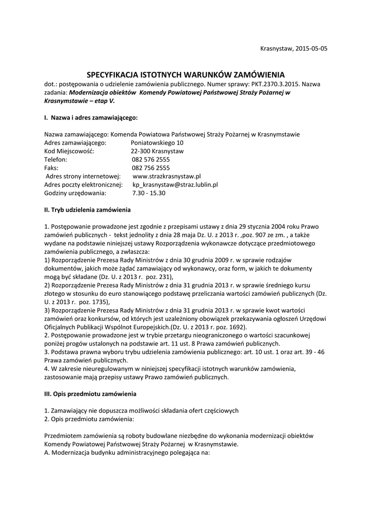 Krasnystaw, 2015-05-05 SPECYFIKACJA ISTOTNYCH WARUNKÓW ZAMÓWIENIA dot.: postępowania o udzielenie zamówienia publicznego. Numer sprawy: PKT.2370.3.2015. Nazwa zadania: Modernizacja obiektów Komendy Powiatowej Państwowej Straży Pożarnej w Krasnymstawie – etap V. I. Nazwa i adres zamawiającego: Nazwa zamawiającego: Komenda Powiatowa Państwowej Straży Pożarnej w Krasnymstawie Adres zamawiającego: Poniatowskiego 10 Kod Miejscowość: 22-300 Krasnystaw Telefon: 082 576 2555 Faks: 082 756 2555 Adres strony internetowej: www.strazkrasnystaw.pl Adres poczty elektronicznej: [email protected] Godziny urzędowania: 7.30 - 15.30 II. Tryb udzielenia zamówienia 1. Postępowanie prowadzone jest zgodnie z przepisami ustawy z dnia 29 stycznia 2004 roku Prawo zamówień publicznych - tekst jednolity z dnia 28 maja Dz. U. z 2013 r. ,poz. 907 ze zm. , a także wydane na podstawie niniejszej ustawy Rozporządzenia wykonawcze dotyczące przedmiotowego zamówienia publicznego, a zwłaszcza: 1) Rozporządzenie Prezesa Rady Ministrów z dnia 30 grudnia 2009 r. w sprawie rodzajów dokumentów, jakich może żądać zamawiający od wykonawcy, oraz form, w jakich te dokumenty mogą być składane (Dz. U. z 2013 r. poz. 231), 2) Rozporządzenie Prezesa Rady Ministrów z dnia 31 grudnia 2013 r. w sprawie średniego kursu złotego w stosunku do euro stanowiącego podstawę przeliczania wartości zamówień publicznych (Dz. U. z 2013 r. poz. 1735), 3) Rozporządzenie Prezesa Rady Ministrów z dnia 31 grudnia 2013 r. w sprawie kwot wartości zamówień oraz konkursów, od których jest uzależniony obowiązek przekazywania ogłoszeń Urzędowi Oficjalnych Publikacji Wspólnot Europejskich.(Dz. U. z 2013 r. poz. 1692). 2. Postępowanie prowadzone jest w trybie przetargu nieograniczonego o wartości szacunkowej poniżej progów ustalonych na podstawie art. 11 ust. 8 Prawa zamówień publicznych. 3. Podstawa prawna wyboru trybu udzielenia zamówienia publicznego: art. 10 ust. 1 oraz art. 39 - 46 Prawa zamówień publicznych. 4. W zakresie nieuregulowanym w niniejszej specyfikacji istotnych warunków zamówienia, zastosowanie mają przepisy ustawy Prawo zamówień publicznych. III. Opis przedmiotu zamówienia 1. Zamawiający nie dopuszcza możliwości składania ofert częściowych 2. Opis przedmiotu zamówienia: Przedmiotem zamówienia są roboty budowlane niezbędne do wykonania modernizacji obiektów Komendy Powiatowej Państwowej Straży Pożarnej w Krasnymstawie. A. Modernizacja budynku administracyjnego polegająca na: - wymianie pokrycia dachowego /izolacja z membrany paro przepuszczalnej, izolacja cieplna i przeciwdźwiękowa z wełny mineralnej gr. 15 cm (Imin=0,036), ułożenie drugiej warstwy wełny mineralnej gr. 10 cm – od spodu/ – pow. 382 m2, - wykonaniu obróbek blacharskich z blachy powlekanej, obróbki koszowe i kominowe – pow. 23 m2, - wymianie bram garażowych /tynki ościeży o szer. 20 cm, wykonane ręcznie/ – pow. 68 m2, - izolacji przeciwwilgociowej bitumicznej pionowej fundamentów /system Mapei Plastimul 2K Plus lub równoważny/ - pow. 10 m2, - termomodernizacji elewacji /system STOPTER lub równoważny/ z wyprawą z tynku silikonowego /gr. 1,5 mm/ - pow. 912 m2 , - montażu konstrukcji pod panele fotowoltaiczne /konstrukcja aluminiowa nitowana do blachy/ – kpl. 1, - montażu paneli fotowoltaicznych 8kWp /cela krzemowa, panel zabezpieczony technologią podwójnej szyby, Solar World 250 poly Protect lub równoważny/ z przyłączeniem do budynku administracyjnego - kpl. 32, - falownik /zakres poszukiwania MPPT – 330-800 V/ - szt. 1, - okablowanie, rozdzielnia, zabezpieczenia - kpl. 1, - system wyposażony w sterownik monitorujący moc jednostki wytwórczej zabezpieczający przed wypływem energii do sieci zewnętrznej. Roboty budowlane rozbiórkowe polegające na: - likwidacji balkonów /budynek administracyjny/ – szt. 4, - rozebraniu posadzki z płytek na zaprawie cementowej, schody zewnętrzne /od placu wjazdowego/ – pow. 17 m2. Roboty budowlane wykończeniowe polegające na: - izolacji z folii paroprzepuszczalnej przymocowanej do konstrukcji drewnianej – pow. 295 m2, - wykonaniu sufitu podwieszanego o konstrukcji metalowej z wypełnieniem płytami gipsowymi /materiał inwestora, część kasetonów do wymiany/– pow. 295 m2, - wyk. okładziny schodów zewnętrznych z płytek kamieni sztucznych 30x30 cm /antypoślizgowych min R11/ - pow. 17 m2, - wykonanie napisu Państwowa Straż Pożarna 998 wraz z logo PSP na budynku administracyjnym – kpl 1. Część garażowa: - rozbiórce elementów betonowych – gzymsy – pow. 3 m3, - rozebraniu ocieplenia budynku – tynk z siatką – pow. 87 m2, - ocieplenie ścian zewnętrznych płytami styropianowymi metodą lekką – mokrą przy użyciu gotowych zapraw klejących /grubość płyt styropianowych 15 cm/– pow. 492 m2. B. Modernizacja kotłowni Roboty instalacyjne polegające na: - instalacji gazowej /w tym wykonanie projektu budowlanego na wewnętrzną instalację gazową/, - instalacji kotłów /kotły gazowe kondensacyjne o mocy 45 kW - każdy/ – szt. 3, - montaż urządzeń automatyki kotłów – szt. 3, - kaskada kominowa dla trzech kotłów z automatyką zabezpieczającą – pow. 18 m, - instalacja c. o. , - instalacji grzejników stalowych dwupłytowych /wysokość 600-900 mm, długość do 1600 mm/ - szt. 2. Roboty demontażowe polegające na: - rozebraniu kotła o powierzchni ogrzewalnej do 12.0 m2 – kpl. 2. C. Klatka ewakuacyjna Roboty wykończeniowe polegające na: - uzupełnieniu ubytków w ścianach zaprawą cementowo – wapienną – pow. 0,68 m3 , - gruntowaniu podłoży powierzchni pionowych /Ceresit CT 17 lub równoważny/ - pow. 227 m, - położeniu tynków wewnętrznych, zwykłych /kat. IV wykonane ręcznie na ścianach i pilastrach/ – pow. 194 m2, - wykonaniu okładzin stropów płytami gipsowo-kartonowymi na ruszcie pojedynczym, podwieszanym, metalowym – pow. 11 m2, - zamontowaniu