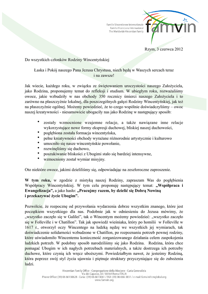 Rzym, 3 czerwca 2012 Do wszystkich członków Rodziny Wincentyńskiej Łaska i Pokój naszego Pana Jezusa Chrystusa, niech będą w Waszych sercach teraz i na zawsze! Jak wiecie, każdego roku, w związku ze świętowaniem uroczystości naszego Założyciela, jako Rodzina, proponujemy temat do refleksji i studium. W ubiegłym roku, rozważaliśmy owoce, jakie wzbudziły w nas obchody 350 rocznicy śmierci naszego Założyciela i to zarówno na płaszczyźnie lokalnej, dla poszczególnych gałęzi Rodziny Wincentyńskiej, jak też na płaszczyźnie ogólnej. Możemy powiedzieć, że to czego wspólnie doświadczyliśmy – owoc naszej kreatywności - niesamowicie ubogaciły nas jako Rodzinę w następujący sposób: • zostały wzmocnione wzajemne relacje, a także nawiązane inne relacje • • • • • • wykorzystujące nowe formy ekspresji duchowej, bliskiej naszej duchowości, pogłębiona została formacja wincentyńska, pełne kreatywności obchody wyrażane różnorodnie artystycznie i kulturowo umocniło się nasze wincentyńskie powołanie, rozwinęliśmy się duchowo, poszukiwanie bliskości z Ubogimi stało się bardziej intensywne, wzmocniony został wymiar misyjny. Oto niektóre owoce, jakimi dzieliliśmy się, odpowiadając na zeszłoroczne zaproszenie. W tym roku, w zgodzie z mistyką naszej Rodziny, zapraszam Was do pogłębienia Współpracy Wincentyńskiej. W tym celu proponuję następujący temat: „Współpraca i Ewangelizacja”, a jako hasło: „Pracujmy razem, by dzielić się Dobrą Nowiną i przekazywać życie Ubogim”. Pozwólcie, że rozpocznę od przywołania wydarzenia dobrze wszystkim znanego, które jest początkiem wszystkiego dla nas. Podobnie jak w odniesieniu do Jezusa mówimy, że „wszystko zaczęło się w Galilei”, tak o Wincentym możemy powiedzieć: „wszystko zaczęło się w Folleville i w Chatillon”. Tak jak spowiedź wieśniaka, który po homilii w Folleville w 1617 r., otworzył oczy Wincentego na ludzką nędzę we wszystkich jej wymiarach, tak doświadczenie solidarności wzbudzone w Chatillon, po rozpoznaniu potrzeb pewnej rodziny, które uświadomiło Wincentemu konieczność zorganizowanego działania celem zaspokojenia ludzkich potrzeb. W podobny sposób narodziliśmy się jako Rodzina. Rodzina, która chce pomagać Ubogim w ich nagłych potrzebach materialnych, a także dostrzega ich potrzeby duchowe, które czynią ich wręcz uboższymi. Powiedziałbym nawet, że jesteśmy Rodziną, która poprzez swój styl życia ujawnia i piętnuje struktury przyczyniające się do zubożenia ludzi. Poprzez chrzest jesteśmy częścią planu – Bożego Planu, objawionego przez Jego Syna Jezusa Chrystusa, który w jasny sposób przedstawiają Ewangelie: planu Królestwa i Jego Sprawiedliwości. Jako Rodzina Wincentyńska mamy ten przywilej i bogosławieństwo, że posiadamy duchowość, która pozwala nam dzisiaj przeżywać ten Plan Życia. Nasza duchowość pochodzi od człowieka, który każdego dnia stawiał sobie pytanie: „Co Syn Boży uczyniłby w tej czy innej sytuacji?” Tymczasem, Rodzina ta jest zanurzona w świecie, który z każdym dniem, oddala się od koncepcji rodziny a preferuje indywidualistyczny, konkurencyjny i egocentryczny styl życia. Jest to nieludzki styl, gdyż byc człowiekiem w swoim najgłębszym sensie, nie ma sensu bez drugiego człowieka. W odpowiedzi, składamy temu światu alternatywną propozycję. Nie tylko dlatego, że nasz sposób życia stara się przemieniać ten świat, tak, by stał się on dobrą nowiną dla ludzi przemianą dokonującą się poprzez głoszenie Dobrej Nowiny Ubogim, ale również dlatego, iż możemy i chcemy być wzorcem poprzez nasz sposób pracy wspolnie w zespole. Każda Gałąź jest bardzo różna i to nas ubogaca, ale tym co nas łączy jest Jezus Chrystus, a każdy z nasz przeżywa to na różny sposób. Tak dzieje się od ponad 400 lat: jest to styl wincentyński, to znaczy: „Jezus Chrystus tu i teraz”. W praktyce, zapraszam Was, by: 1. wzmocnić organizacje lokalne i regionalne, które czynią nas jedną Rodziną. Jeśli ich nie ma, należy położyć podwaliny do ich tworzenia; 2. wzmacniać projekty na rzecz Ubogich, realizowane jako Rodzina. Projekty podejmowane przez poszczególne Gałęzie są dobre, lecz jeśli będziemy je tworzyć jako Rodzina, będą jeszcze lepsze; 3. Organizować wspólnie jako Rodzina, miejsca obchodów i modlitwy, korzystając z okazji różnych wydarzeń lokalnych i regionalnych, rocznic, jubileuszy, świąt wincentyńskich, itd. Wiem, że każda gałąź, podobnie jak cała Rodzina Wincentyńska w ogólności, doświadcza różnych sytuacji, które często zniechęcają członków, które w tych momentach sprawiają, że praca staje się trudna. Niekiedy istnieją pokusy, by podążać śladem nieludzkich projektów, o których wcześniej mówiliśmy. Tymczasem, członkowie Rodziny Wincentyńskiej nie zostali do tego zrodzeni; zrodzili się by przynieść Życie i jak mówił nasz Pan: „życie w obfitości”. To dlatego chciałbym, abyśmy zatrzymali się nad zaletą, wartością każdej gałęzi i każdego członka. Jeśli połączymy te zalety, możemy wykonać wspaniałą pracę, a nasi Panowie będą mogli z niej korzystać. Na zakończenie, chciałbym, abyśmy zastanowili się nad metaforą, którą z pewnością wielu z Was zna. Jednakże, za każdym razem, gdy się nad nią zastanawiamy, możemy zrozumieć ją nieco inaczej. Spotkanie w warsztacie stolarskim. „Pewnego dnia, w warsztacie stolarskim odbyło się dziwne spotkanie. Narzędzia zwołały naradę, by rozwiązać problemy dotyczące różnic między nimi. Jako pierwszy przewodniczył młotek, ale zgromadzenie szybko poinformowało go, że powinien podać się do dymisji, gdyż robi dużo hałasu spędzając swój czas na uderzaniu. Młotek uznał swój błąd, ale poprosił, by motylek został usunięty, gdyż trzeba nim zbyt dużo kręcić, by cokolwiek 