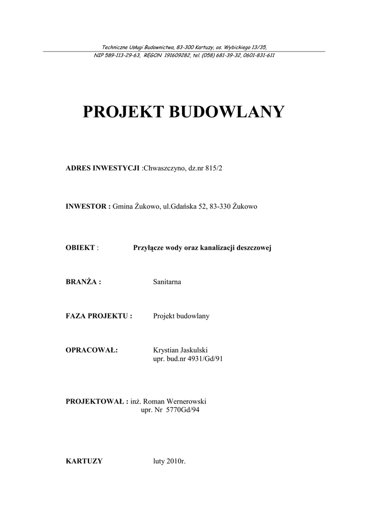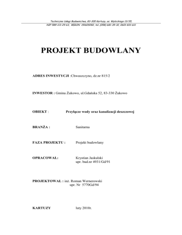 Techniczne Usługi Budownictwa, 83-300 Kartuzy, os. Wybickiego 13/35, NIP 589-113-29-63, REGON 191609282, tel. (058) 681-39-32, 0601-831-611 PROJEKT BUDOWLANY ADRES INWESTYCJI :Chwaszczyno, dz.nr 815/2 INWESTOR : Gmina śukowo, ul.Gdańska 52, 83-330 śukowo OBIEKT : Przyłącze wody oraz kanalizacji deszczowej BRANśA : Sanitarna FAZA PROJEKTU : Projekt budowlany OPRACOWAŁ: Krystian Jaskulski upr. bud.nr 4931/Gd/91 PROJEKTOWAŁ : inŜ. Roman Wernerowski upr. Nr 5770Gd/94 KARTUZY luty 2010r. ZAWARTOŚĆ OPRACOWANIA I. OPIS TECHNICZNY 1.0.Podstawa opracowania 2.0.Przedmiot opracowania 3.0.Dane ogólne 4.0.Istniejące uzbrojenie 5.0.Projektowane przyłącza 5.1. Przyłącze wody 5.1.1.Wymagania techniczne 5.1.2.Wytyczne materiałowe 5.2.Przyłącze kanalizacji 5.2.1.Studzienka rewizyjna 5.2.2.Wytyczne materiałowe 6.0.Kolizje i skrzyŜowania 7.0.Roboty ziemne 8.0.Oddziaływanie na środowisko. 9.0. ZałoŜenia technologiczne dla fontanny 10.0.Uwagi dla wykonawcy robót II. CZĘŚĆ RYSUNKOWA 1.Plan sytuacyjny 2.profil przyłącza wody 3.profil przyłącza kanalizacji 4.schematy III. Wytyczne do Planu Bezpieczeństwa i Ochrony Zdrowia. 1. Zakres robót dla całego zamierzenia budowlanego oraz kolejność realizacji poszczególnych obiektów . 2. Wykaz istniejących obiektów budowlanych . 3. Wskazanie elementów zagospodarowania działki lub terenu, które mogą stwarzać zagroŜenie bezpieczeństwa i zdrowia ludzi. 4. Wskazania dotyczące przewidywanych zagroŜeń występujących podczas realizacji robót budowlanych. 5. Wskazanie sposobu prowadzenia instruktaŜu pracowników przed przystąpieniem do realizacji robót szczególnie niebezpiecznych . 6.Wskazanie środków technicznych i organizacyjnych, zapobiegających niebezpieczeństwom wynikającym z wykonywania robót budowlanych w strefach szczególnego zagroŜenia zdrowia lub w ich sąsiedztwie, w tym zapewniających bezpieczną i sprawną komunikację, umoŜliwiającą szybką ewakuację na wypadek poŜaru, awarii i innych zagroŜeń. OPIS TECHNICZNY do Projektu budowy przyłącza wodociągowego i kanalizacji deszczowej do działki nr 815/2 w Chwaszczynie gm.śukowo. 1.0.Podstawa opracowania -zlecenie Inwestora -miejscowy plan zagospodarowania przestrzennego -warunki techniczne wydane przez ZUK w Glinczu -obowiązujące normy i przepisy 2.0.Przedmiot opracowania Niniejsze opracowanie obejmuje projekt doprowadzenia wody uŜytkowej do działki budowlanej Nr 815/2, na której projektuje się fontannę wodną oraz odprowadzenie wody do kanalizacji deszczowej. 3.0.Dane ogólne Do projektowanej fontanny na dz.815/2 naleŜy doprowadzić wodę uŜytkową dla zabezpieczenia potrzeb i uzyskania projektowanego efektu fontanny wodnej uzyskiwanego z dysz umieszczonych w niecce. Z zbiornika fontanny naleŜy zaprojektować kanalizację umoŜliwiającą spust wody na czas zimowy oraz na czas konserwacji i remontów. 4.0.Istniejące uzbrojenie Działka nie jest uzbrojona w sieć wodociągową. Przy granicy działki z ulicą Gdyńską znajduje się kanalizacja deszczowa, do której projektuje się włączenie. 5.0.Projektowane przyłącza 5.1. Przyłącze wodociągowe Przyłącze wodociągowe do działki projektuje się z rur PE Ø40. Włączenie do istniejącej sieci PVC Ø 90mm wykonać za pomocą nawiertki Ø90/40.Na odgałęzieniu zamontować zasuwę Ø32mm z miękkim doszczelnieniem, z skrzynką uliczną i obudową. Przyłącze do projektowanej fontanny doprowadzić do dwukomorowego zbiornika zlokalizowanego przy obiekcie fontanny. Przyłącze zakończyć zaworem odcinającym Ø32mm. Za zaworem odcinającym zamontować wodomierz Js1,5 Ø15, zawór odcinający Ø25 z kurkiem spustowym oraz zawór zwrotny antyskaŜeniowy Ø25. 5.1.1.Wymagania techniczne Zastosowane materiały, elementy uzbrojenia i rury muszą spełniać wymagania norm i przepisów zgodnie z wymogami warunków technicznych wykonania i odbioru sieci wodociągowych z tworzyw sztucznych. Rury układać w wykopach na 10cm podsypce z piasku wolnego od kamieni i kawałków gruzów betonowych zgodnie z wymaganiami i zaleceniami producenta. Rury obsypać piaskiem i zagęścić ręcznie. Zasypywać warstwami z zagęszczaniem ręcznym. Nad rurociągiem ułoŜyć taśmę lokalizacyjną PCV z wtopioną wkładką metalową przeznaczoną dla sici wodociągowych. Wykonać próbę szczelności zgodnie z normą PN-81/B-10725 na ciśnienie 1.0 MPa. Po próbie szczelności przewód naleŜy poddać dezynfekcji przy uŜyciu podchlorynu sodu. Czas dezynfekcji powinien trwać nie krócej niŜ 72 godz. , po zakończeniu wykonać płukanie wodociągu oraz badanie bakteriologiczne próbki wody. Do odbioru sieci wodociągowej przedstawić pozytywne wyniki badań bakteriologicznych próbek wody. 5.1.2.Wytyczne materiałowe Przyłącze naleŜy wykonać z rur PE Ø40 PN10. MontaŜ zgodnie z wytycznymi producenta rur. 5.2. przyłącze kanalizacji Przyłącze kanalizacji odprowadzającej wodę z zbiornika fontanny projektuje się z rur kanalizacyjnych PVC Ø160 x 4,7mm. Na istniejącym kanale kanalizacji deszczowej naleŜy posadowić studzienkę zbiorczą z PVC D425 i do niej włączyć spust wody z fontanny. Kanalizację naleŜy wykonać w wykopie na podsypce z piasku. Zasypywanie wykopów naleŜy wykonywać warstwami z jednoczesnym zagęszczaniem. Głębokości, trasę i spadki pokazano na rzucie i profilach podłuŜnych. Przejścia rur przewodowych przez ścianki zbiornika wykonać za pomocą szczelnych tulei ochronnych z PCV. 5.2.1. Studzienka rewizyjna Na istniejącym kanale deszczowym projektuje się studzienkę rewizyjno-połączeniową nie włazową z tworzyw sztucznych Ø425. Zwieńczenie studzienki za pomocą teleskopu z włazem Ŝeliwnym klasy D400 oraz pierścieniem odciąŜającym. Lokalizacja w/g projektu. 5.2.2.Wytyczne materiałowe Kanalizację naleŜy wykonać w wykopie na podsypce z piasku. Zasypywanie wykopów naleŜy wykonywać warstwami z jednoczesnym zagęszczaniem. Głębokości, trasę i 