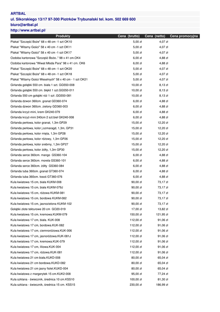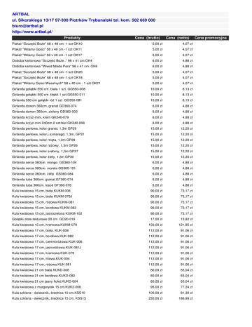 ARTBAL ul. Sikorskiego 13/17 97-300 Piotrków Trybunalski tel. kom. 502 669 600 [email protected] http://www.artbal.pl/ Produkty Cena (brutto) Cena (netto) Plakat "Szczęść Boże" 68 x 48 cm -1 szt OK10 5,00 zł 4,07 zł Plakat "Witamy Gości" 58 x 40 cm -1 szt OK11 5,00 zł 4,07 zł Plakat "Witamy Gości" 58 x 40 cm -1 szt OK17 5,00 zł 4,07 zł Ozdoba kartonowa "Szczęść Boże.." 98 x 41 cm.OK4 6,00 zł 4,88 zł Ozdoba kartonowa "Wiwat Młoda Para" 98 x 41 cm. OK6 6,00 zł 4,88 zł Plakat "Szczęść Boże" 68 x 48 cm -1 szt OK20 5,00 zł 4,07 zł Plakat "Szczęść Boże" 68 x 48 cm -1 szt OK18 5,00 zł 4,07 zł Plakat "Witamy Gości Weselnych" 58 x 40 cm - 1 szt OK21 5,00 zł 4,07 zł Girlanda gołąbki 550 cm. biała 1 szt. GG550-008 10,00 zł 8,13 zł Girlanda gołąbki 550 cm. błękit 1 szt.GG550-011 10,00 zł 8,13 zł Girlanda 550 cm gołąbki róż 1 szt .GG550-081 10,00 zł 8,13 zł Girlanda dzwon 360cm. granat GD360-074 6,00 zł 4,88 zł Girlanda dzwon 360cm. zielony GD360-003 6,00 zł 4,88 zł Girlanda krzyż-mini, krem GK240-079 6,00 zł 4,88 zł Girlanda krzyż-mini 240cm 2 szt.biel GK240-008 6,00 zł 4,88 zł Girlanda perłowa, kolor granat, 1,3m GP29 15,00 zł 12,20 zł Girlanda perłowa, kolor j.szmaragd, 1,3m, GP31 15,00 zł 12,20 zł Girlanda perłowa, kolor mięta, 1,3m GP28 15,00 zł 12,20 zł Girlanda perłowa, kolor różowy, 1,3m GP26 15,00 zł 12,20 zł Girlanda perłowa, kolor srebrny, 1,3m GP27 15,00 zł 12,20 zł Girlanda perłowa, kolor żółty, 1,3m GP30 15,00 zł 12,20 zł Girlanda serce 360cm. mango GS360-104 6,00 zł 4,88 zł Girlanda serce 360cm. morela GS360-101 6,00 zł 4,88 zł Girlanda serce 360cm. żółty GS360-084 6,00 zł 4,88 zł Girlanda tuba 360cm. granat GT360-074 6,00 zł 4,88 zł Girlanda tuba 360cm. łosoś GT360-076 6,00 zł 4,88 zł Kula kwiatowa 15 cm, biała KUKM-008 90,00 zł 73,17 zł Kula kwiatowa 15 cm, biała KUKM-079J 90,00 zł 73,17 zł Kula kwiatowa 15 cm, różowa KUKM-081 90,00 zł 73,17 zł Kula kwiatowa 15 cm, bordowa KUKM-082 90,00 zł 73,17 zł Kula kwiatowa 15 cm, jasnozielona KUKM-102 90,00 zł 73,17 zł Gołąbki złote tekturowe 20 cm GO20-019 17,00 zł 13,82 zł Kula kwiatowa 15 cm, kremowa.KUKM-079 150,00 zł 121,95 zł Kula kwiatowa 17 cm, biała. KUK-008 112,00 zł 91,06 zł Kula kwiatowa 17 cm, bordowa.KUK-082 112,00 zł 91,06 zł Kula kwiatowa 17 cm, ciemnoróżowa.KUK-006 112,00 zł 91,06 zł Kula kwiatowa 17 cm, jasnoróżowa.KUK-081J 112,00 zł 91,06 zł Kula kwiatowa 17 cm, kremowa.KUK-079 112,00 zł 91,06 zł Kula kwiatowa 17 cm, liliowa.KUK-004 112,00 zł 91,06 zł Kula kwiatowa 17 cm, różowa.KUK-081 112,00 zł 91,06 zł Kula kwiatowa 21 cm biała.KUKD-008 80,00 zł 65,04 zł Kula kwiatowa 21 cm bordowa.KUKD-082 80,00 zł 65,04 zł Kula kwiatowa 21 cm jasny fiolet.KUKD-004 80,00 zł 65,04 zł Kula kwiatowa z margerytek 15 cm.KUK2-008 95,00 zł 77,24 zł Kula szklana - świecznik, średnica 10 cm.KSS10 100,00 zł 81,30 zł Kula szklana - świecznik, średnica 15 cm. KSS15 230,00 zł 186,99 zł Cena promocyjna Kula szklana ze wstążką, 4 szt. KS10 83,00 zł 67,48 zł Obrączki duże 50 cm. OBD 20,00 zł 16,26 zł Obrączki średnie 40 cm.OBS 16,00 zł 13,01 zł Ozdoby obrączki ślubne, złote, 48 szt. AOR-019 8,00 zł 6,50 zł Pięć dzwoneczków na wstążce DZW5 4,00 zł 3,25 zł Serce pełne puchate 50 cm, j.różowe. PSP-081J 90,00 zł 73,17 zł Serce pełne puchate 50 cm, jasnofioletowe.PSP-004 90,00 zł 73,17 zł 6,00 zł 4,88 zł 185,00 zł 150,41 zł Złote dzwoneczki DZW18-019 INICJAŁY 3D Litery Napisy Przestrzenne