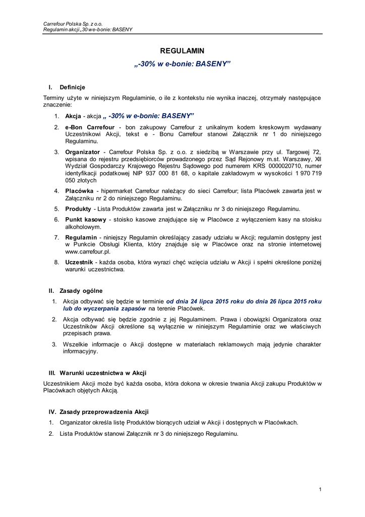 Carrefour Polska Sp. z o.o. Regulamin akcji „30 w e-bonie: BASENY REGULAMIN „-30% w e-bonie: BASENY” I. Definicje Terminy użyte w niniejszym Regulaminie, o ile z kontekstu nie wynika inaczej, otrzymały następujące znaczenie: 1. Akcja - akcja „ -30% w e-bonie: BASENY” 2. e-Bon Carrefour - bon zakupowy Carrefour z unikalnym kodem kreskowym wydawany Uczestnikowi Akcji, tekst e - Bonu Carrefour stanowi Załącznik nr 1 do niniejszego Regulaminu. 3. Organizator - Carrefour Polska Sp. z o.o. z siedzibą w Warszawie przy ul. Targowej 72, wpisana do rejestru przedsiębiorców prowadzonego przez Sąd Rejonowy m.st. Warszawy, XII Wydział Gospodarczy Krajowego Rejestru Sądowego pod numerem KRS 0000020710, numer identyfikacji podatkowej NIP 937 000 81 68, o kapitale zakładowym w wysokości 1 970 719 050 złotych 4. Placówka - hipermarket Carrefour należący do sieci Carrefour; lista Placówek zawarta jest w Załączniku nr 2 do niniejszego Regulaminu. 5. Produkty - Lista Produktów zawarta jest w Załączniku nr 3 do niniejszego Regulaminu. 6. Punkt kasowy - stoisko kasowe znajdujące się w Placówce z wyłączeniem kasy na stoisku alkoholowym. 7. Regulamin - niniejszy Regulamin określający zasady udziału w Akcji; regulamin dostępny jest w Punkcie Obsługi Klienta, który znajduje się w Placówce oraz na stronie internetowej www.carrefour.pl. 8. Uczestnik - każda osoba, która wyrazi chęć wzięcia udziału w Akcji i spełni określone poniżej warunki uczestnictwa. II. Zasady ogólne 1. Akcja odbywać się będzie w terminie od dnia 24 lipca 2015 roku do dnia 26 lipca 2015 roku lub do wyczerpania zapasów na terenie Placówek. 2. Akcja odbywać się będzie zgodnie z jej Regulaminem. Prawa i obowiązki Organizatora oraz Uczestników Akcji określone są wyłącznie w niniejszym Regulaminie oraz we właściwych przepisach prawa. 3. Wszelkie informacje o Akcji dostępne w materiałach reklamowych mają jedynie charakter informacyjny. III. Warunki uczestnictwa w Akcji Uczestnikiem Akcji może być każda osoba, która dokona w okresie trwania Akcji zakupu Produktów w Placówkach objętych Akcją. IV. Zasady przeprowadzenia Akcji 1. Organizator określa listę Produktów biorących udział w Akcji i dostępnych w Placówkach. 2. Lista Produktów stanowi Załącznik nr 3 do niniejszego Regulaminu. 1 Carrefour Polska Sp. z o.o. Regulamin akcji „30 w e-bonie: BASENY V. Warunki otrzymania e-Bonu za zakup Produktu. 1. Każdemu Uczestnikowi przysługuje jednorazowo prawo do otrzymania e-Bonu za zakup Produktu na zasadach określonych w niniejszym Regulaminie. 2. Warunkiem otrzymania e-Bonu jest nabycie przez Uczestnika Produktu w Placówce w okresie obowiązywania Akcji. 3. Wartość otrzymanego e-Bonu uzależniona jest od ostatecznej kwoty figurującej na paragonie fiskalnym potwierdzającym dokonane przez Uczestnika zakupu Produktów w Placówce, po uwzględnieniu wszystkich wykorzystanych przez Uczestnika rabatów. Maksymalna wartość otrzymanego do jednej transakcji e- Bonu wynosi do 600,00 złotych brutto tj. e – Bony nie będą przyznawane od kwoty wydanej na Produkty przekraczającej 2 000,00 złotych brutto. 4. e-Bony będą wydawane w Punkcie Kasowym przez kasjera tylko i wyłącznie po dokonaniu zapłaty za Produkty przez Uczestnika. e-Bon nie będzie wydawany w innym dniu niż dzień nabycia Produktów oraz tylko i wyłącznie bezpośrednio po dokonaniu przez Uczestnika zapłaty za Produkty. Po wydaniu e-Bonu kasjer dokona na paragonie fiskalnym adnotacji o treści ”Bon wydany sztuk ….”. Wydanie kolejnego e-Bonu na podstawie paragonu, na którym znajduje się taka adnotacja nie będzie możliwe. 5. Organizator zastrzega sobie prawo do odmowy wydania e-Bonu w przypadku, gdy Uczestnik wielokrotnie dokonuje nabycia Produktów w tym samym dniu podczas trwania Akcji. 6. Akcja łączy się z innymi akcjami i promocjami przeprowadzanymi w Placówkach. W żadnym przypadku wartość przyznanych łącznie Uczestnikowi bonów, w tym e-Bonów oraz bonów Carrefour, które mogą zostać przyznane Uczestnikowi na podstawie innych promocji, w których bierze udział, obowiązujących w tym samym czasie w Placówkach, nie może przekroczyć łącznie kwoty 760 złotych do jednego paragonu. VI. e-Bon 1. e-Bon jest bonem na okaziciela, uprawniającymi okaziciela e-Bonu do częściowej lub całkowitej zapłaty za zakupione produkty oferowane do sprzedaży w Placówkach. Możliwość realizacji eBonu w terminie jego ważności uwarunkowana jest zakupem produktów w Placówkach. 2. e-Bon Carrefour podlega realizacji wyłącznie w terminie na nim określonym, tj. od 27 lipca do 27 sierpnia 2015 r. 3. W przypadku, gdy wartość zakupionych Produktów będzie niższa od wartości nominalnej e Bonu Placówka nie zwraca różnicy pomiędzy wartością zakupionych produktów, a wartością eBonu Carrefour. 4. W przypadku, gdy wartość Produktów będzie wyższa od wartości e-Bonu, jego okaziciel będzie zobowiązany dopłacić różnicę. 5. W przypadku utraty, zniszczenia lub uszkodzenia e-Bonu po jego wydaniu, duplikaty nie będą wydawane, a okazicielowi e-Bonu nie przysługują jakiekolwiek roszczenia z tego tytułu. 6. e-Bon nie podlega wymianie ani zwrotowi. 7. e-Bony nie są realizowane w kasach samoobsługowych. VII. Postępowanie reklamacyjne 1. Prawo do składania reklamacji, w zakresie niezgodności przeprowadzenia Akcji z niniejszym Regulaminem, służy każdemu Uczestnikowi w terminie 30 dni od daty zakupu Produktów. 2. Reklamacje należy kierować na piśmie, drogą pocztową do: Carrefour Polska Sp. z o. o., ul. Targowa 72, 03-734 Warszawa, z dopiskiem „-30% w e-bonie: 3. BASENY” Reklamacja musi zawierać dokładne dane osobowe zgłaszającego reklamację (imię, nazwisko, adres zamieszkania wraz z kodem pocztowym reklamującego), przyczynę reklamacji, treść żądania reklamującego oraz opis okoliczności uzasadniających reklamację. 2 Carrefour Polska Sp. z 