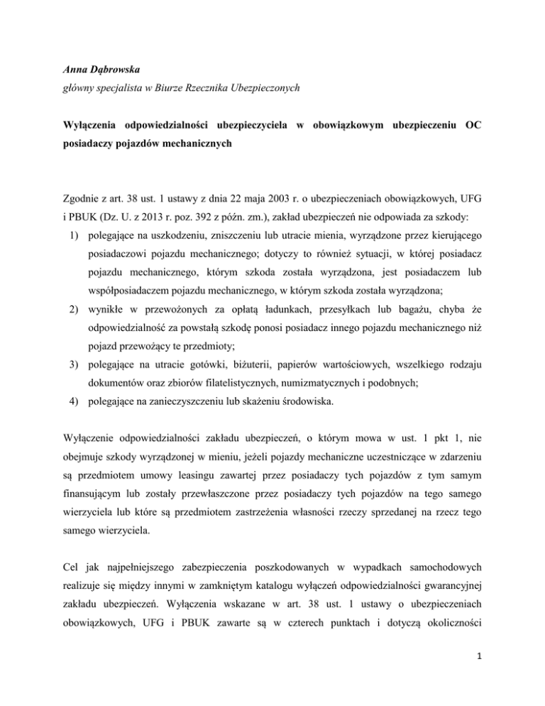 Anna Dąbrowska główny specjalista w Biurze Rzecznika Ubezpieczonych Wyłączenia odpowiedzialności ubezpieczyciela w obowiązkowym ubezpieczeniu OC posiadaczy pojazdów mechanicznych Zgodnie z art. 38 ust. 1 ustawy z dnia 22 maja 2003 r. o ubezpieczeniach obowiązkowych, UFG i PBUK (Dz. U. z 2013 r. poz. 392 z późn. zm.), zakład ubezpieczeń nie odpowiada za szkody: 1) polegające na uszkodzeniu, zniszczeniu lub utracie mienia, wyrządzone przez kierującego posiadaczowi pojazdu mechanicznego; dotyczy to również sytuacji, w której posiadacz pojazdu mechanicznego, którym szkoda została wyrządzona, jest posiadaczem lub współposiadaczem pojazdu mechanicznego, w którym szkoda została wyrządzona; 2) wynikłe w przewożonych za opłatą ładunkach, przesyłkach lub bagażu, chyba że odpowiedzialność za powstałą szkodę ponosi posiadacz innego pojazdu mechanicznego niż pojazd przewożący te przedmioty; 3) polegające na utracie gotówki, biżuterii, papierów wartościowych, wszelkiego rodzaju dokumentów oraz zbiorów filatelistycznych, numizmatycznych i podobnych; 4) polegające na zanieczyszczeniu lub skażeniu środowiska. Wyłączenie odpowiedzialności zakładu ubezpieczeń, o którym mowa w ust. 1 pkt 1, nie obejmuje szkody wyrządzonej w mieniu, jeżeli pojazdy mechaniczne uczestniczące w zdarzeniu są przedmiotem umowy leasingu zawartej przez posiadaczy tych pojazdów z tym samym finansującym lub zostały przewłaszczone przez posiadaczy tych pojazdów na tego samego wierzyciela lub które są przedmiotem zastrzeżenia własności rzeczy sprzedanej na rzecz tego samego wierzyciela. Cel jak najpełniejszego zabezpieczenia poszkodowanych w wypadkach samochodowych realizuje się między innymi w zamkniętym katalogu wyłączeń odpowiedzialności gwarancyjnej zakładu ubezpieczeń. Wyłączenia wskazane w art. 38 ust. 1 ustawy o ubezpieczeniach obowiązkowych, UFG i PBUK zawarte są w czterech punktach i dotyczą okoliczności 1 specyficznych dla ubezpieczenia OC posiadaczy pojazdów mechanicznych. Ochrona ubezpieczeniowa doznaje ograniczenia w przypadku szkód na mieniu należącym do posiadacza pojazdu. Wyłączone z zakresu odpowiedzialności ubezpieczyciela są również szkody w odpłatnie przewożonych przesyłkach lub bagażach. Odpowiedzialność za takie szkody ma bowiem charakter kontraktowy. Zakres ochrony ubezpieczeniowej nie obejmuje ponadto szkód wysokiego ryzyka, a mianowicie utraty drogocennego mienia. Wreszcie zakład ubezpieczeń nie odpowiada, gdy szkoda polega na zanieczyszczeniu lub skażeniu środowiska. Ochrona poszkodowanego w obowiązkowym ubezpieczeniu OC posiadaczy pojazdów mechanicznych jest priorytetem. Ustawa o ubezpieczeniach obowiązkowych, UFG i PBUK nie przewiduje wyłączenia odpowiedzialności zakładu ubezpieczeń w razie umyślnego wyrządzenia szkody przez ubezpieczonego. Gdy posiadacz lub kierowca pojazdu spowodują wypadek samochodowy, działając umyślnie, zakład ubezpieczeń nie jest wolny od odpowiedzialności gwarancyjnej. Ochroną ubezpieczeniową jest również objęta odpowiedzialność za szkody wyrządzone ruchem pojazdu kierowanego przez osobę nieposiadającą uprawnień lub będącą w stanie po spożyciu alkoholu lub w stanie nietrzeźwości albo po użyciu środków odurzających, substancji psychotropowych lub środków zastępczych w rozumieniu przepisów o przeciwdziałaniu narkomanii. Poszkodowany otrzyma również odszkodowanie, gdy kierujący pojazdem wszedł w posiadanie pojazdu wskutek popełnienia przestępstwa, czy też zbiegł z miejsca zdarzenia. W takich sytuacjach jednak ubezpieczycielowi przysługuje przeciwko sprawcy roszczenie zwrotne. Brak odpowiedzialności za szkody polegające na uszkodzeniu, zniszczeniu lub utracie mienia, wyrządzone przez kierującego posiadaczowi pojazdu mechanicznego Wyłączenie ochrony ubezpieczeniowej w okolicznościach wskazanych w art. 38 ust. 1 pkt 1 ustawy o ubezpieczeniach obowiązkowych, UFG i PBUK wzbudzało sporo wątpliwości. Przepis ten przewiduje, że zakład ubezpieczeń nie odpowiada za szkody polegające na uszkodzeniu, zniszczeniu lub utracie mienia, wyrządzone przez kierującego posiadaczowi pojazdu mechanicznego; dotyczy to również sytuacji, w której posiadacz pojazdu mechanicznego, którym szkoda została wyrządzona, jest posiadaczem lub współposiadaczem pojazdu mechanicznego, 2 w którym szkoda została wyrządzona. Z pozoru mogłoby się wydawać, iż chodziło tutaj o wyłączenie odpowiedzialności za szkody wyrządzone „samemu sobie”, jednakże wyłączenie to jest znacznie szersze. Odpowiedzialność ubezpieczyciela nie obejmuje sytuacji, w której kierujący wyrządzi szkodę posiadaczowi pojazdu. Ubezpieczyciel nie wypłaci odszkodowania także w przypadku, gdy posiadaniem tego samego posiadacza objęte będą obydwa uczestniczące w kolizji pojazdy. Przepis wyłącza zatem ochronę ubezpieczeniową, np. gdy pracownik kierując pojazdem swojego pracodawcy, uszkodzi inny pojazd należący do niego. Przepis zawarty w art. 38 ust. 1 pkt 1 ustawy o ubezpieczeniach obowiązkowych, UFG i PBUK nie rozróżnia sytuacji, w której współwystępuje posiadanie samoistne oraz zależne pojazdu. Powstaje zatem pytanie, czy zachodzi odpowiedzialność ubezpieczyciela, gdy przykładowo osoba, która jest samoistnym posiadaczem pojazdu mechanicznego wyrządzi tym pojazdem szkodę w innym pojeździe najmowanym przez tę osobę, będącym jednak własnością osoby trzeciej. Literalne brzmienie przepisu w praktyce powoduje, że w takich okolicznościach właściciel wynajmowanego pojazdu ma problemy z uzyskaniem odszkodowania. W tym miejscu warto zatrzymać się nad treścią art. 38 ust. 2 ustawy o ubezpieczeniach obowiązkowych, UFG i PBUK, który przewiduje wyjątek od zasady określonej w ust. 1 pkt 1, wyłączając jej stosowanie w odniesieniu do szkody wyrządzonej w mieniu w sytuacji, kiedy pojazdy mechaniczne uczestniczące w zdarz