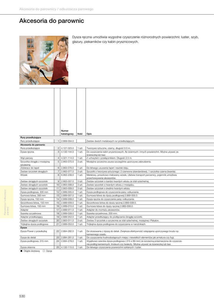 Akcesoria do parownicy / odkurzacza parowego Akcesoria do parownic Dysza ręczna umożliwia wygodne czyszczenie różnorodnych powierzchni: luster, szyb, glazury, piekarników czy kabin prysznicowych. Numer katalogowy Ilość Opis Rury przedłużające Rury przedłużające 1 2.889-004.0 Zestaw dwóch metalowych rur przedłużających. Parownica / odkurzacz parowy Akcesoria do parownic Rura przedłużająca 2 4.127-023.0 1 szt. Tworzywo sztuczne, czarny, długość 0.5 m. Dysza ręczna 3 4.130-144.0 1 szt. Wąż parowy 4 4.321-114.0 1 szt. Do czyszczenia kabin prysznicowych, fliz ściennych i innych powierzchni. Można używać ze ściereczką lub bez. Z uchwytem i przełącznikiem. Długość 2.5 m. Szczotka okrągła z mosiężną szczeciną Zdzieracz do tapet 5 2.863-075.0 3 szt. Mosiężna szczecina usuwa szczególnie uporczywe zabrudzenia. 6 2.863-076.0 1 szt. Do łatwego usuwania tapet i resztek kleju. Zestaw szczotek okrągłych 7 2.863-077.0 3 szt. Szczotki z tworzywa sztucznego: 2 czerwone (standardowe), 1 szczotka czarna (twarda). Wózek 8 6.962-239.0 1 szt. Zestaw okrągłych szczotek 9 2.863-007.0 3 szt. Metalowy, proszkowo malowany wózek. Ułatwia transport parownicy, pojemnik umożliwia przechowywanie akcesoriów. Zestaw szczotek o bardzo twardym włosiu ze stali szlachetnej. Zestaw okrągłych szczotek 10 2.863-008.0 3 szt. Zestaw szczotek o twardym włosiu z mosiądzu. Zestaw okrągłych szczotek 11 2.863-009.0 3 szt. Zestaw szczotek o średnio twardym włosiu Dysza podłogowa, 300 mm 12 2.889-005.0 1 szt. Dysza podłogowa do czyszczenia parą i odkurzania. Gumowa listwa, 300 mm 13 2.889-007.0 1 szt. Gumowa listwa do dyszy podłogowej 2.889-005.0. Dysza ręczna, 150 mm 14 2.889-008.0 1 szt. Dysza ręczna do czyszczenia parą i odkurzania. Szczotkowa listwa, 150 mm 15 2.889-009.0 1 szt. Szczotkowa listwa do dyszy ręcznej 2.889-008.0. Gumowa listwa, 150 mm 16 2.889-010.0 1 szt. Gumowa listwa do dyszy ręcznej 2.889-008.0. Adapter 17 2.889-011.0 1 szt. Adapter do montażu akcesoriów. Ssawka szczelinowa 18 2.889-028.0 1 szt. Ssawka szczelinowa, 200 mm. Adapter przedłużający 19 2.889-052.0 1 szt. Adapter przedłużający do podłączania okrągłej szczotki. Zestaw okrągłych szczotek 20 2.863-011.0 3 szt. Zestaw 3 szczotek o szczecinie ze stali szlachetnej, mosiężnej i Pekalon. Trójkątna dysza podłogowa 21 2.889-053.0 1 szt. Trójkątna dysza podłogowa do czyszczenia w narożnikach. Dysza Power z przedłużką 22 2.884-282.0 1 szt. Dysza do detali 23 2.884-281.0 1 szt. Do stosowania z dyszą do detali. Zwiększa efektywność odspajania uporczywego brudu np. kamiennego osadu. Do czyszczenia trudnodostępnych miejsc i niewielkich elementów jak armatura czy fugi. Dysza podłogowa, 315 mm 24 2.884-278.0 1 szt. Dysza okienna 25 4.130-115.0 1 szt. Dysze Objęte dostawą Opcja 530 Wyjątkowo szeroka dysza podłogowa ( 315 x 89 mm) ze szczeciną przeznaczona do czyszczenia podłóg kamiennych, linoleum czy terakoty. Można używać ze ściereczką lub bez. Do łatwego czyszczenia powierzchni szklanych i luster.