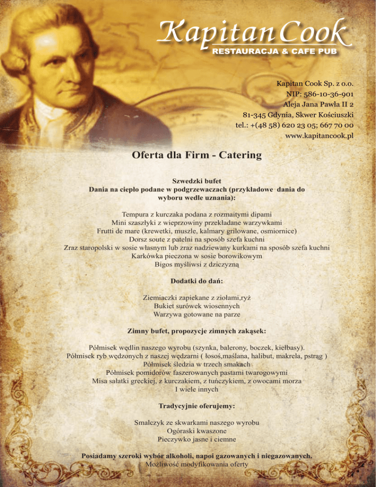 Kapitan Cook Sp. z o.o. NIP: 586-10-36-901 Aleja Jana Pawła II 2 81-345 Gdynia, Skwer Kościuszki tel.: +(48 58) 620 23 05; 667 70 00 www.kapitancook.pl Oferta dla Firm - Catering Szwedzki bufet Dania na ciepło podane w podgrzewaczach (przykładowe dania do wyboru wedle uznania): Tempura z kurczaka podana z rozmaitymi dipami Mini szaszłyki z wieprzowiny przekładane warzywkami Frutti de mare (krewetki, muszle, kalmary grilowane, osmiornice) Dorsz soute z patelni na sposób szefa kuchni Zraz staropolski w sosie własnym lub zraz nadziewany kurkami na sposób szefa kuchni Karkówka pieczona w sosie borowikowym Bigos myśliwsi z dziczyzną Dodatki do dań: Ziemiaczki zapiekane z ziołami,ryż Bukiet surówek wiosennych Warzywa gotowane na parze Zimny bufet, propozycje zimnych zakąsek: Półmisek wędlin naszego wyrobu (szynka, balerony, boczek, kiełbasy). Półmisek ryb wędzonych z naszej wędzarni ( łosoś,maślana, halibut, makrela, pstrąg ) Półmisek śledzia w trzech smakach Półmisek pomidorów faszerowanych pastami twarogowymi Misa sałatki greckiej, z kurczakiem, z tuńczykiem, z owocami morza I wiele innych Tradycyjnie oferujemy: Smalczyk ze skwarkami naszego wyrobu Ogóraski kwaszone Pieczywko jasne i ciemne Posiadamy szeroki wybór alkoholi, napoi gazowanych i niegazowanych. Możliwość modyfikowania oferty