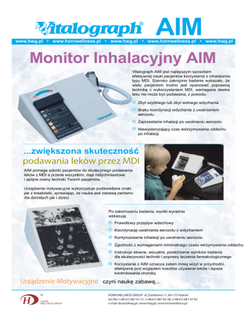 AIM www.hwg.pl • www.hornwellness.pl • www.hwg.pl • www.hornwellness.pl • www.hwg.pl Monitor Inhalacyjny AIM Vitalograph AIM jest najlepszym sposobem efektywnej nauki pacjentów korzystania z inhalatorów typu MDI. Szeroko zakrojone badanie wykazało, że wielu pacjentom trudno jest opanować poprawną technikę z wykorzystaniem MDI, wamagana dawka leku nie może być podawana, z powodu: A Zbyt szybkiego lub zbyt wolnego wdychania A Braku koordynacji wdychania z uwalnianiem aerozolu A Zaprzestanie inhalacji po uwolnieniu aerozolu A Niewystarczający czas wstrzymywania oddechu po inhalacji ...zwiększona skuteczność podawania leków przez MDI AIM pomaga szkolić pacjentów do skutecznego podawania leków z MDI a przede wszystkim, daje natychmiastowe i spójne oceny techniki Twoich pacjentów. Urządzenie motywacyjne wykorzystuje podświetlane znaki jak z kreskówki, sprawiając, że nauka jest zabawą zarówno dla dorosłych jak i dzieci. Po zakończeniu badania, wyniki wyraźnie wskazują: A Prawidłowy przepływ wdechowy A Koordynację uwalniania aerozolu z wdychaniem A Kontynuowanie inhalacji po uwolnieniu aerozolu A Zgodność z wymaganiami minimalnego czasu wtrzymywania oddechu A Instrukcje słowne, wizualne, powtórzenie wyników badania dla skuteczności techniki i poprawy leczenia farmakologicznego A Korzystanie z AIM oznacza zatem mniej wizyt w przychodni, efektywne pod względem kosztów używanie leków i lepsze kontrolowanie choroby Urządzenie Motywacyjne czyni naukę zabawą... HORN WELLNESS GROUP ul. Żonkilowa 11, 60-175 Poznań tel./fax (+48 61) 867 67 31, (+48 61) 867 65 58, (+48 61) 867 67 82 e-mail: [email protected], www.hwg.pl, www.hornwellness.pl Monitor Inhalacyjny AIM www.hwg.pl • www.hornwellness.pl • www.hwg.pl • www.hornwellness.pl • www.hwg.pl Cechy A A A A Poprawa techniki inhalacji przy użyciu obiektywnych środków Daje natychniastowe i zgodne oceny techniki Twoich pacjentów Łatwy w użyciu dla dzieci i dorosłych Prawidłowe podawanie leków A A A Mniej wizyt u lekarza i bardziej oszczędne używanie leków Urządzenie motywacyjne sprawia, że nauka staje się zabawą Higieniczny ustnik do korzystania tylko przez jednego pacjenta Dane Techniczne A A A A A A A A A Kryteria testu: . . . . . . . . . . . . . . . . . . . Przepływ wdechowy: Zielone światło zakres 10-50 L/m (idealnie 30L/m) Uwolnienie/dostarczenie: Zielone światło > 1.5s (iealnie > 3s) Czas wstrzymania oddechu: Zielone światło > 5s (idealnie > 10s) Standardy bezpieczeństwa: . . . . . . . . Certyfikat ISO EN60601 Zasilanie sieciowe: . . . .... . . . . . . . . . 110V~ + 10% 50/60Hz (USA) 230V~ + 10% 50/60Hz (EU) PowerSafe Output: . . . . . . . . . . . . . . . Nominal 10V DC at 750mA. N.B. only the Vitalograph PowerSafe must be used. Zasady wykrywania przepływu:. . . . . . Platinum Wire Anemometer Canister Operation Detection:. . . . . . . Gold Plated Contact Pins Oznaczenie skali przepływomierza: . .Dolny czerwony pasek < 10L/m, Tolerancja +/- 5L/m Zielony pasek 10 – 50 L/m, Tolerancja +/- 5L/m Górny czerwony pasek > 50 L/m, Tolerancja +/- 5L/m Zakres temperatury pracy: . . . . . . . .. .10ºC – 40ºC Dane fizyczne: . . . . . . . . . . . . . . . . . . . AIM Urządzenie motywacyjne Waga netto: 0.85 Kg 0.76 Kg Waga brutto: 1.84 Kg 1.7 Kg 200 x 190 x 90 mm 110 x 170 x 90 mm Wymiary netto (WxDxH): 310 x 360 x 150 mm Wymiary brutto (WxDxH): 230 x 330 x 170 mm Szczegóły zamówienia 45000............ 45500............ 45007............ 45020............ AIM (Monitor Inhalacyjny) Urządzenie Motywacyjne Głowica (wymieniać corocznie) Jednorazowe ustniki (100) 45027............ HFA Placebo Aerosol (16) 14002............ Half Day Training 14133 ........... Routine Annual Service - RTB HORN WELLNESS GROUP ul. Żonkilowa 11, 60-175 Poznań tel./fax (+48 61) 867 67 31, (+48 61) 867 65 58, (+48 61) 867 67 82 e-mail: [email protected], www.hwg.pl, www.hornwellness.pl