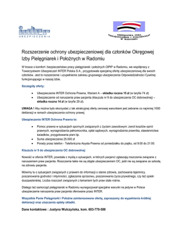 Rozszerzenie ochrony ubezpieczeniowej dla członków Okręgowej Izby Pielęgniarek i Położnych w Radomiu W trosce o komfort i bezpieczeństwo pracy pielęgniarek i położnych OIPiP w Radomiu, we współpracy z Towarzystwem Ubezpieczeń INTER Polska S.A., przygotowała specjalną ofertę ubezpieczeniową dla swoich członków. Jest to rozszerzenie i uzupełnienie zakresu grupowego ubezpieczenia Odpowiedzialności Cywilnej funkcjonującego w naszej Izbie. Szczegóły oferty: Ubezpieczenie INTER Ochrona Prawna, Wariant A – składka roczna 15 zł (w taryfie 74 zł) Ubezpieczenie od naruszenia praw pacjenta (klauzula nr 9 do ubezpieczenia OC dobrowolnej) – składka roczna 14 zł (w taryfie 29 zł). UWAGA ! Aby można było skorzystać z tak atrakcyjnej oferty cenowej warunkiem jest zebranie co najmniej 1000 deklaracji w ramach ubezpieczenia ochrony prawej. Ubezpieczenie INTER Ochrona Prawna to: Pomoc prawna w sytuacjach spornych związanych z życiem zawodowym: zwrot kosztów opinii prawnych, wynagrodzenia pełnomocnika, opłat sądowych, wynagrodzenia prawnika, stawiennictwa świadków, przygotowania pism itp. Suma ubezpieczenia 25.000 zł Porady przez telefon - Telefoniczna Asysta Prawna od poniedziałku do piątku, od 9:00 do 21:00. Klauzula nr 9 do ubezpieczenia OC dobrowolnej: Nowość w ofercie INTER, powstała z myślą o sytuacjach, w których pacjenci zgłaszają roszczenia związane z naruszeniem praw pacjenta. Roszczenia takie nie są objęte ubezpieczeniem OC, jeśli nie są związane ze szkodą na zdrowiu pacjenta. Mówimy tu o sytuacjach związanych z prawem do informacji o stanie zdrowia, zachowania tajemnicy, poszanowania godności i intymności, zgłaszania sprzeciwu, poszanowania życia prywatnego, czy też opieki duszpasterskiej. Liczba roszczeń związanych z łamaniem tych praw stale rośnie. Dlatego też samorząd pielęgniarski w Radomiu wynegocjował specjalne warunki na jedyne w Polsce ubezpieczenie naruszenia praw pacjenta oferowane przez INTER. Wszystkie Panie Pielęgniarki i Położne zainteresowane ofertą, zapraszamy do wypełnienia krótkiej deklaracji oraz uiszczenia opłaty składki. Dane kontaktowe : Justyna Wulczyńska, kom. 603-770-588