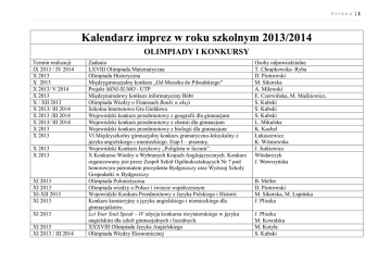 Strona |1 Kalendarz imprez w roku szkolnym 2013/2014 OLIMPIADY I KONKURSY Termin realizacji IX 2013 / IV 2014 X 2013 X 2013 X 2013/ V 2014 X 2013 X / XII 2013 X 2013/ III 2014 X 2013 /III 2014 X 2013/ III 2014 X 2013 X 2013 X 2013 X 2013 XI 2013 XI 2013 XI-XII 2013 XI 2013 XI 2013 XI 2013 XI 2013 / III 2014 Zadania LXVIII Olimpiada Matematyczna Olimpiada Historyczna Międzygimnazjalny konkurs „Od Mieszka do Piłsudskiego” Projekt MINI-SUMO - UTP Międzynarodowy konkurs informatyczny Bóbr Olimpiada Wiedzy o Finansach Banki w akcji Szkolna Internetowa Gra Giełdowa Wojewódzki konkurs przedmiotowy z geografii dla gimnazjum Wojewódzki konkurs przedmiotowy z chemii dla gimnazjum Wojewódzki konkurs przedmiotowy z biologii dla gimnazjum VI Międzyszkolny gimnazjalny konkurs gramatyczno-leksykalny z języka angielskiego i niemieckiego. Etap I – pisemny. Wojewódzki Konkurs Językowy „Poliglota w liceum”. X Konkursu Wiedzy o Wybranych Krajach Anglojęzycznych. Konkurs organizowany jest przez Zespół Szkół Ogólnokształcących Nr 7 pod honorowym patronatem prezydenta Bydgoszczy oraz Wyższej Szkoły Gospodarki w Bydgoszczy. Olimpiada Polonistyczna Olimpiada wiedzy o Polsce i świecie współczesnym Wojewódzki Konkurs Przedmiotowy z Języka Polskiego i Historii Konkurs kuratoryjny z języka angielskiego i niemieckiego dla gimnazjalistów. Let Your Soul Speak – IV edycja konkursu recytatorskiego w języku angielskim dla szkół gimnazjalnych i licealnych. XXXVIII Olimpiada Języka Angielskiego Olimpiada Wiedzy Ekonomicznej Osoby odpowiedzialne T. Chrapkowska- Ryba D. Piotrowski M. Sikorska A. Milewski E. Czerwińska, M. Maćkiewicz, S. Kubski S. Kubski S. Kubski L. Mikulska K. Kachel Łukaszewicz K. Wiśniewska J. Jurkiewicz Włodarczyk J. Wawrzyńska B. Meller D. Piotrowski M. Sikorska, M. Łapińska J. Pliszka J. Pliszka M. Kowalska M. Kutyła S. Kubski Strona |2 XII 2013 XII 2013 XII 2013 / IV 2014 XII 2013/ IV2014 I / III 2014 I / III 2014 I / III 2014 II / VI 2014 I 2014 I 2014 I 2014 II / III 2014 II 2014 II 2014 II 2014 II 2014 III 2014 III 2014 III 2014 III 2014 III 2014 III 2014 III 2014 III 2014 III 2014 III 2014 III 2014 III 2014 III 2014 „Nasz Tuwim” – konkurs recytatorski dla uczniów fordońskich gimnazjum VII Bałtycki Konkurs Języka Angielskiego Olimpiada Przedsiębiorczości Liga Zadaniowa VIII Olimpiada Matematyczna Wojewódzki Konkurs Matematyczny Wojewódzki Konkurs Fizyczny Fordoński Turniej Wiedzy Algorytmicznej IV Regionalny Konkurs Wiedzy o Zdrowiu Olimpiada Wiedzy Ekologicznej IV Międzyszkolny konkurs wiedzy o Bydgoszczy – I etap „Moje korzenie”- grant Olimpiada Medialna Wojewódzki Konkurs Matematyczny im. S. Banacha w Toruniu - finał Odkrywamy prawo humanitarne – VII edycja konkursu XV LO– etap szkolny II Kujawski Konkurs Języka Angielskiego – I etap V Debata Humanistyczna Ogólnopolski Konkurs Biblijny VI Międzyszkolny Konkurs Dziennikarski Międzynarodowy Dzień Teatru Licealny konkurs „Losy Polaków podczas II wojny światowej” Konkurs Matematyczny „Kangur” „Lwiątko 2014” Odkrywamy prawo humanitarne – VII edycja konkursu XV LO– etap rejonowy Zawody pierwszej pomocy dla szkół gimnazjalnych XXII Mistrzostwa Pierwszej Pomocy PCK – etap szkolny Międzyszkolny konkurs języka angielskiego i niemieckiego – II etap. VI Bałtycki Konkurs Języka Angielskiego IV Międzyszkolny konkurs wiedzy o Bydgoszczy – finał. K. Dziatkowiak, A. Steimann, A. Zglinicka M. Kutyła S. Kubski A. Topolińska, A. Wiśniewska A. Topolińska A. Topolińska M. Wiśniewska, A. Milewski A. Wiśniewska, M. Maćkiewicz, M. Książek M. Książek M. Kutyła, I. Włodarczyk M. Łapińska, R. Grzybowski M. Laskowski T. Chrapkowska-Ryba, S. Maciąg M. Kutyła M. Laskowski, E. Adamczyk R. Gontarczyk M. Laskowski E. Adamczyk M. Sikorska D. Klemensowicz, T. Chrapkowska-Ryba, M. Wiśniewska, A. Milewski S. Maciąg S. Maciąg S. Maciąg, K. Kachel, S. Kubski Łukaszewicz, K. Wiśniewska M. Kutyła M. Kutyła, I. Włodarczyk Strona |3 III 2014 IV 2014 IV 2014 IV 2014 IV 2014 IV 2014 IV 2014 IV 2014 IV 2014 IV 2014 IV 2014 V / VI 2014 V 2014 VI 2014 VI 2014 VI 2014 Multimedialny Przegląd Teatralny w języku angielskim Konkurs otwarty – dyktando ortograficzne o pióro dyrektora szkoły Ogólnopolski Konkurs Informatyczny TIK TAK Ogólnopolski konkurs informatyczny Grafkom Matematyczne Potyczki z Komputerem Odkrywamy prawo humanitarne – VII edycja konkursu XV LO– etap wojewódzki XXII Mistrzostwa Pierwszej Pomocy PCK – etap rejonowy „Pokaż nam język” konkurs językowy organizowany przez WSB w Bydgoszczy. Konkurs wiedzy o Janie Pawle II (międzygimnazjalny) II Kujawski Konkurs Języka Angielskiego – II etap Międzyszkolny Konkurs Historii Dyplomacji Konkurs o tytuł „Mistrza Kultury Politycznej” dla klas I, II i III Gimnazjum nr 53 i 54 MS Szkolny Konkurs Chemiczny „O tytuł najlepszego chemika szkoły dla liceum” Wojewódzki Konkurs Matematyczny im. M. Rejewskiego w I LO finał Szkolny Mistrz Sudoku, Szkolny Mistrz Logiki XXII Mistrzostwa Pierwszej Pomocy PCK – etap okręgowy J. Pliszka, J. Jurkiewicz E. Adamczyk E. Czerwińska E. Czerwińska E. Czerwińska, D. Klemensowicz S. Maciąg S. Maciąg, K. Kachel, S. Kubski M. Kutyła, I. Włodarczyk R. Gontarczyk M. Kutyła D. Piotrowski D. Piotrowski L. Mikulska T. Chrapkowska-Ryba A. Wiśniewska, D.Klemensowicz S. Maciąg, K. Kachel, S. Kubski Strona |4 IMPREZY SZKOLNE – INNE PRZEDSIĘWZIĘCIA Termin realizacji 20 IX 2013 IX-VI 2013 Zadania Uroczyste rozpoczęcie roku szkolnego 2013/2014 „Tydzień z klasą…” IX/X 2013 X 2013 X 2013 31 X 2013 XI/XII XI 2013 XI 2013 Szkolny Konkurs na plakat „Osobliwości przyrodnicze województwa kujawsko-pomorskiego” Dni Pierwszej Pomocy – Wyspa Młyńska X – lecie Grupy Pierwszej Pomocy Światowy Dzień Pierwszej Pomocy Młoda krew ratuje życie – promocja honorowego krwiodawstwa Przesiewowe badanie słuchu dla uczniów kla